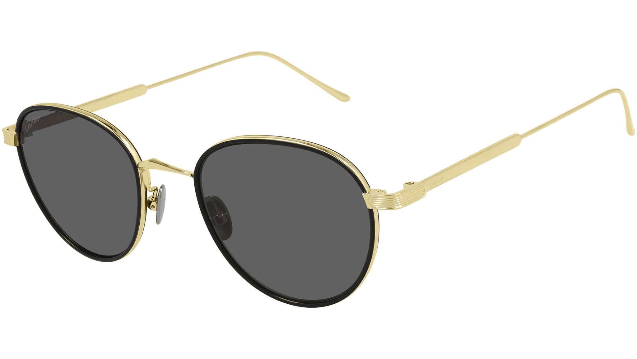 Cartier CT0250S 001 sunglasses with smooth golden frame and grey lens.