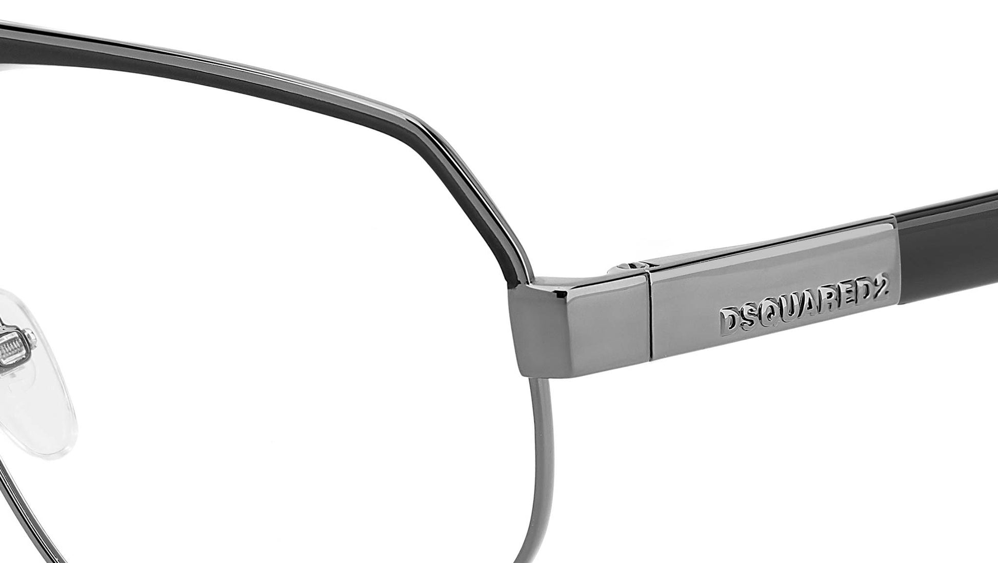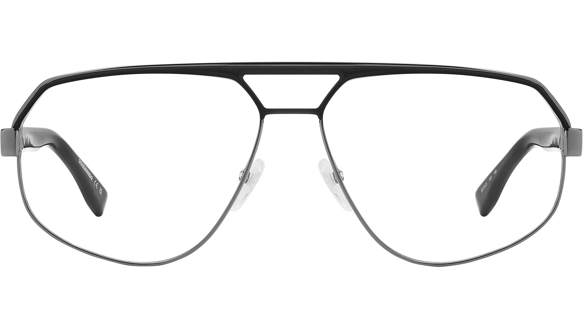 Montura óptica Dsquared2 modelo D2 0121 código de color V81 negro rutenio oscuro. Unas gafas de vista para hombre con una forma atrevida, como sólo DSQUARED2 puede hacerlo. A las monturas de aviador se les ha dado una actualización geométrica moderna, con una línea de cejas adornada con metal o esmalte para distinguir el doble puente. Las patillas son de metal y están adornadas con un logotipo DSQUARED2 en relieve y desplazado, completado por terminales largos de acetato con la icónica hoja de arce. Las almohadillas nasales ajustables y las bisagras flexibles integradas son características avanzadas para un ajuste personalizado. Revendedor en línea autorizado de Dsquared2. Tus gafas vendrán con el estuche y los accesorios originales y estarán cubiertas por una garantía global de 12 meses.
