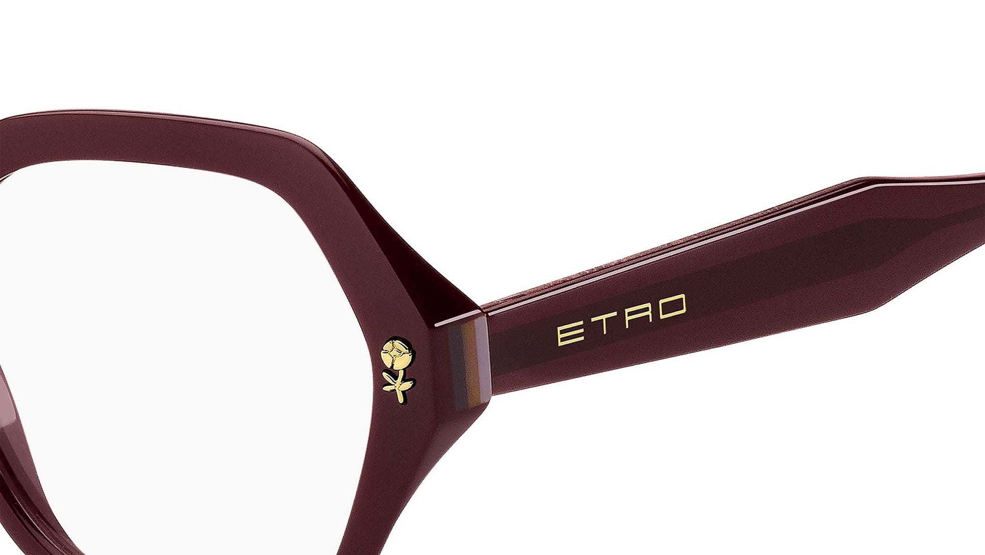 Montura óptica ETRO modelo 0012 código de color LHF burdeos. Un homenaje a las rayas y los motivos florales que se han convertido en sinónimos de la estética ecléctica de ETRO, la colección de gafas "Graphic Elegance" traduce los bordados y estampados icónicos de la Maison en monturas ópticas innovadoras. La atrevida montura de acetato con perfiles biselados está detallada con un ribete floral de metal precioso y una inserción de rayas multicolores en los laterales, mientras que un núcleo de alambre visible a través de las patillas transparentes añade un toque gráfico. Las icónicas puntas de acetato, diseñadas para recordar la simetría del logotipo de ETRO, completan estas gafas graduadas únicas. Distribuidor autorizado en línea de gafas ETRO. Tus gafas vendrán con el estuche y los accesorios originales y estarán cubiertas por una garantía global de 12 meses.