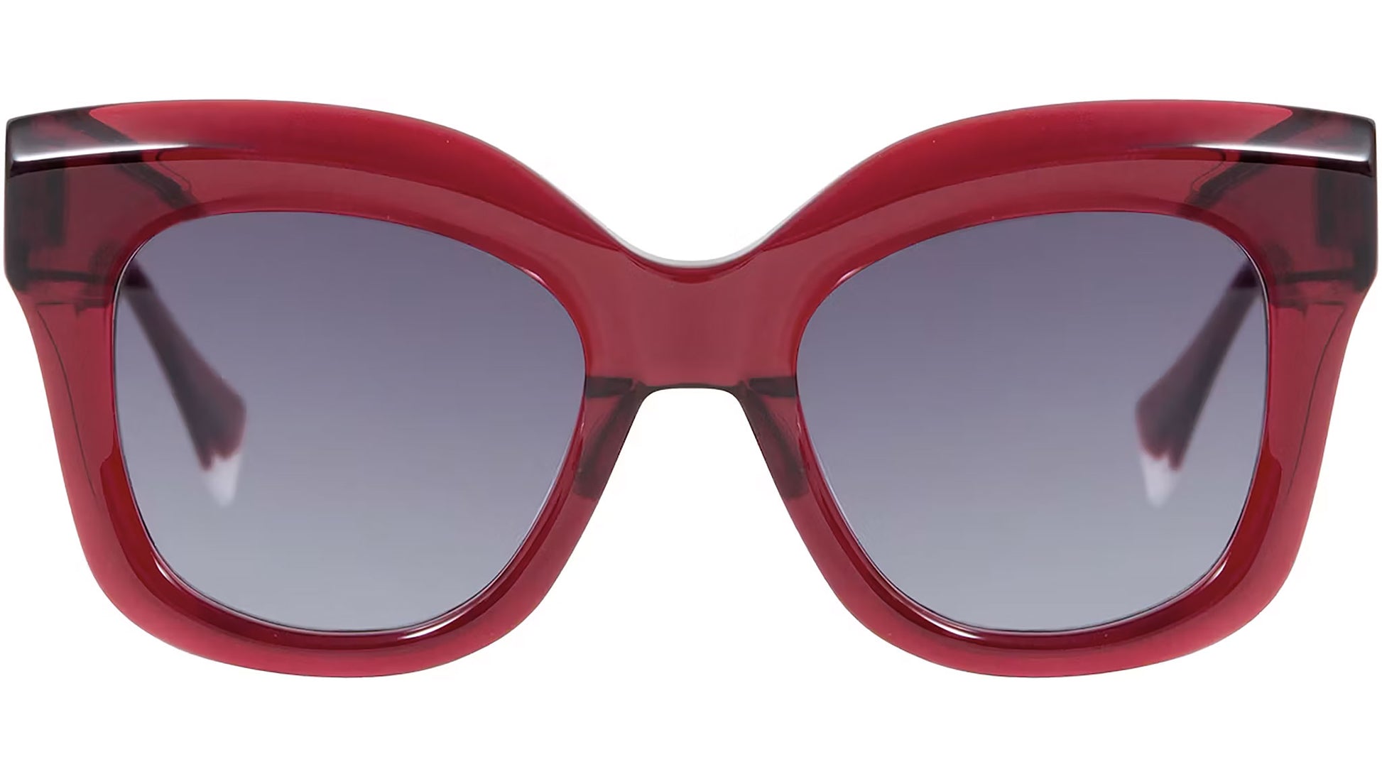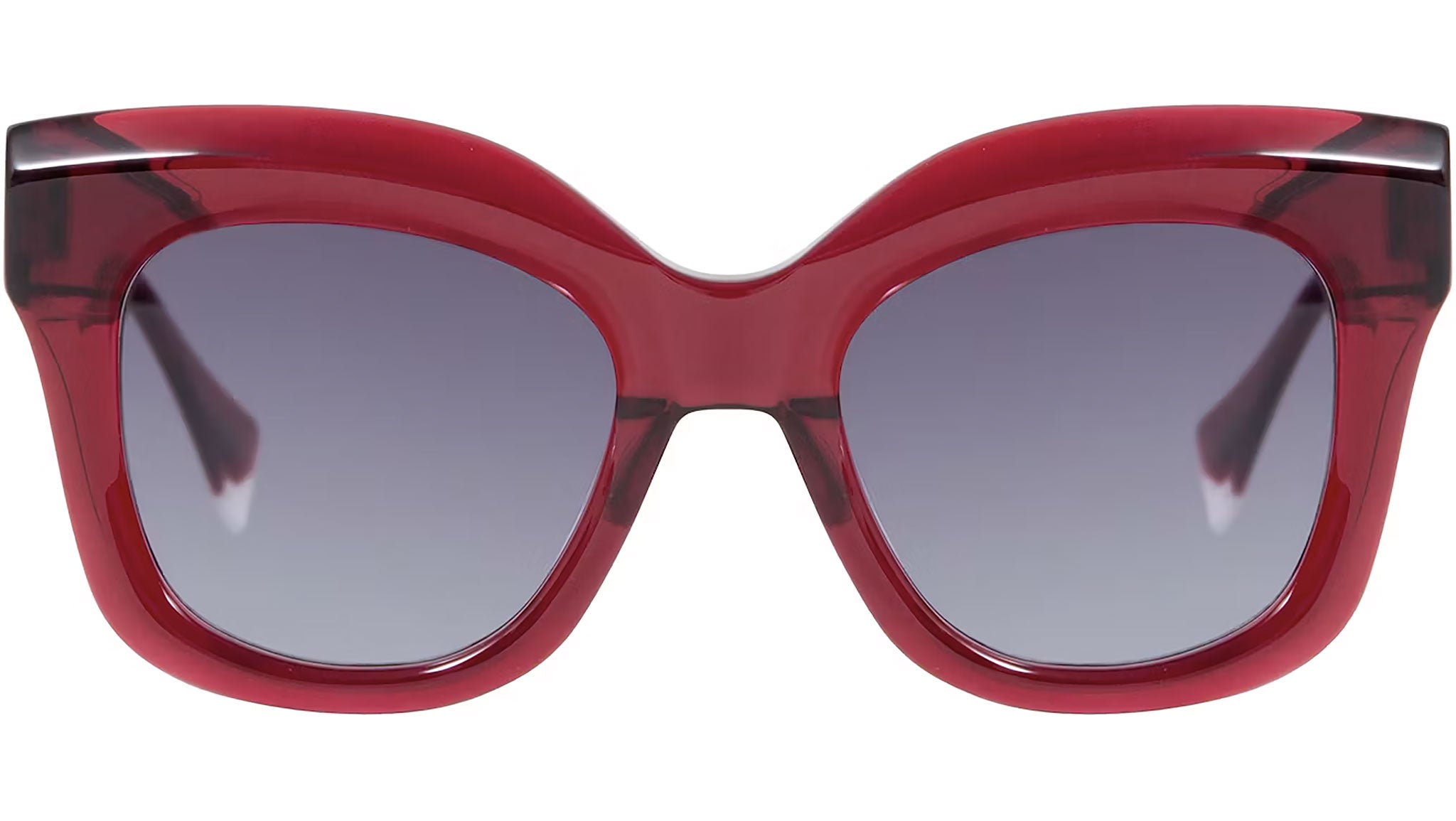 Gafas de sol Gigi Studios Eyewar modelo 6774 Gilda código de color 6 en rojo cereza. Unas gafas clásicas de acetato con montura completa tipo mariposa y lentes grises. La marca garantiza la más alta calidad a través de su meticulosa selección de materiales, asociándose con los mejores proveedores de Italia, Alemania y Japón. Gigi Studios brinda una experiencia visual excepcional con lentes CR-39 que son cómodas y seguras, y absorben eficazmente los rayos UVA y UVB.