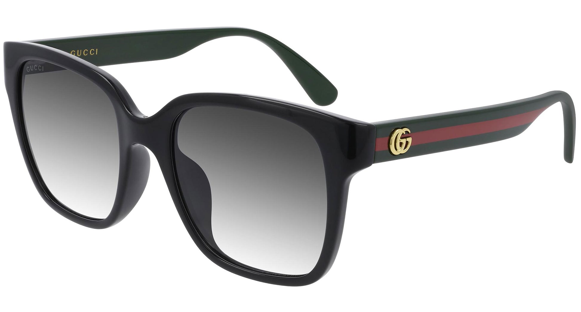Gafas de sol Gucci Web modelo GG0715SA montura rectangular de inyección código de color 001 negro brillante con patillas verdes y lentes grises degradados.