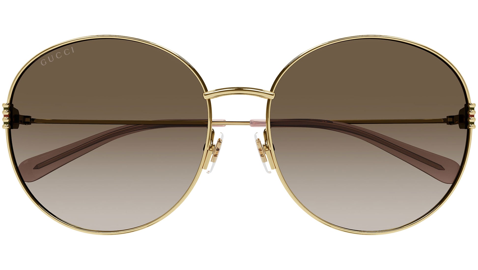 Gafas de sol con logo de Gucci modelo GG1281SK marco de metal panthos código de color 002 oro endura brillante con patillas doradas y lentes marrones degradados.