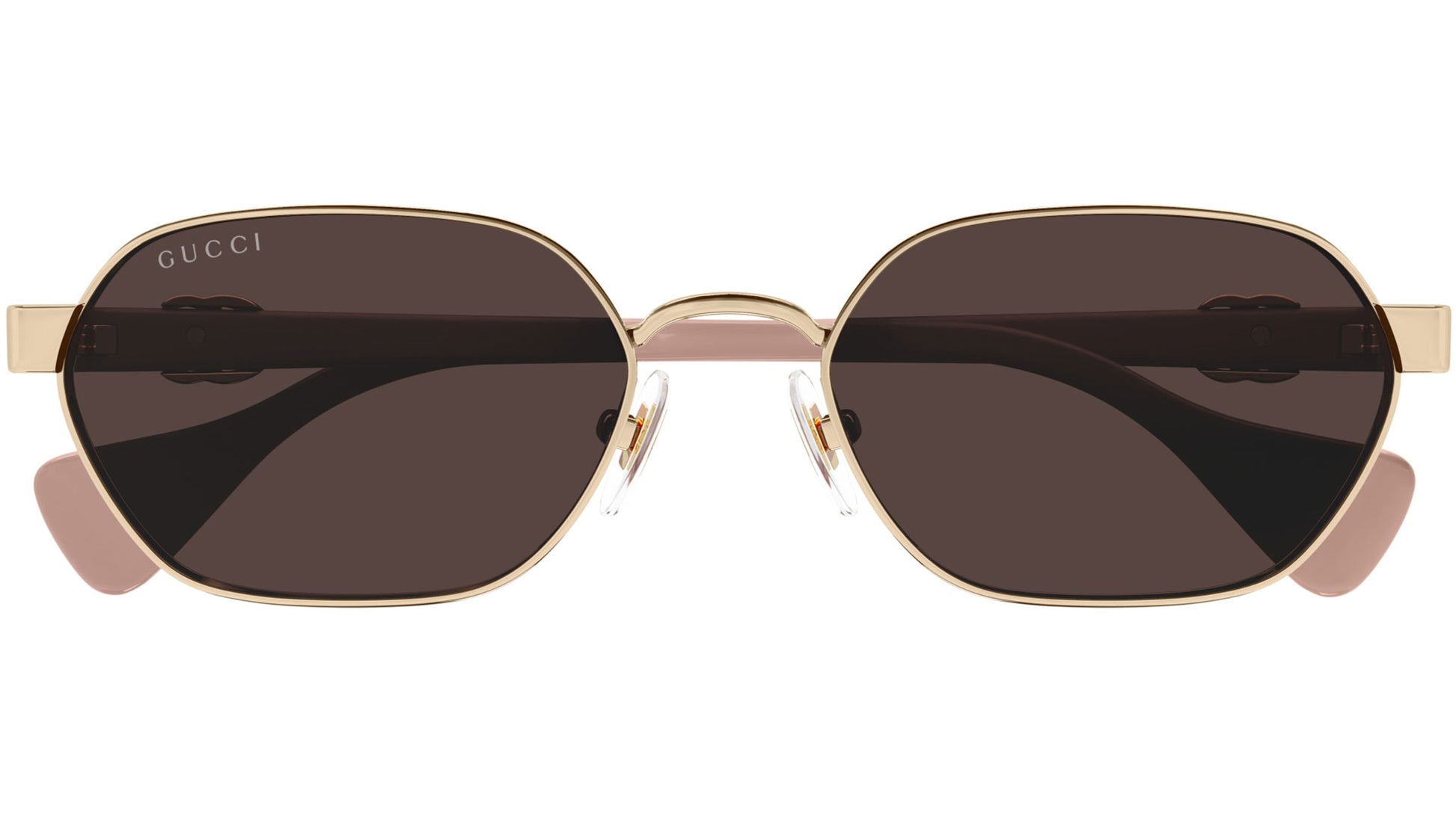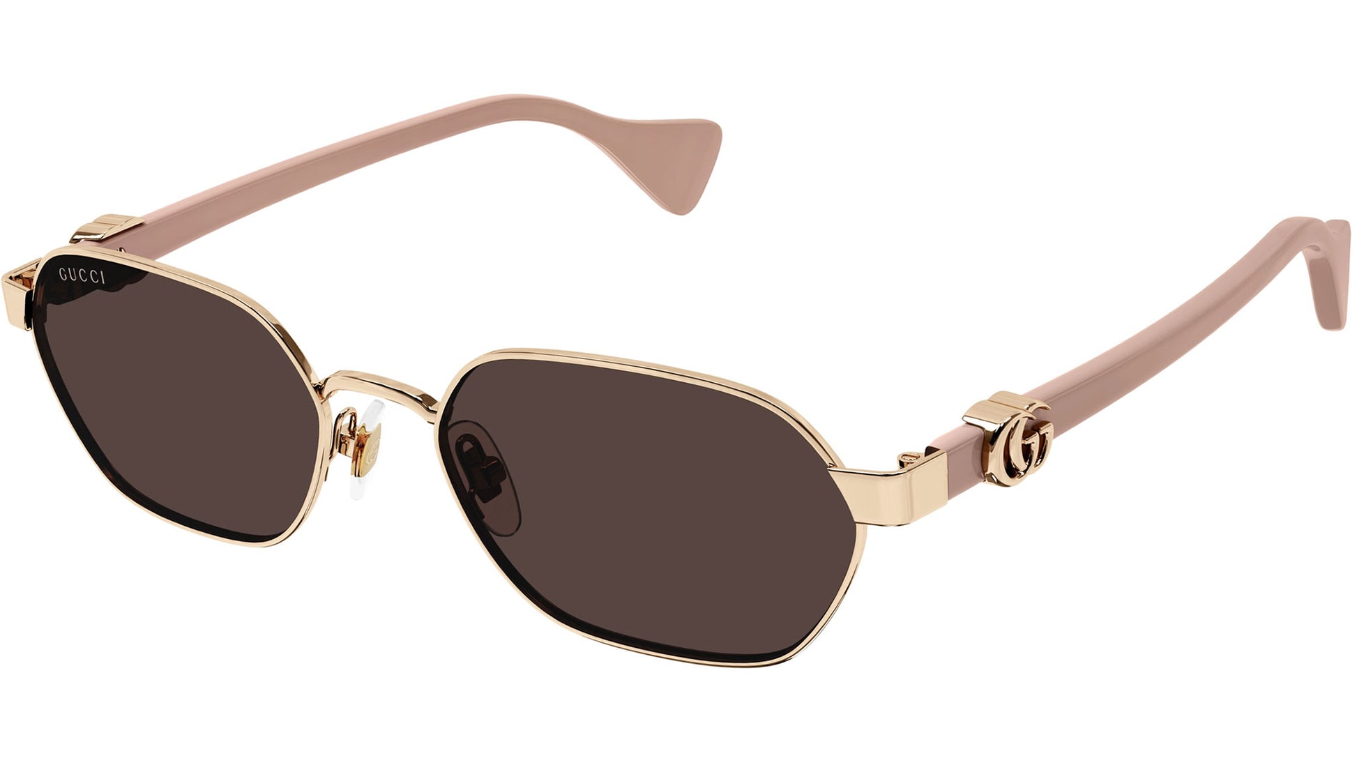 Gafas de sol Gucci GG Logo modelo GG1593S marco de metal panthos código de color 003 oro rosa brillante con varillas rosa y lentes violeta oscuro sólido.