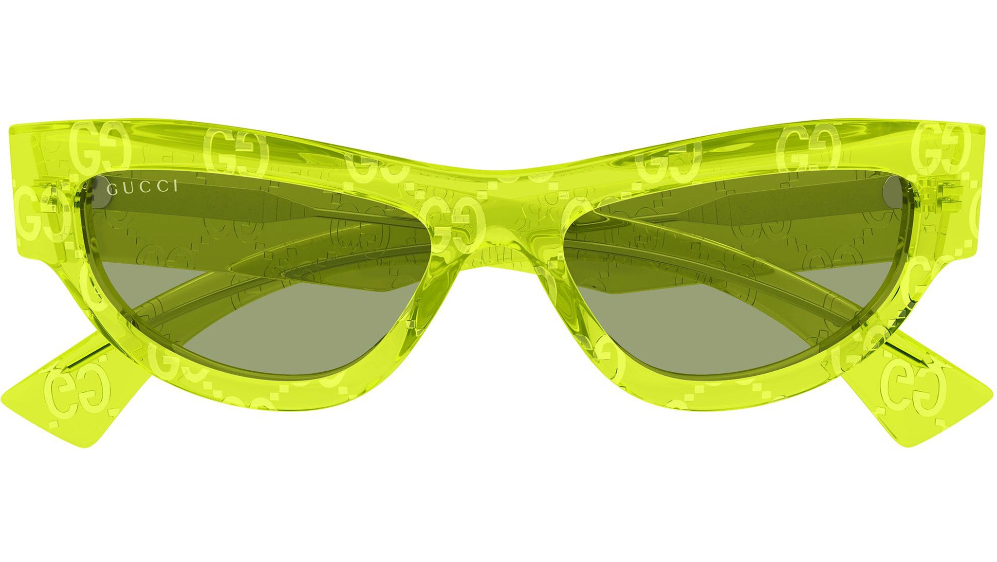 Gucci GG1834S 014 sunglasses for women, featuring shiny transparent neon acid green w/ Gucci pattern cat eye recycled acetate frame and solid green bio nylon lenses. Brand line: Name Of Brand. Style code: GG1834S. Color code: 014. Made in Italy. Authorized Gucci online reseller. Your glasses will include the original case and accessories and are covered by a 12-month global warranty.