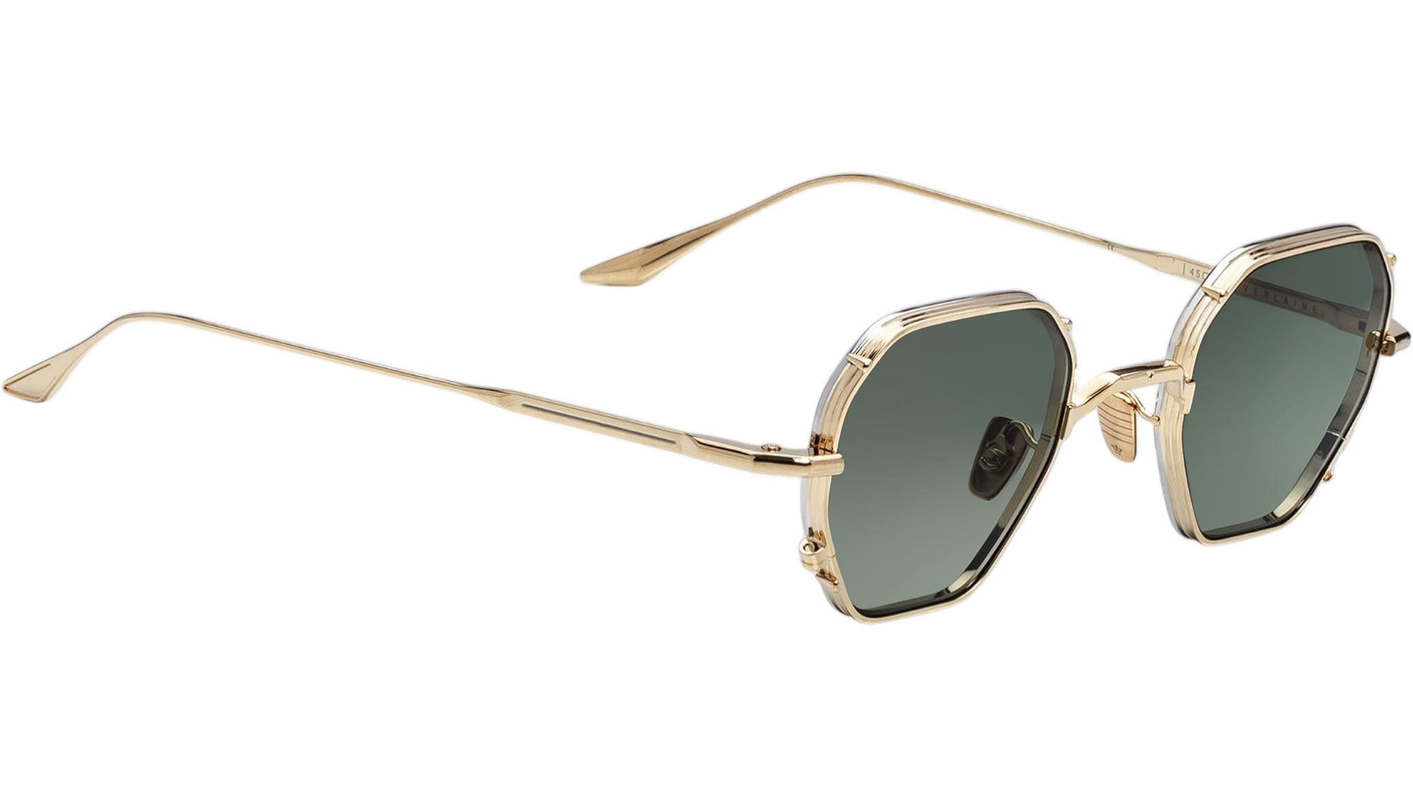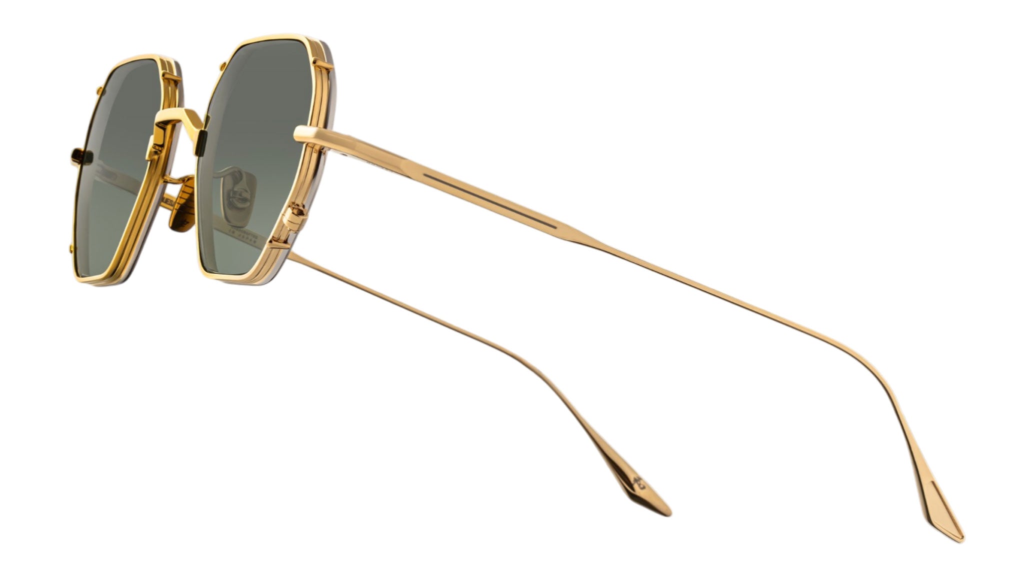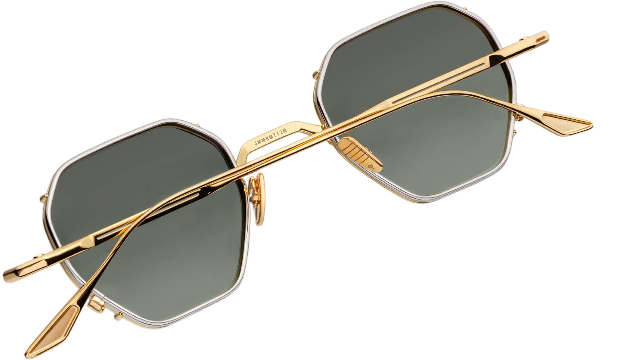 100% beta titanium spectacles in dark gold with silver palladium accents, complemented by Armorlite 2-base lenses in moss gradient with backside anti-reflective treatment, titanium nose bridge finished in dark gold, dark gold eye rims with double edges, back eyerim finished in silver palladium, top bar finished in silver palladium, monoblock hinges with hairline details.