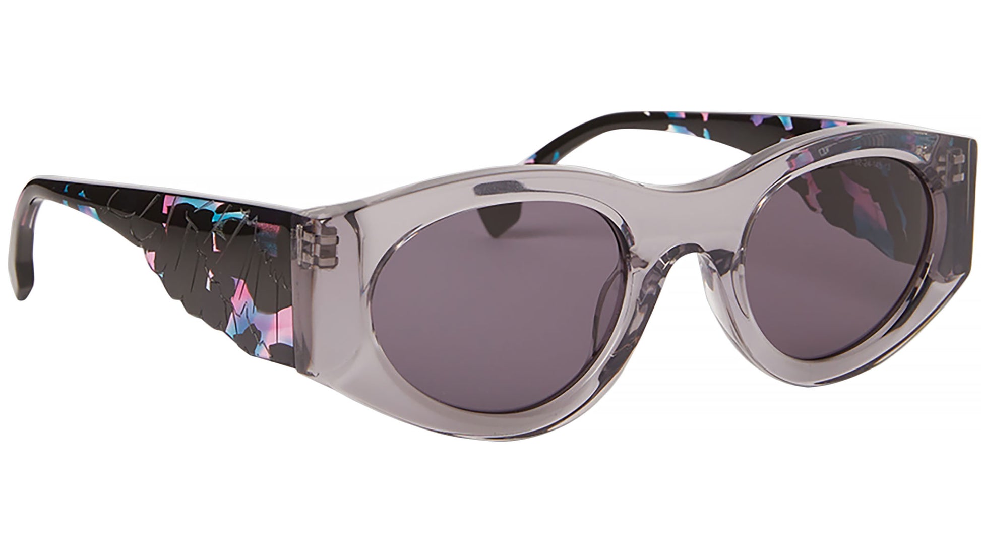 La Pasithea de Marcelo Burlon County de Milán es una montura geométrica de forma ovalada, con un aire escultórico que recuerda la escena de discotecas de principios de la década de 2000. Las patillas están unidas a la parte frontal a través de una bisagra recortada única para darle un toque poco convencional. La propuesta de color incluye dos opciones clásicas, blanco y negro, y dos divertidas, negro mármol con lentes azules y un sueño morado.