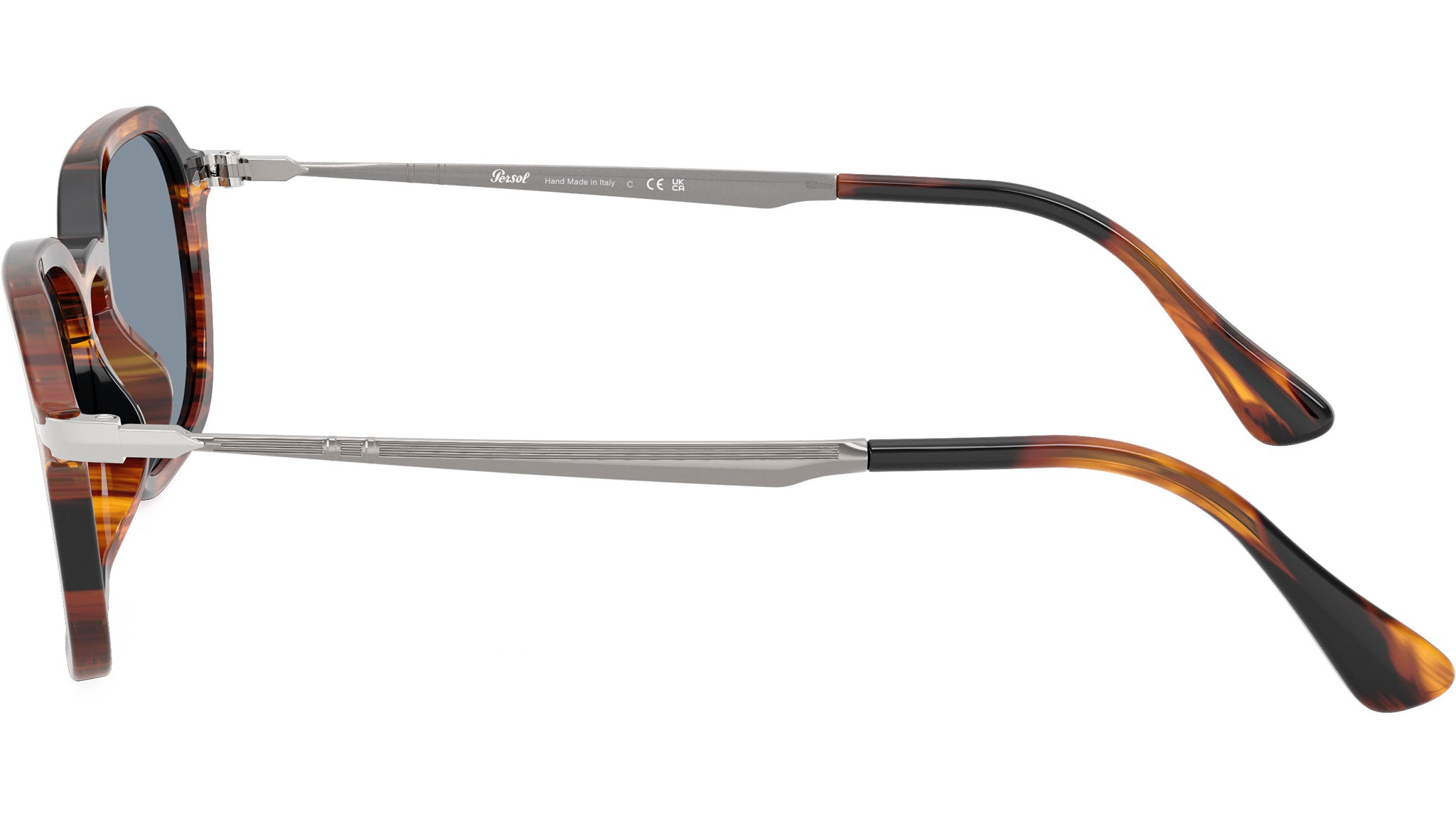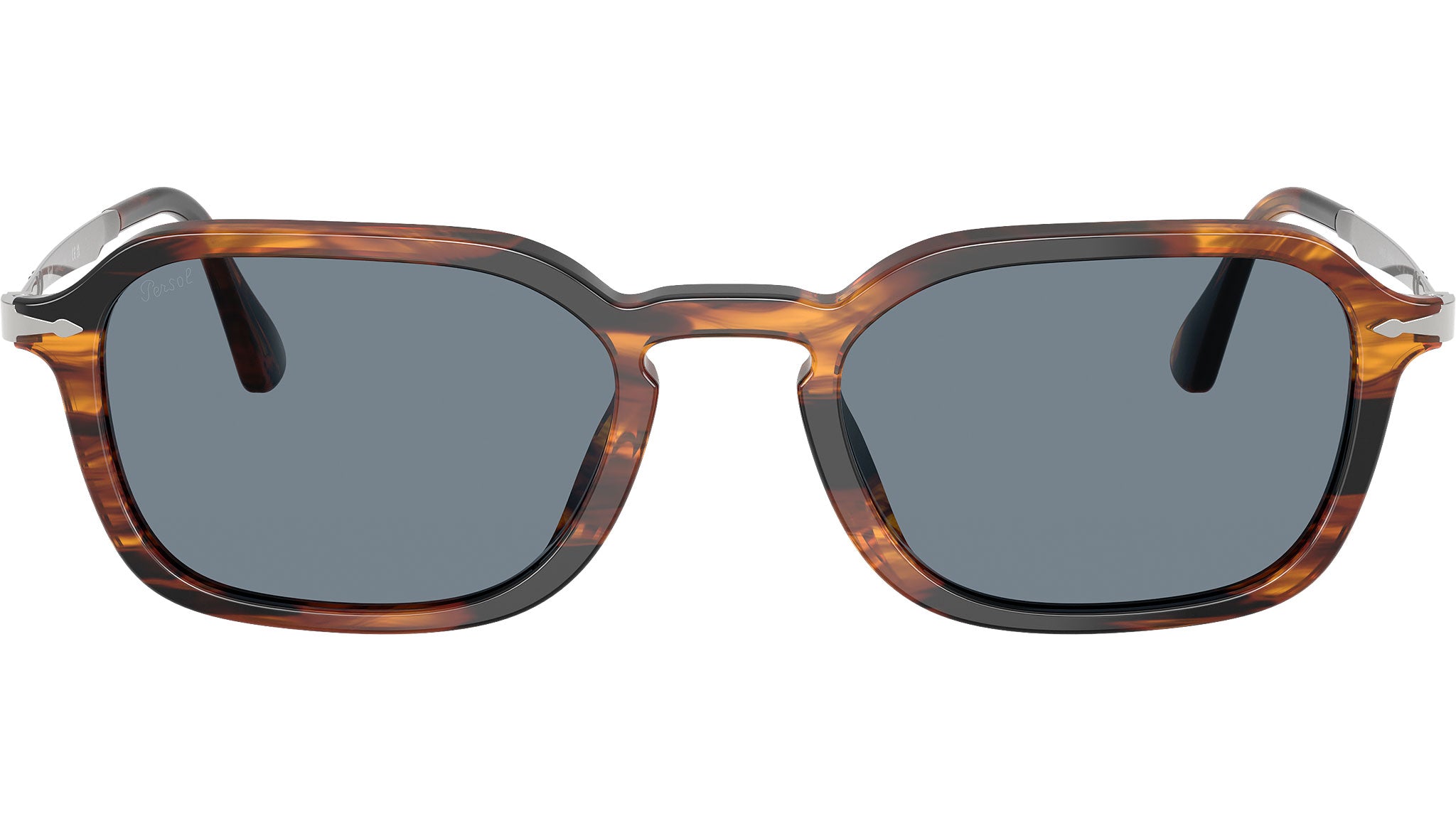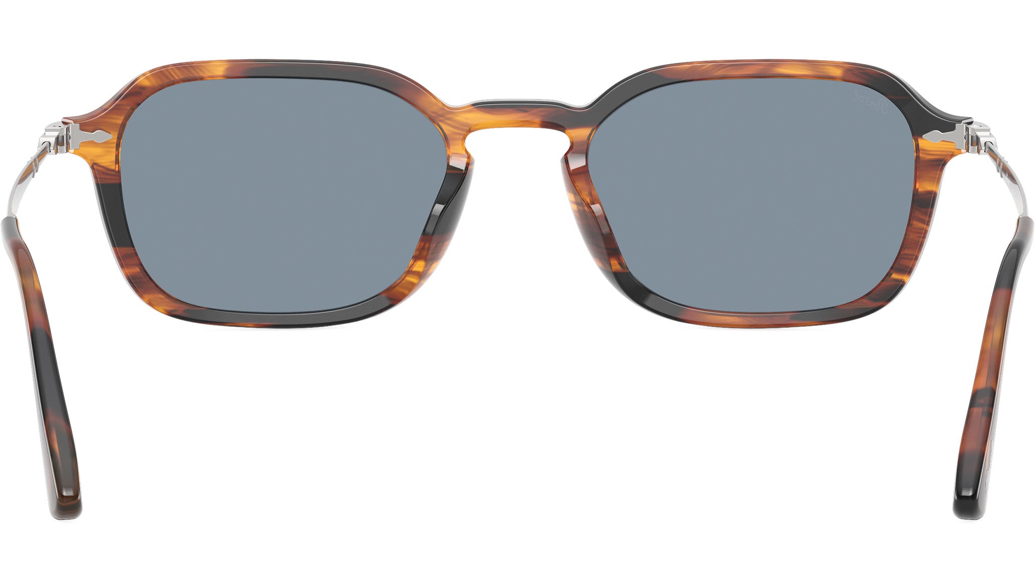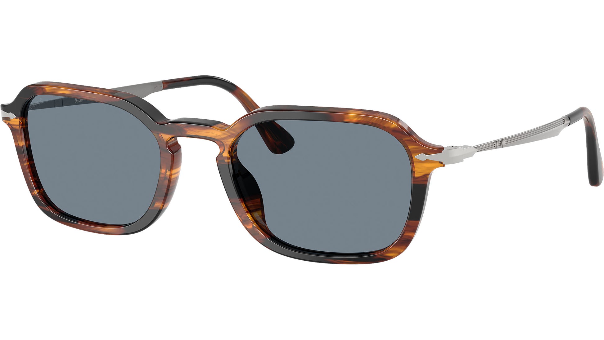 Persol sunglasses for men and woman model PO3381S 123556 featuring striped black & brown acetate frame and light blue base 4.25 glass lenses. High bridge fit. Frame line: Galleria. Brand code: 0PO3381S. Color code: 123556. Authorised Persol Eyewear Online Reseller. Your glasses will come including the original case and accessories and will be covered by 12 month global warranty.