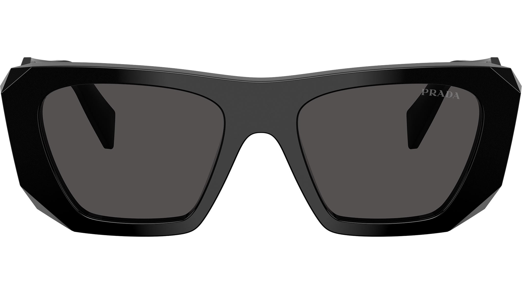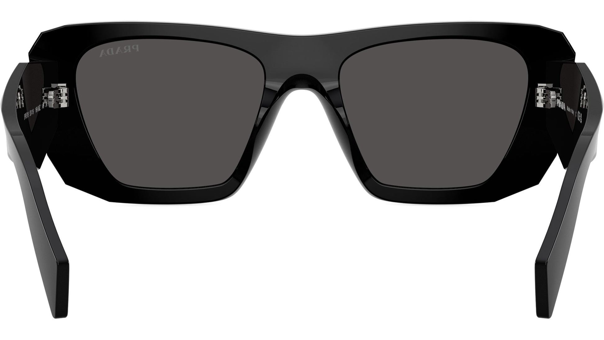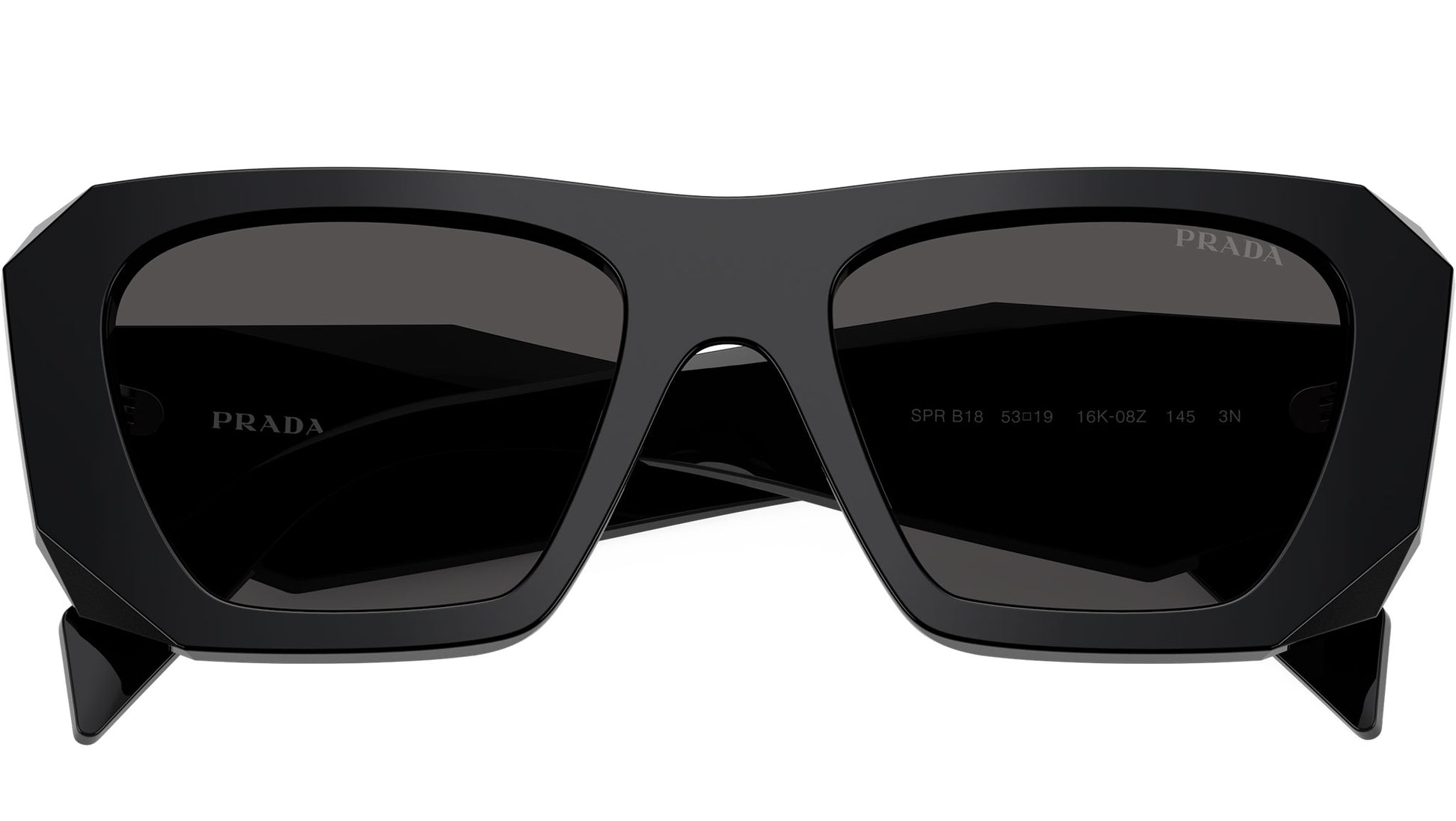 Prada PR B18S 16K08Z sunglasses for women, featuring black squared acetate frame and dark grey bio polyamide lenses. High bridge fit. Brand line: Design. Style code: PRB18S. Color code: 16K08Z. Made in Italy. Authorized Prada online reseller. Your glasses will include the original case and accessories and are covered by a 12-month global warranty.
