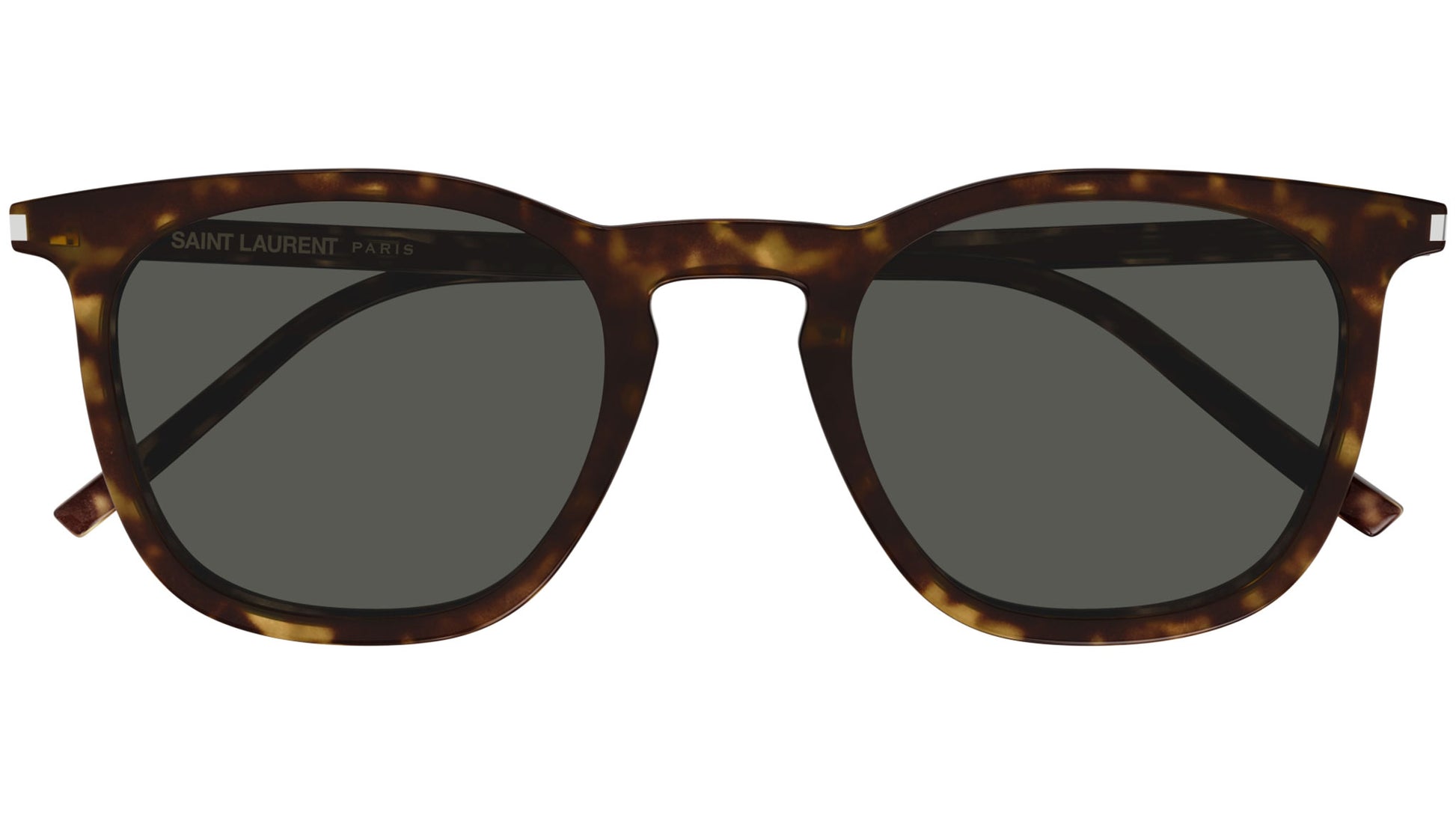 Gafas de sol Saint Laurent modelo SL 623 de la línea de gafas New Wave, código de color 002 acetato reciclado habana oscuro brillante, montura panthos con lentes gris sólido.