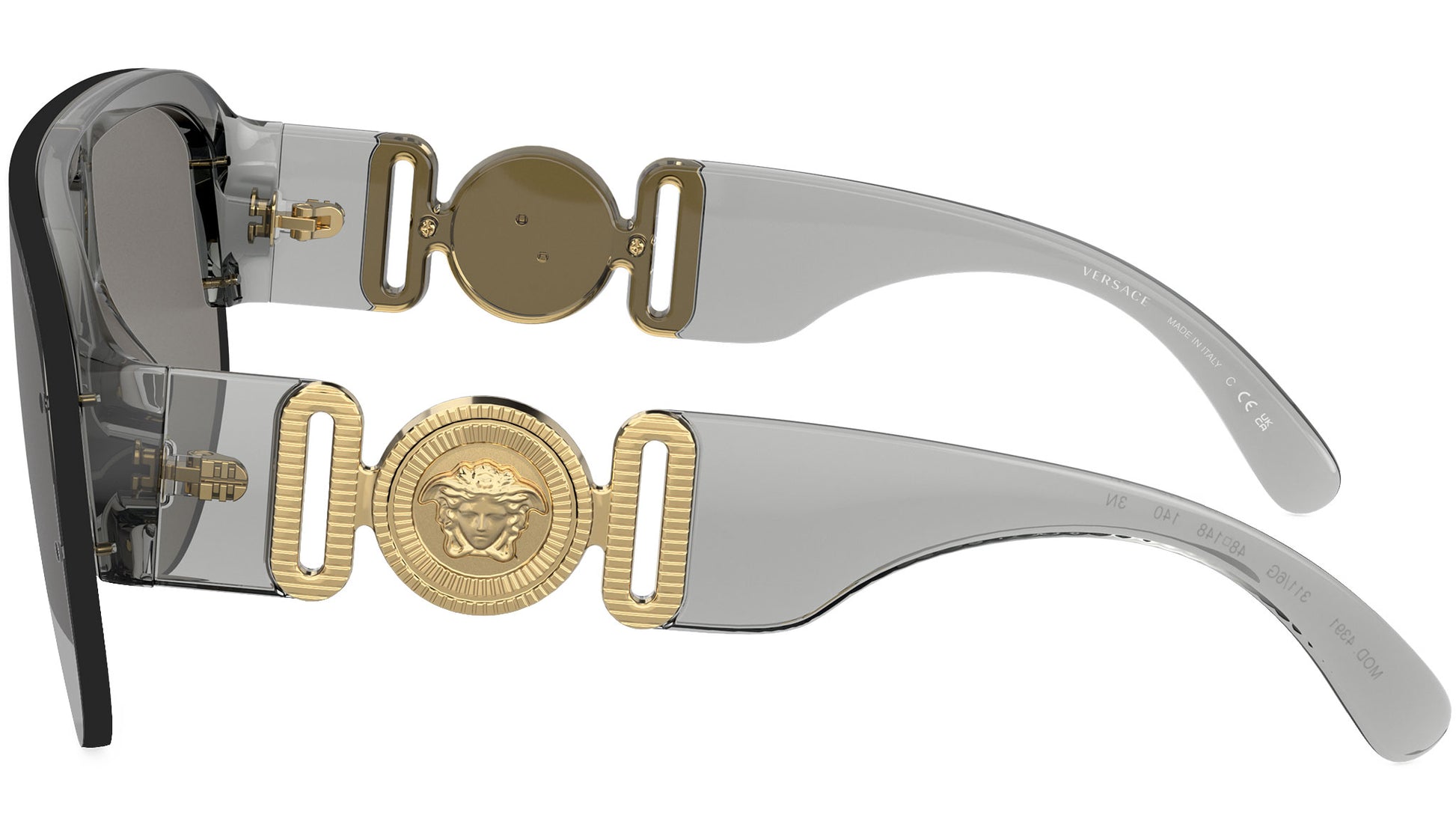 Colección de gafas de sol Versace modelo VE4391, variante de montura gris transparente, código de color 311/6G con lente plateada espejada gris claro. Versace es una de las casas de moda de lujo más emblemáticas y famosas del mundo. Orgullosamente italiano, está diseñado para hombres y mujeres que desean un estilo moderno y glamuroso que combine sofisticación y atractivo sexual. La Maison es el epítome del glamour sensual, sexy y empoderador: un verdadero símbolo del lujo italiano.
