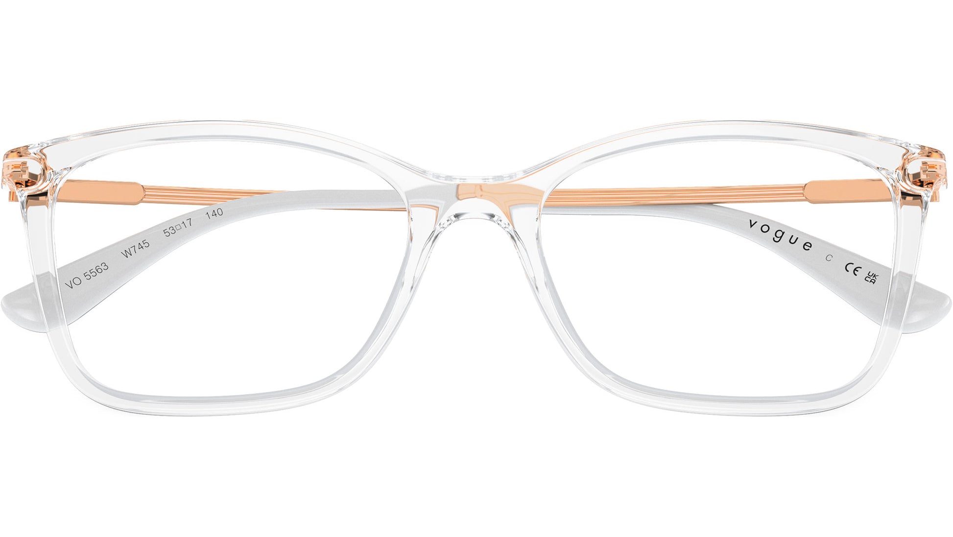 Gafas Vogue para mujer, modelo VO5563 W745, con montura de nailon transparente y lentes de muestra de base 4. Puente alto. Línea de montura: In Vogue. Código de marca: 0VO5563. Código de color: W745. Distribuidor autorizado en línea de Vogue Eyewear. Sus gafas incluyen el estuche y los accesorios originales, y cuentan con una garantía global de 12 meses.