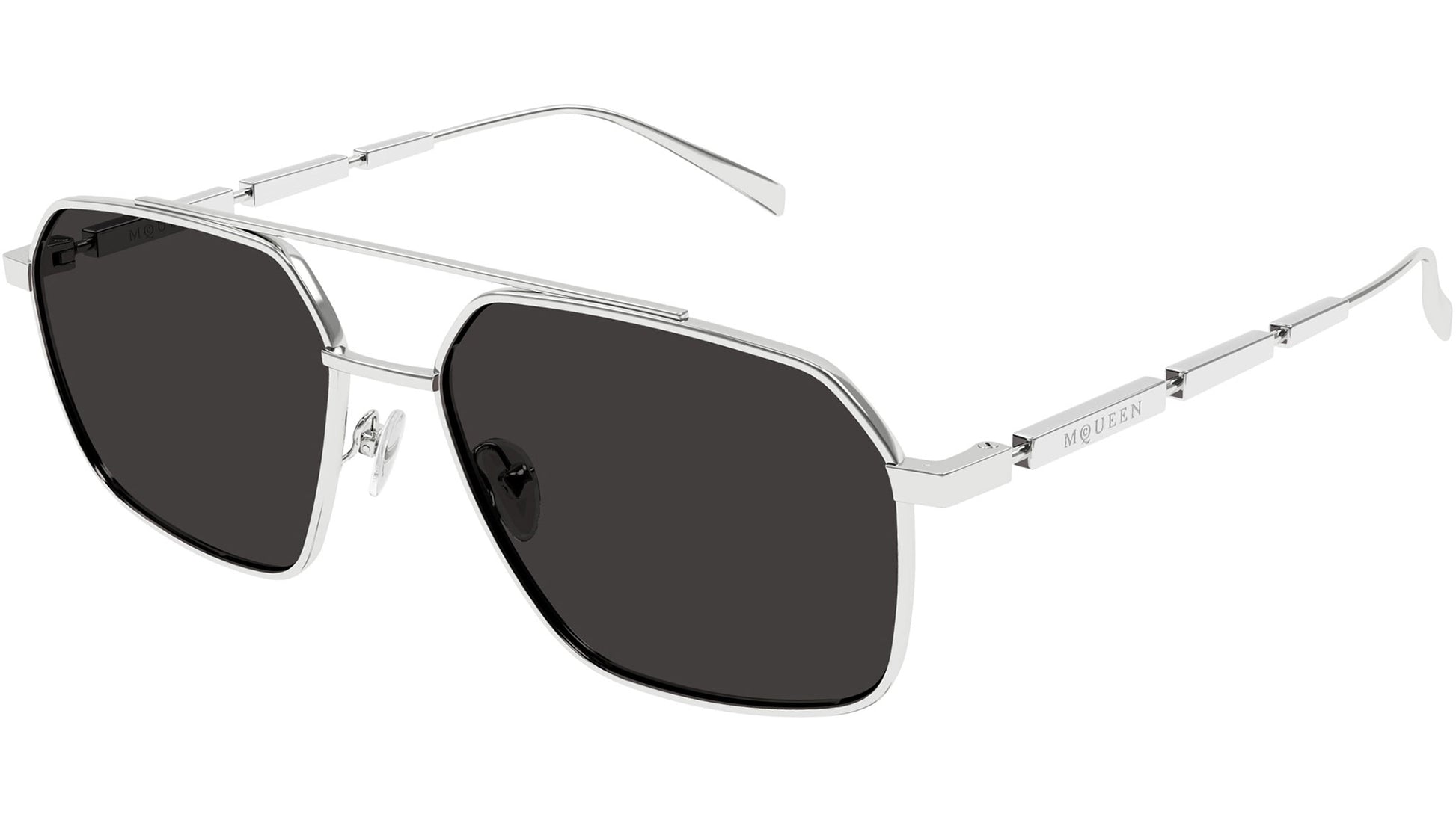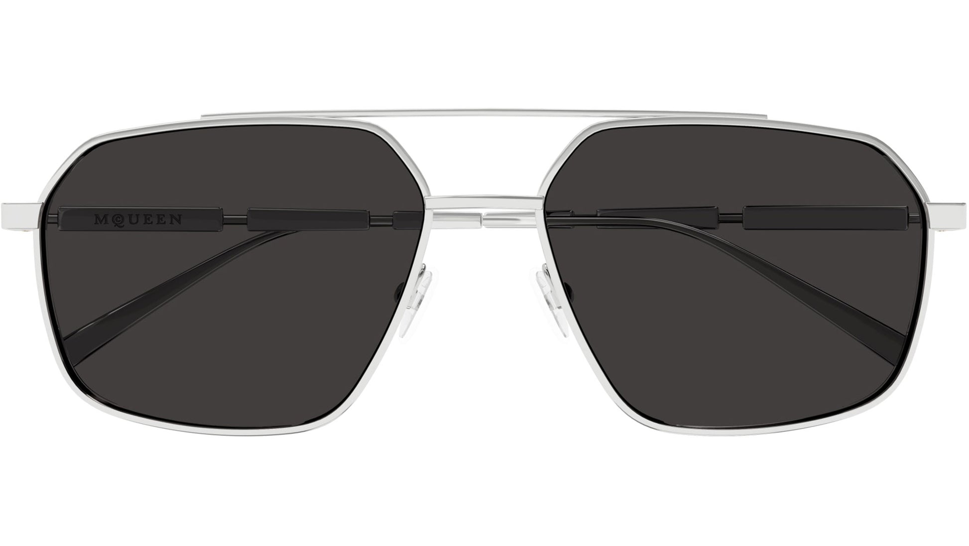 Gafas de sol de la línea Casual Lines de Alexander McQueen modelo AM0477S, montura de metal estilo aviador, código de color 001 con frente plateado brillante con patillas plateadas y lentes en color gris liso. Distribuidor online autorizado de Alexander McQueen. Tus gafas se entregarán con el estuche y los accesorios originales y estarán cubiertas por una garantía global de 12 meses.