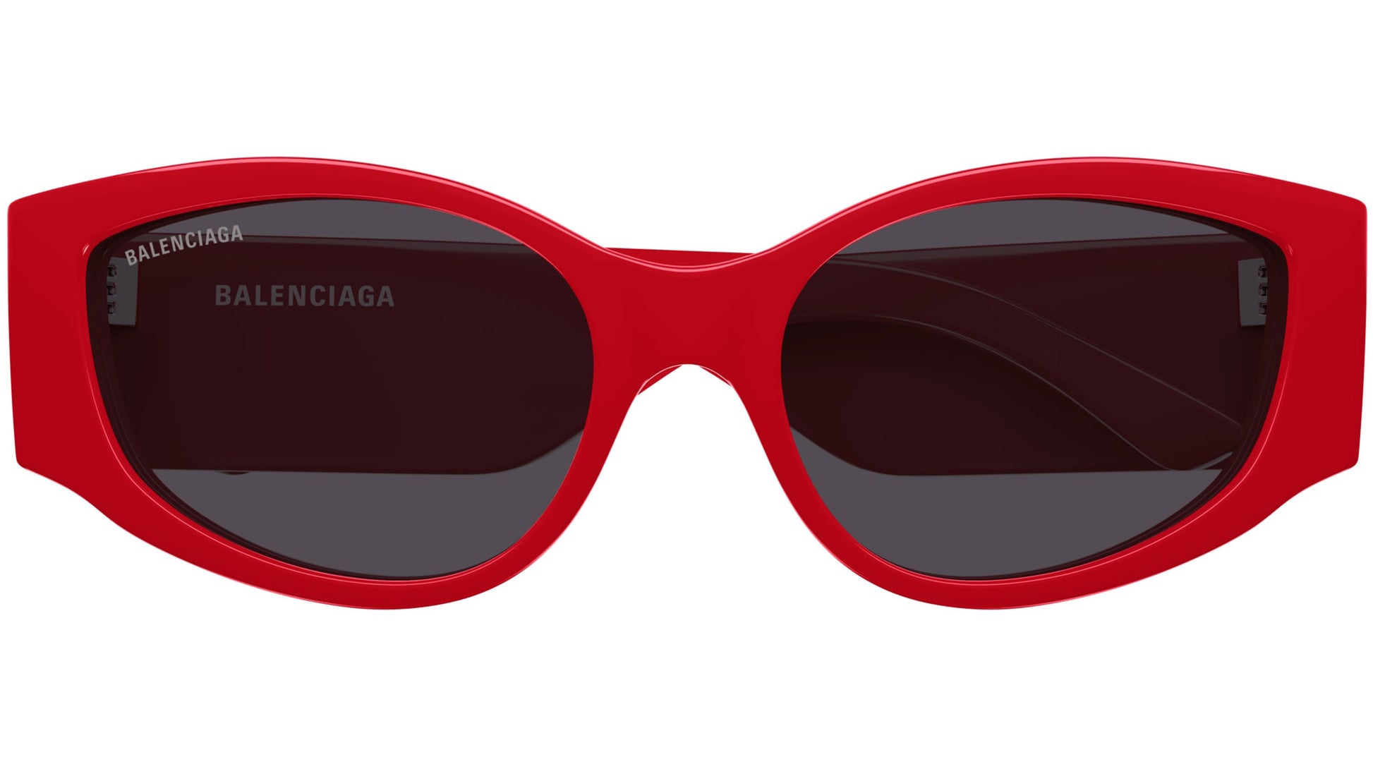 Gafas de sol Balenciaga modelo BB0258S de la línea Everyday eyewear, código de color 011 acetato reciclado rojo sólido brillante, forma de ojo de gato con lentes grises sólidos.