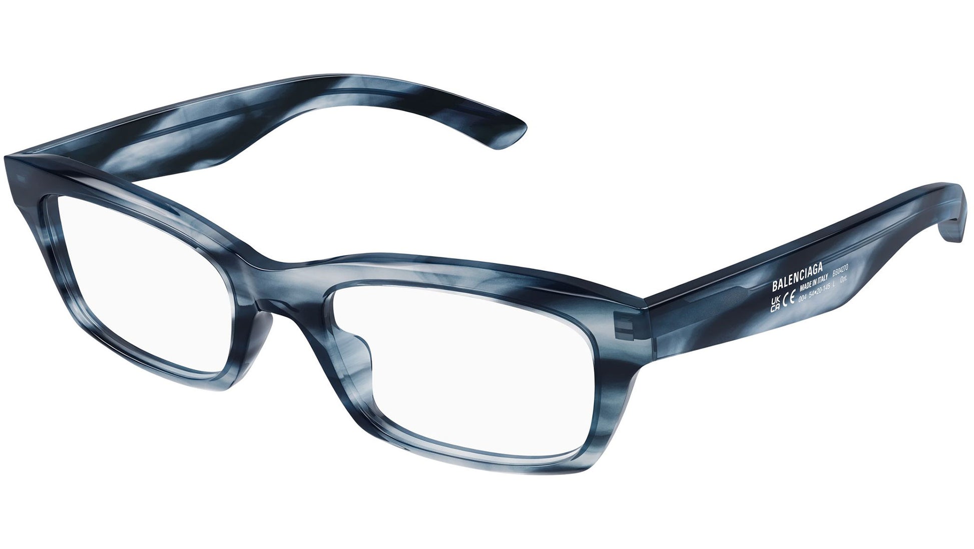Balenciaga BB0427O 004 glasses for men, featuring shiny flamed blue havana rectangular recycled acetate frame and demo lenses. Brand line: Everyday. Style code: BB0427O. Color code: 004. Made in Italy. Authorized Balenciaga online reseller. Your glasses will include the original case and accessories and are covered by a 12-month global warranty.