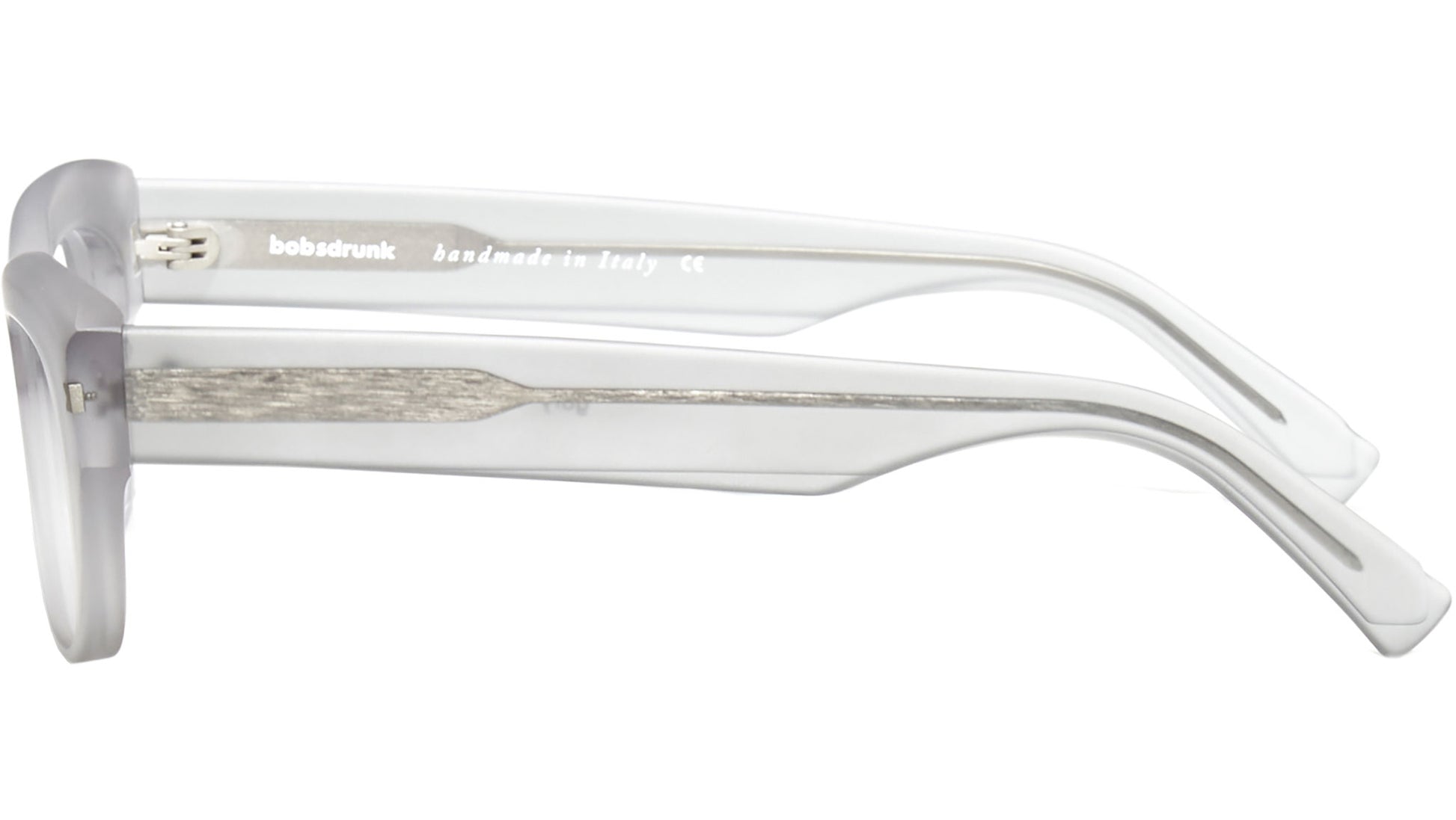 Modelo óptico Bobsdrunk Gary en la variante de color 171/S, gris transparente mate. Productos atemporales y formas atrevidas conviven en esta colección de óptica 2023. Las líneas están magistralmente diseñadas para crear un efecto de “ligereza audaz”. Cada par de gafas se caracteriza por un detalle emblemático mostrado en el frente y en la punta de las patillas, que resalta el valor de la marca. El detalle representa la unión de la letra inicial y final de Bobsdrunk en un solo símbolo. La cuidadosa elección de los materiales, la selección de los acabados y la extensa investigación cromática son prerrogativas de cada creación de Bobsdrunk.