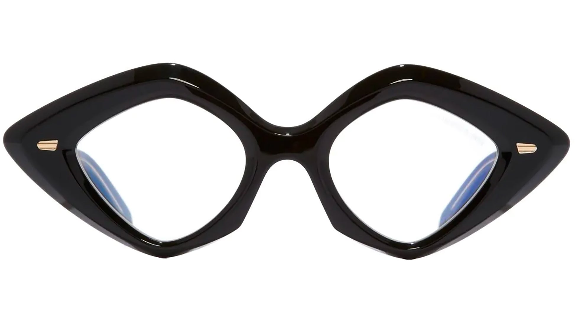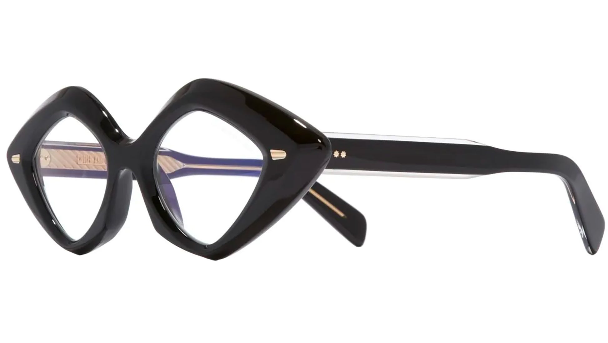 Una montura de archivo que usó por primera vez Elton John, cliente de Cutler and Gross, fue reelaborada a través de una lente moderna, dando como resultado la óptica 9126. La silueta excéntrica combina una línea de cejas curvada con asas angulares y biselados. Está esculpido con una construcción de capas divididas que aclara el acetato negro con bordes transparentes en las patillas.