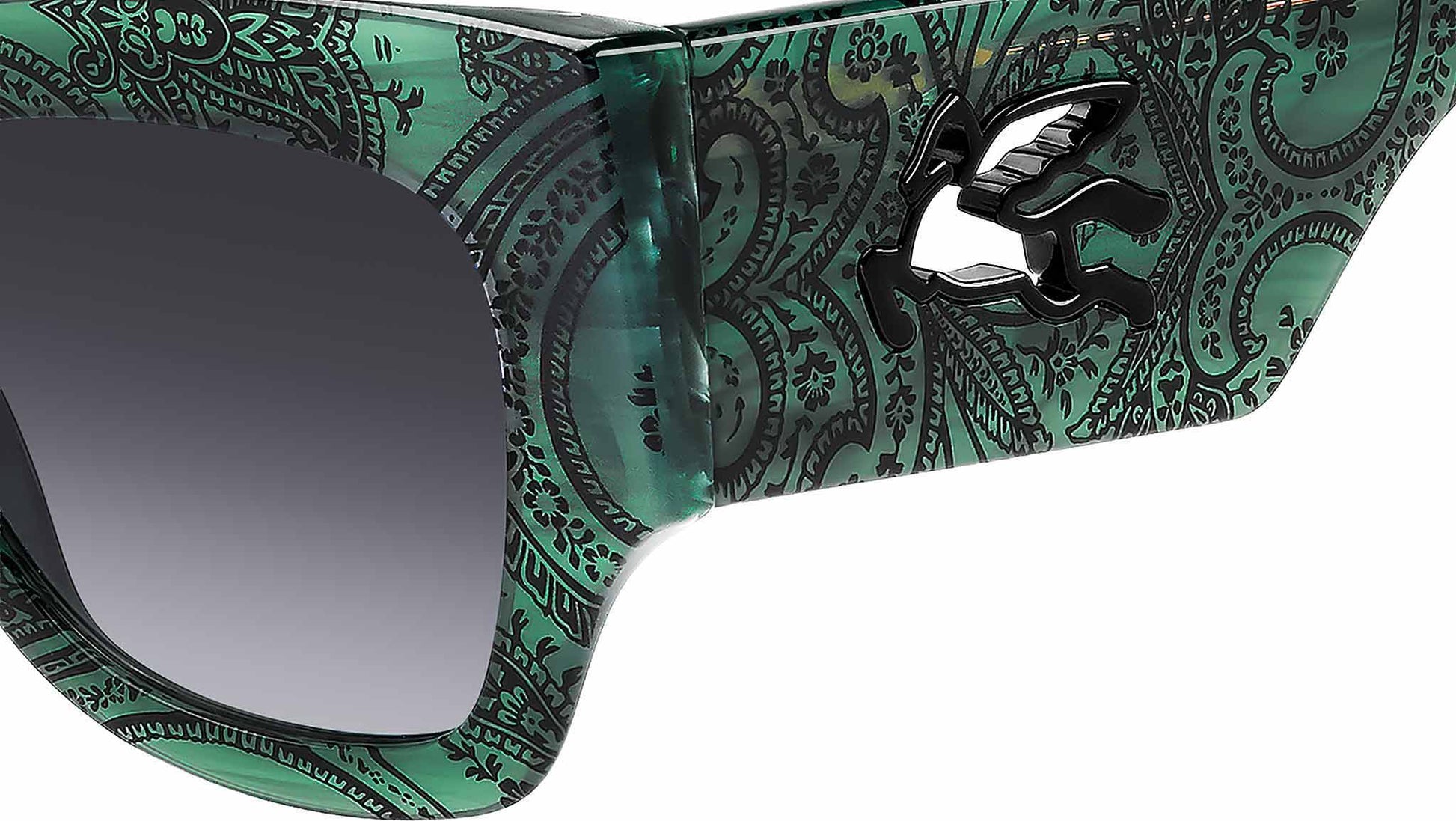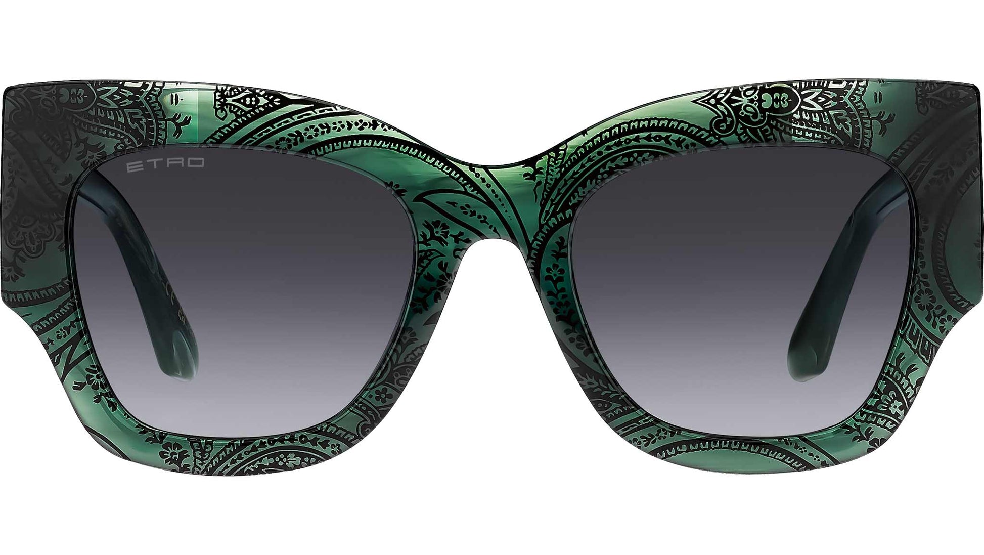 Etro 0076/S JRI 9O sunglasses for women, featuring marble green rectangular acetate frame and dark grey shaded lenses. Refined and quintessentially ETRO, these sunglasses make a stunning statement with their bold shape, exquisite construction and the precious Pegaso detail – crafted from a single piece of metal to create an unexpected cutout effect. They're made from premium acetate developed exclusively for the brand, finished using a milling process, and available in classic black, ETRO's burgundy, and Paisley-patterned variations that give fresh energy to heritage codes. Brand line: Etromania. Style code: 207798. Color code: JRI 9O. Authorized Etro online reseller. Your glasses will include the original case and accessories and are covered by a 12-month global warranty.