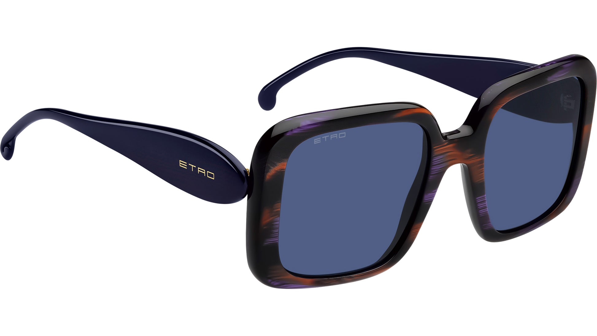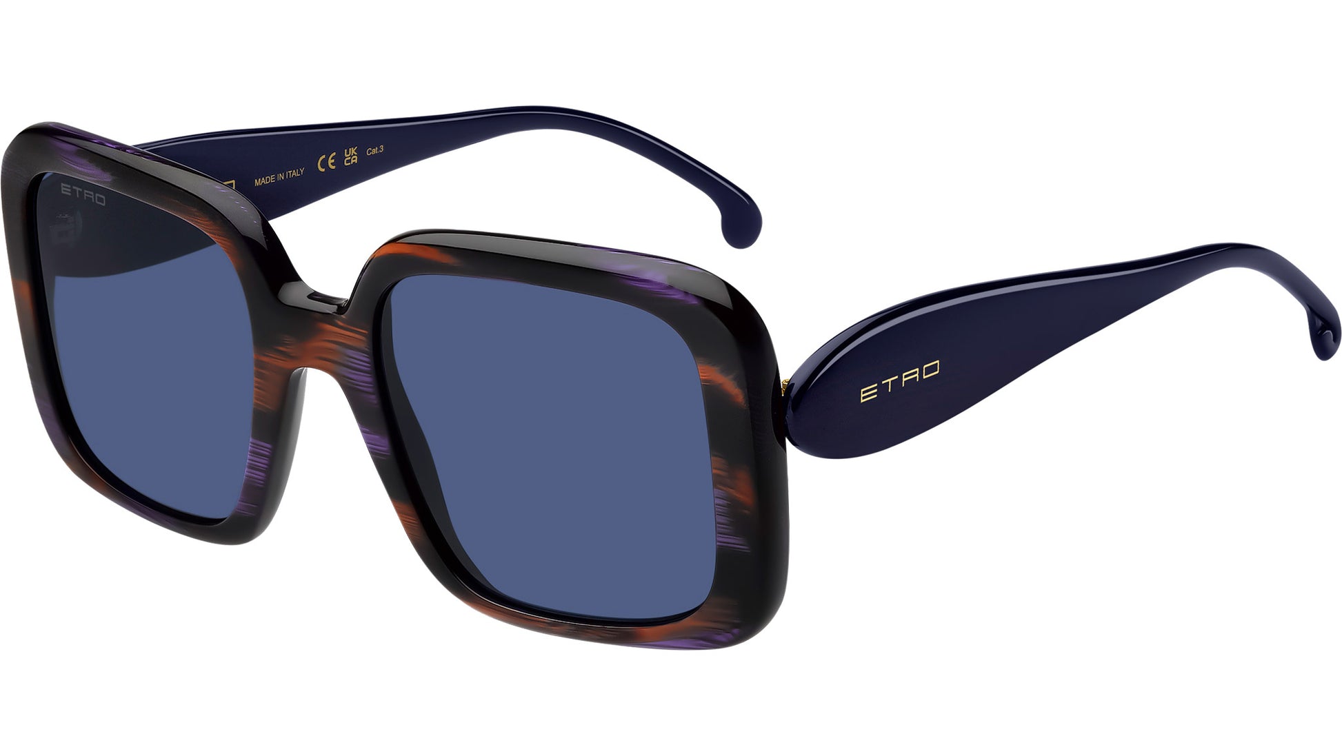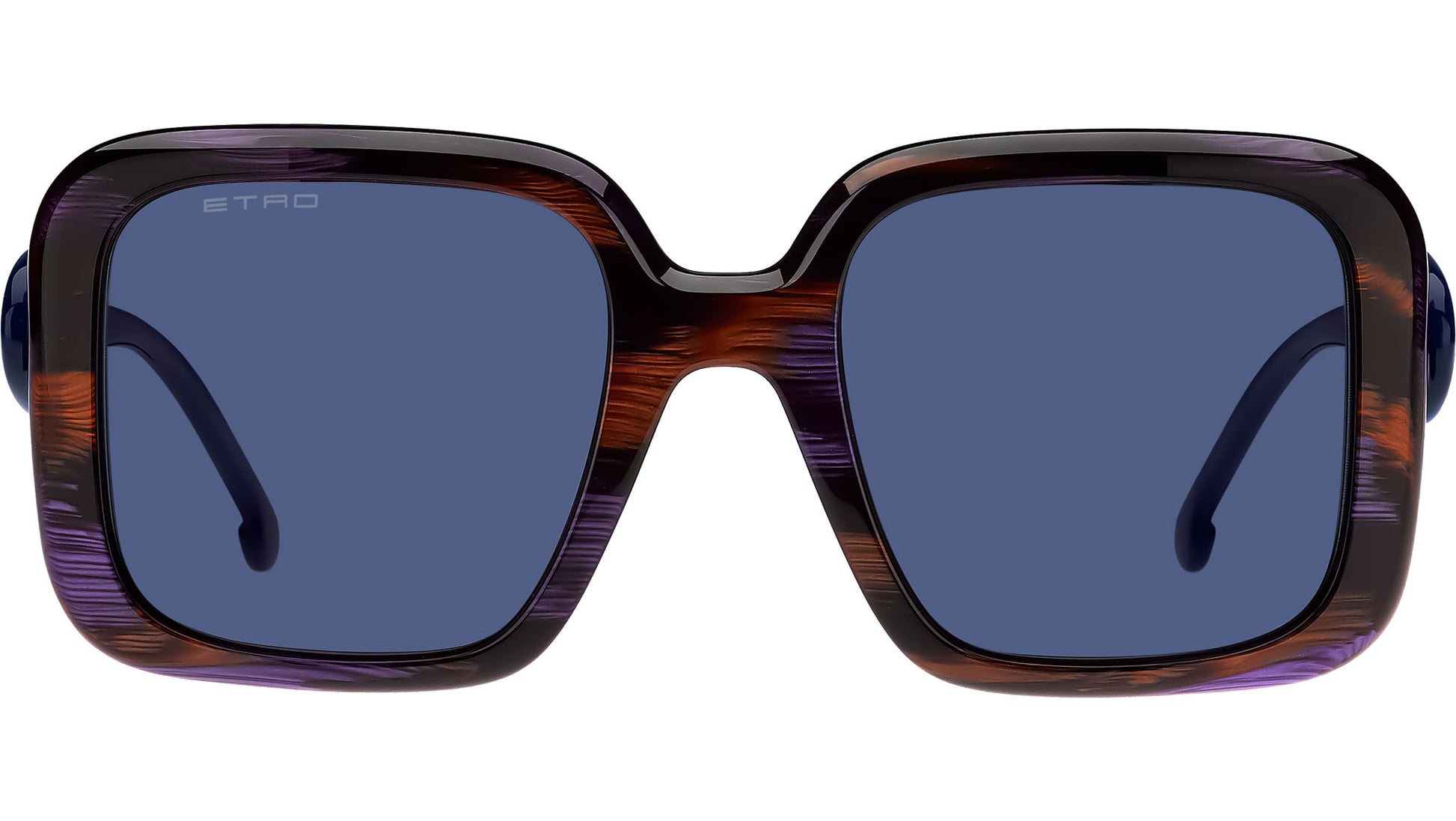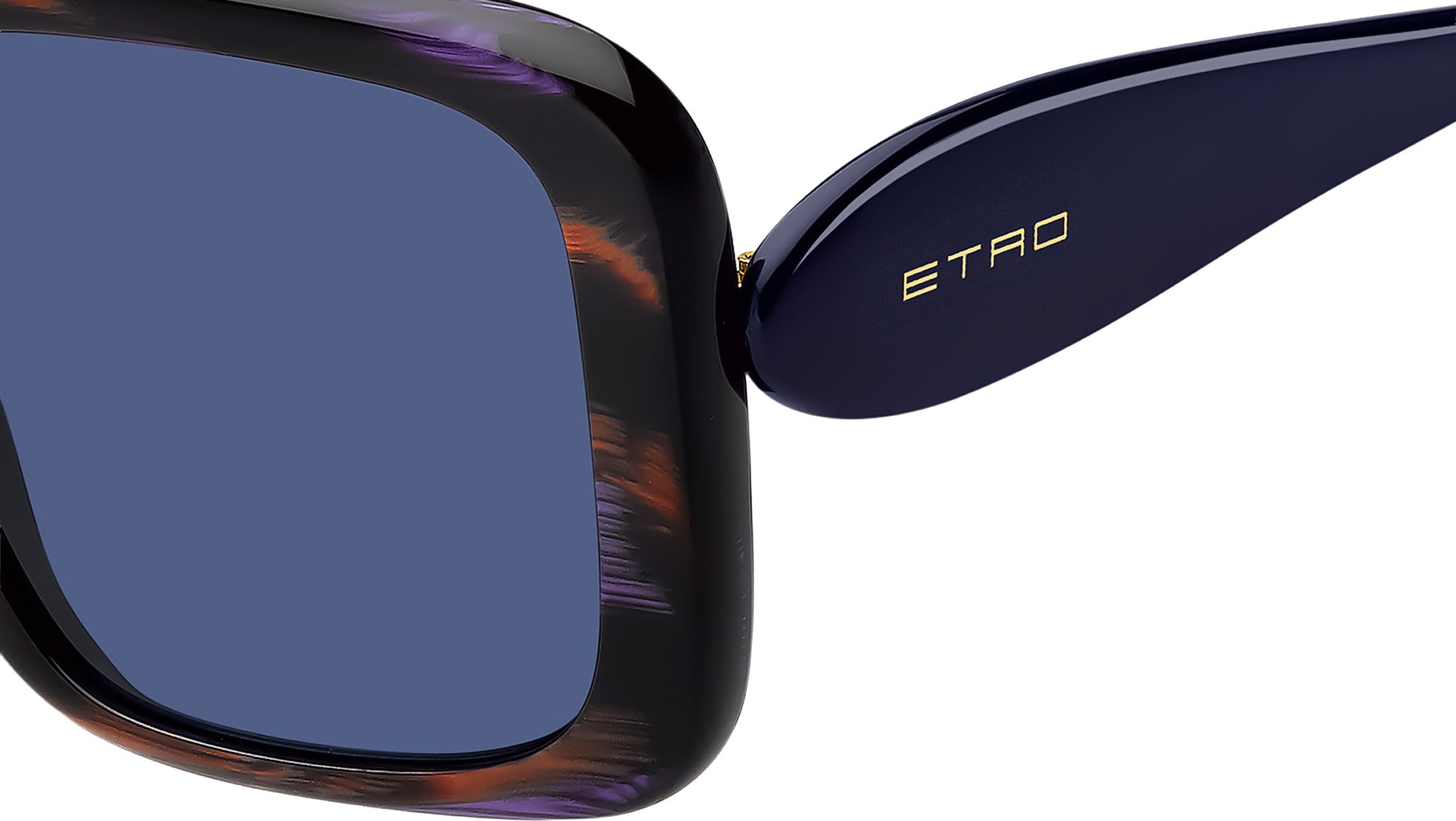 Etro 0083/S B3V KU sunglasses for women, featuring violet squared acetate frame and blue lenses. The epitome of the ETRO spirit, the "Etropaisley" eyewear line celebrates the brand's unmistakable motif in all its forms and chromatic variations. These sunglasses are reminiscent of a work of art with their softly curved geometric frame and custom wavy temples resembling the iconic Paisley shape. With an emphasis on delicate proportions and daring colourways, including irresistible two-tone variations, each style is accented with the ETRO logo and the brand's signature tips featuring the rounded geometry of the Paisley motif. Brand line: Etromania. Style code: 207824. Color code: B3V KU. Authorized Etro online reseller. Your glasses will include the original case and accessories and are covered by a 12-month global warranty.