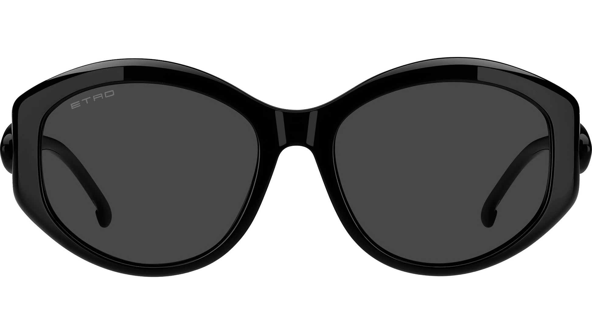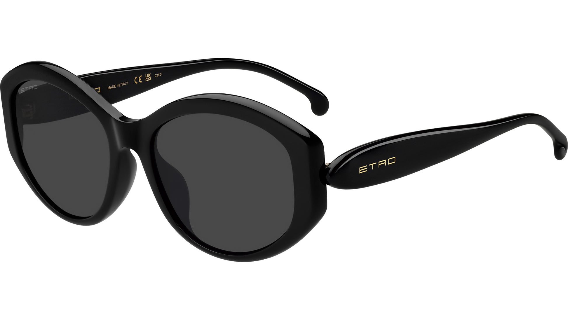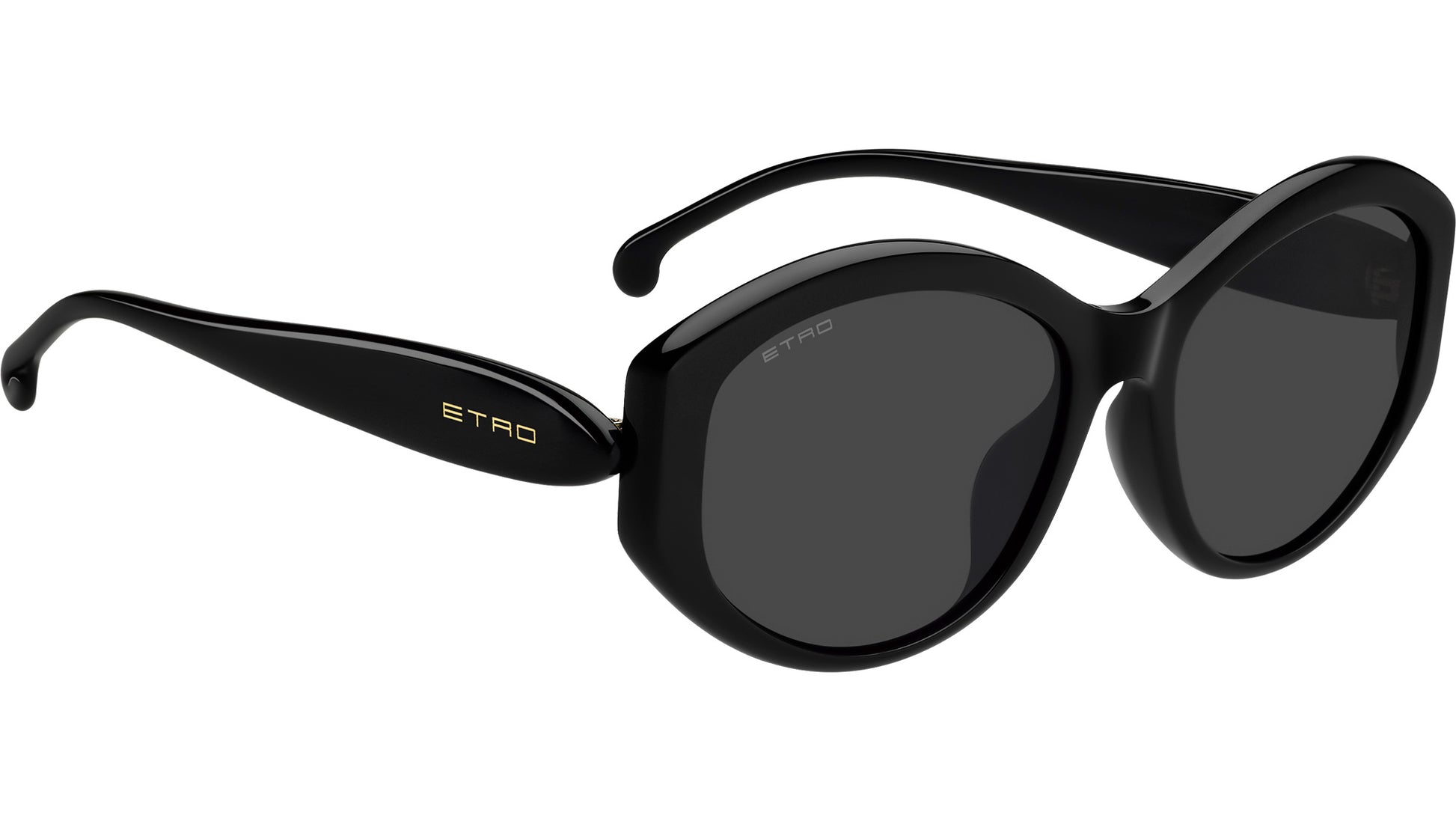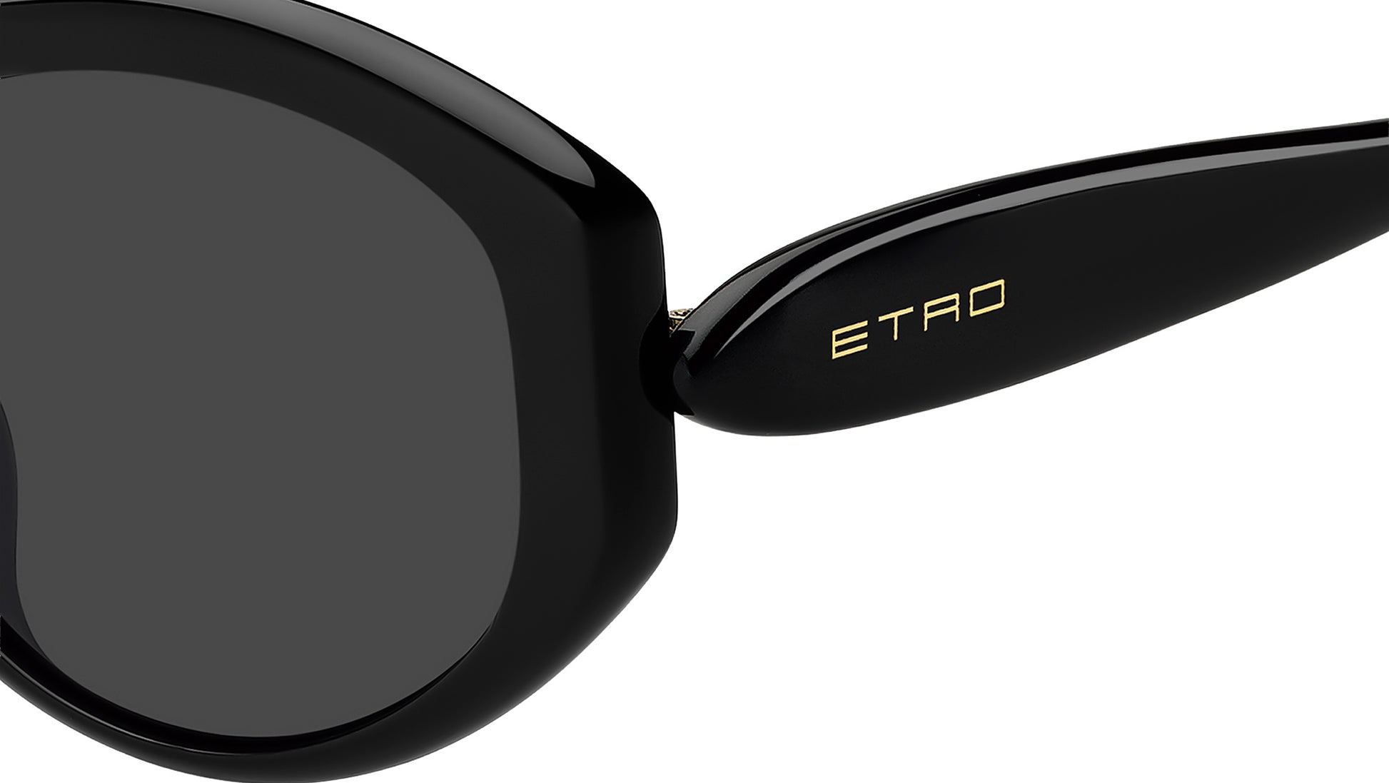 Etro 0086/F/S 807 IR sunglasses for women, featuring black oval acetate frame and grey lenses. The epitome of the ETRO spirit, the "Etropaisley" eyewear line celebrates the brand's unmistakable motif in all its forms and chromatic variations. These sunglasses are reminiscent of a work of art with their softly curved geometric frame and custom wavy temples resembling the iconic Paisley shape. With an emphasis on delicate proportions and daring colourways, including irresistible two-tone variations, each style is accented with the ETRO logo and the brand's signature tips featuring the rounded geometry of the Paisley motif. Brand line: Etromania. Style code: 207826. Color code: 807 IR. Authorized Etro online reseller. Your glasses will include the original case and accessories and are covered by a 12-month global warranty.