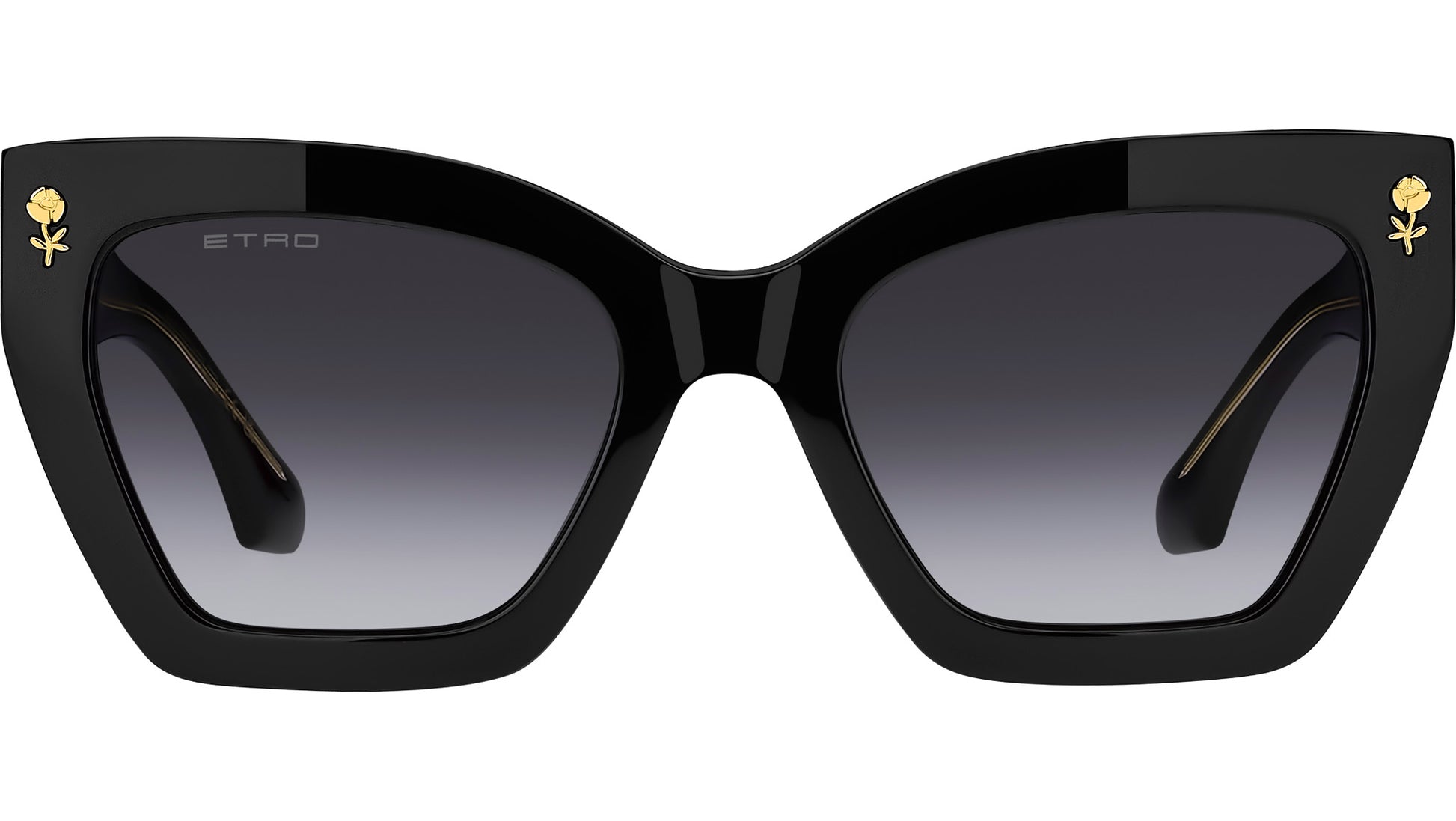 Etro 0090/S 807 9O sunglasses for women, featuring black rectangular acetate frame and dark grey shaded lenses. Brand line: Etromania. Style code: 207784. Color code: 807 9O. Authorized Etro online reseller. Your glasses will include the original case and accessories and are covered by a 12-month global warranty.
