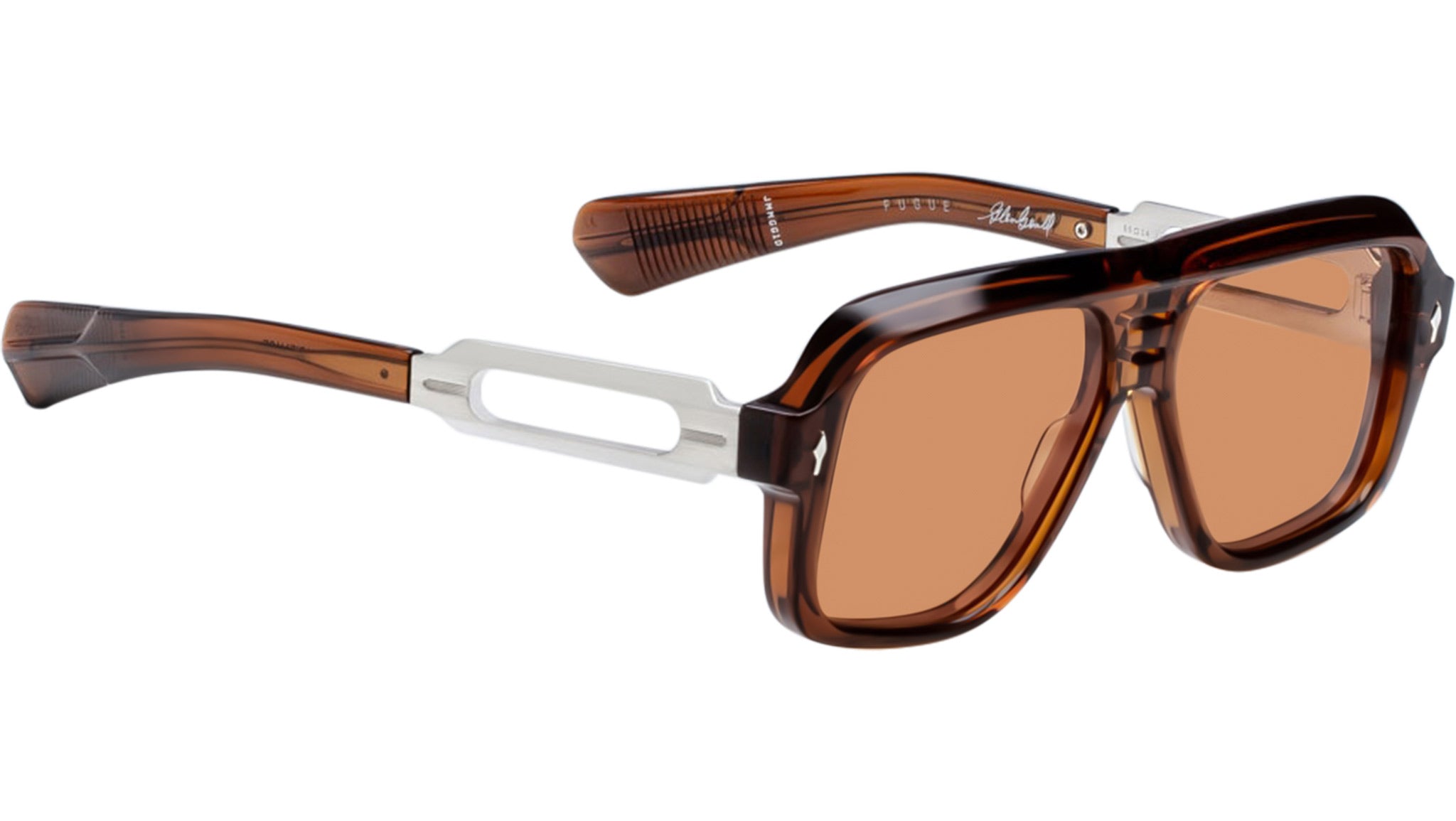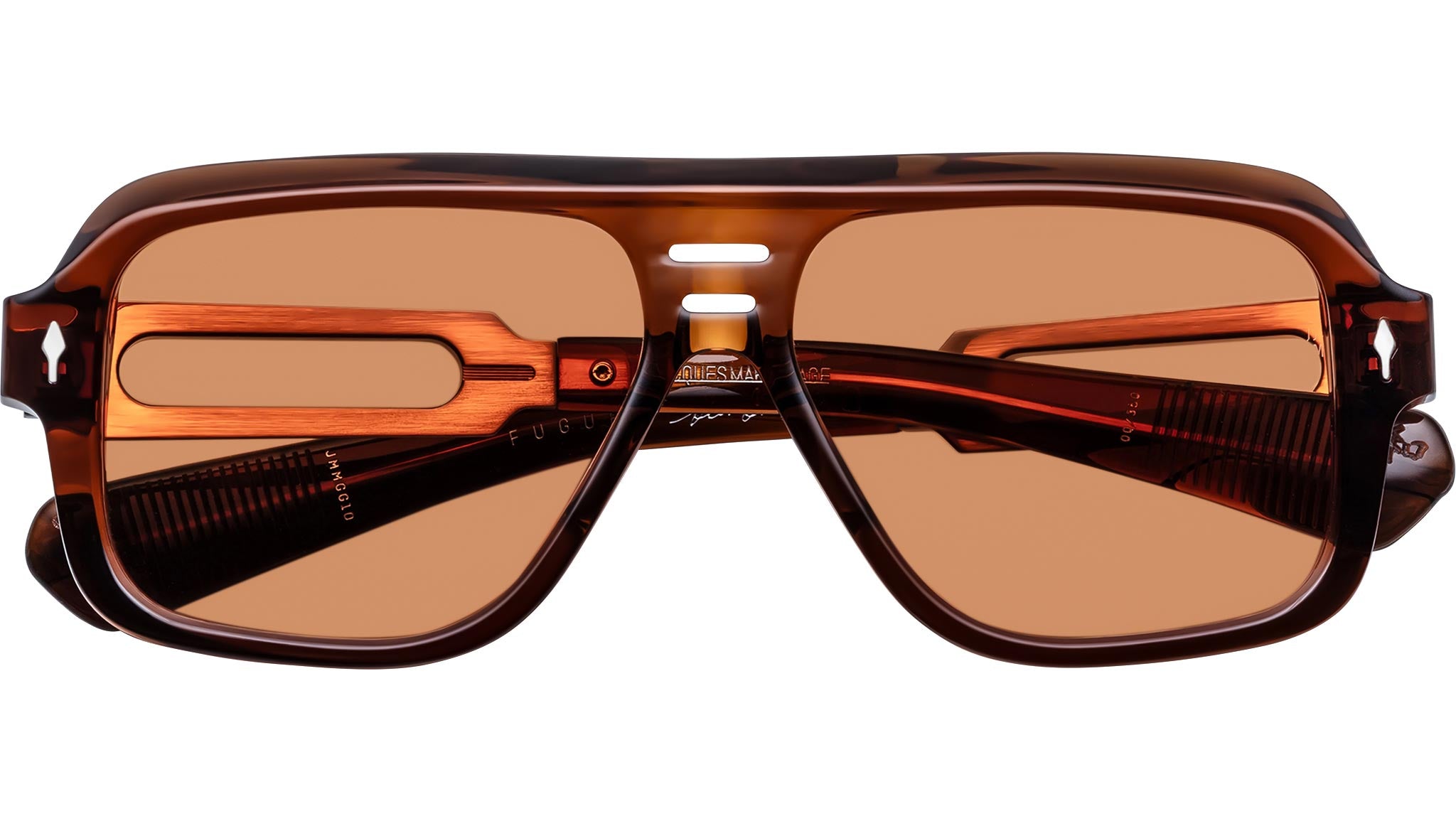 Las gafas de sol Jacques Marie Mage Fugue son unas gafas de sol combinadas de estilo navegador, inspiradas en los años 60, de la colección Glenn Gould by JMM, meticulosamente elaboradas a mano en Japón. Este diseño de edición limitada presenta un distintivo puente doble de acetato vegetal, patillas recortadas de titanio beta 100 % con terminales de acetato y detalles característicos de metales preciosos, como pasadores frontales con punta de flecha y bisagras monobloque personalizadas. Un refinado homenaje al arte y la individualidad del pianista Glenn Gould, estas monturas equilibran la elegancia atemporal con un toque de excentricidad. LOTE DE PRODUCCIÓN LIMITADA DE 350 PIEZAS. Montura marrón de acetato de celulosa curada de 10 mm con patillas plateadas de titanio beta 100 % con terminales de acetato de celulosa marrón y lentes naranjas. Pasador frontal con punta de flecha característico en plata de ley. Patillas combinadas con herrajes plateados y acetato de celulosa de nogal. Bisagra monobloque personalizada con cierre de tensión en plata. Lentes ámbar CR-39 de base 4 con tratamiento antirreflejo en la parte posterior. 100 % de protección UV. Estas gafas de edición limitada se presentan en una caja monográfica azul personalizada con detalles estampados en oro, acompañadas de un estuche de cuero tipo sobre a juego. Incluye un paño de limpieza de microfibra de doble cara personalizado, fabricado con PET reciclado, con ilustraciones exclusivas del álbum *Bach: The Goldberg Variations* de Glenn Gould, junto con un certificado de autenticidad impreso con los detalles de la colección y un número de edición limitada escrito a mano. Cada par incluye también una reedición especial de *The Goldberg Variations* (1956), la grabación emblemática que catapultó a Gould a la fama internacional y sigue siendo una de las interpretaciones al piano más célebres de la historia. Fabricadas en Japón. Código del modelo: JMMGG-1D