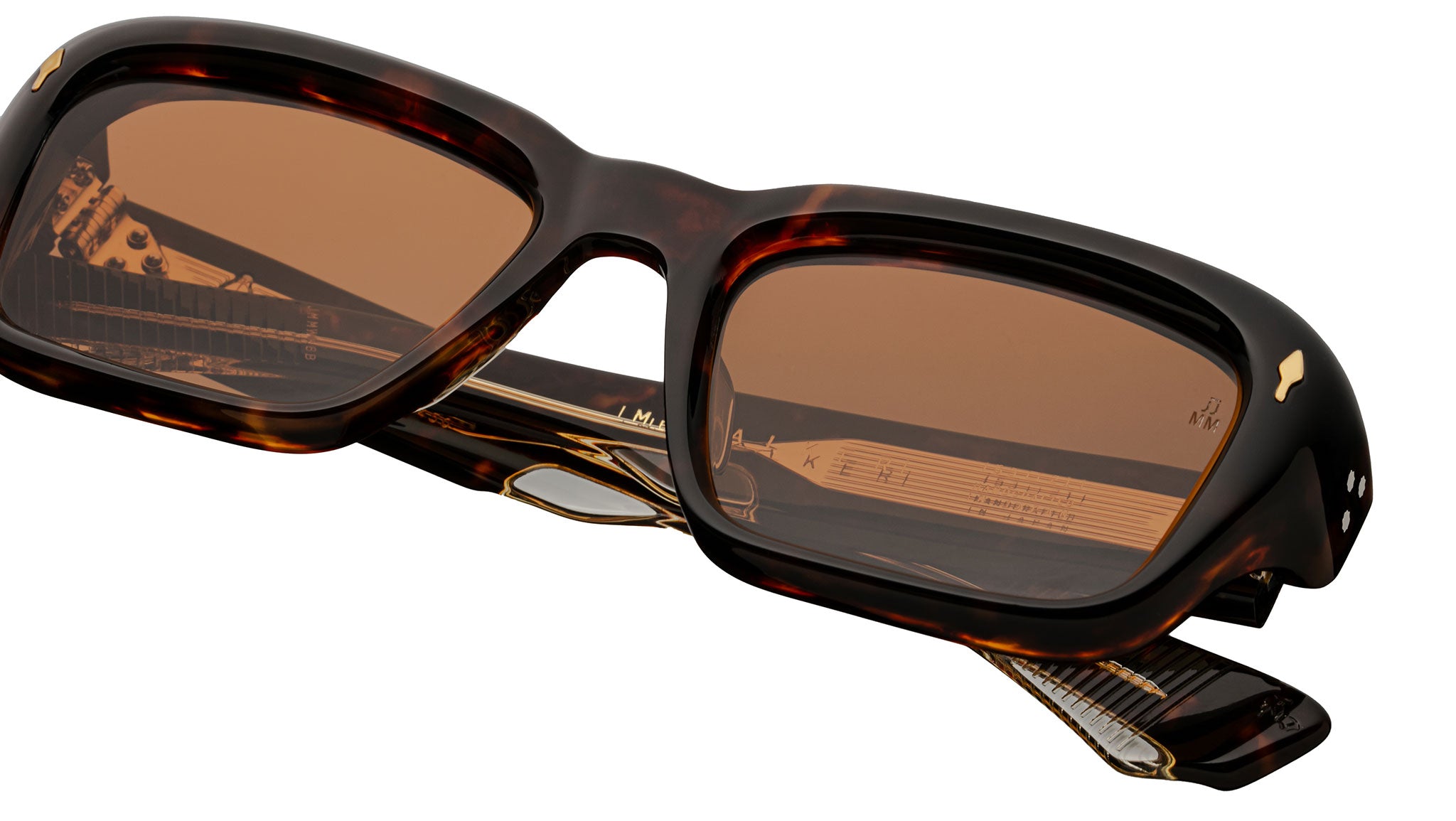 Elegantes y rectangulares con ángulos suaves, las gafas de sol Jacques Marie Mage Walker presentan un diseño refinado que se distingue por sus característicos pasadores frontales de metal precioso con punta de flecha y remaches en forma de espuela. La estructura de la montura revela núcleos de alambre "Classic" con expresivos grabados de líneas finas, que realzan la meticulosa artesanía y la elegancia atemporal. LOTE DE PRODUCCIÓN LIMITADA DE 450 PIEZAS. Montura de acetato de celulosa curada marrón de 10 mm, patillas de acetato laminado doble personalizado, pasador frontal de punta de flecha distintivo en oro oscuro, estructura de patilla exterior expuesta, núcleo de alambre personalizado con grabado de líneas finas en oro oscuro, bisagra personalizada de 9 barriles con seguridad por tensión, lentes CR-39 de cristal ámbar dorado, lentes de base 4 con tratamiento antirreflejo posterior. Estuche de cuero artesanal italiano. Paño de limpieza/pañuelo de bolsillo de microfibra. Embalaje rígido forrado en tela de seda. Certificado de prensa con membrete con número de serie de edición limitada y firma del artesano. Hecho en Japón. Código del modelo: JMMWK-6B