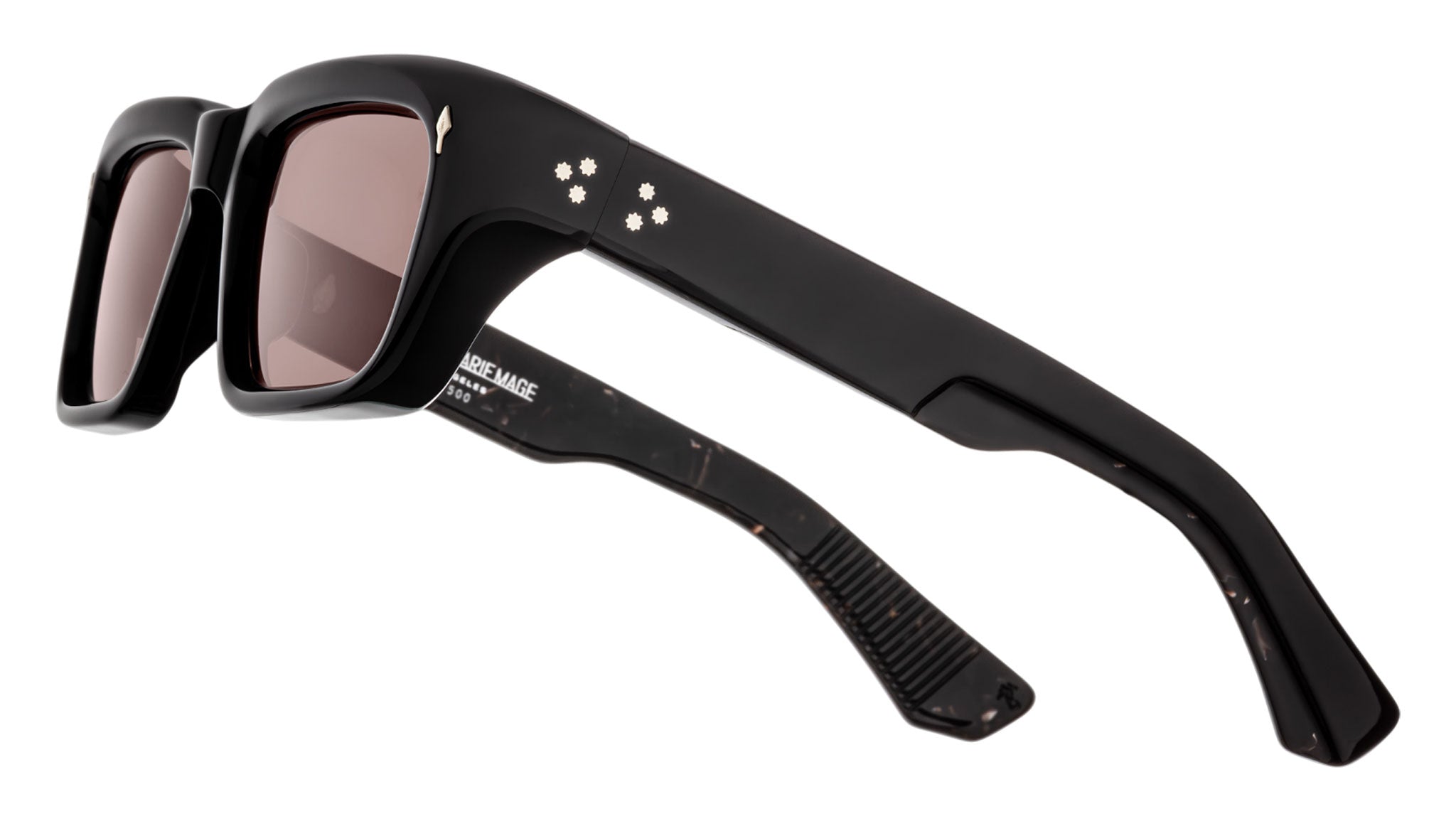 Elegantes y rectangulares con ángulos suaves, las gafas de sol Jacques Marie Mage Walker presentan un diseño refinado que se distingue por sus característicos pasadores frontales de metal precioso con punta de flecha y remaches en forma de espuela. La estructura de la montura revela núcleos de alambre "Classic" con expresivos grabados de líneas finas, que realzan la meticulosa artesanía y la elegancia atemporal. LOTE DE PRODUCCIÓN LIMITADA DE 500 PIEZAS. Montura de acetato de celulosa curada negra de 10 mm, patillas de acetato laminado doble personalizado, pasador frontal de punta de flecha plateado, núcleo de alambre oculto con grabado de líneas finas personalizado, bisagra personalizada de 9 barriles con seguridad por tensión, lentes CR-39 degradadas en marrón oscuro, lentes de base 4 con tratamiento antirreflejo posterior. Estuche de cuero artesanal italiano. Paño de limpieza/pañuelo de bolsillo de microfibra. Embalaje rígido forrado en tela de seda. Certificado de prensa con membrete con número de serie de edición limitada y firma del artesano. Hecho en Japón. Código del modelo: JMMWK-18K