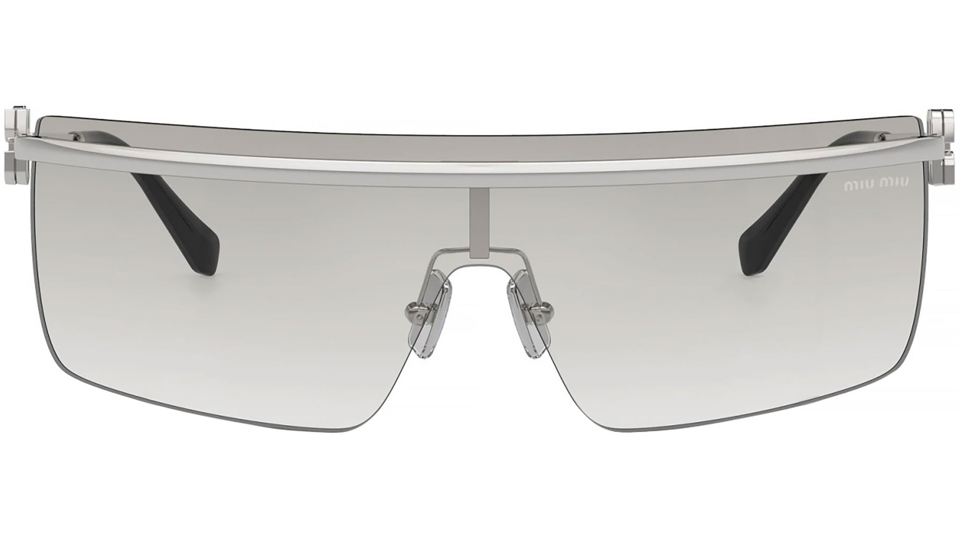 Colección de gafas de sol Miu Miu Irreverfully Sophisticated modelo MU 50ZS con montura de metal geométrico sin montura plateada y lentes degradadas plateadas transparentes. Código de producto MU50ZS, código de color 1BC8K1. Las gafas de sol Miu Miu son el epítome de la moda chic y sofisticada. La línea presenta diseños únicos y vanguardistas, con monturas atrevidas, colores vibrantes y detalles intrincados.