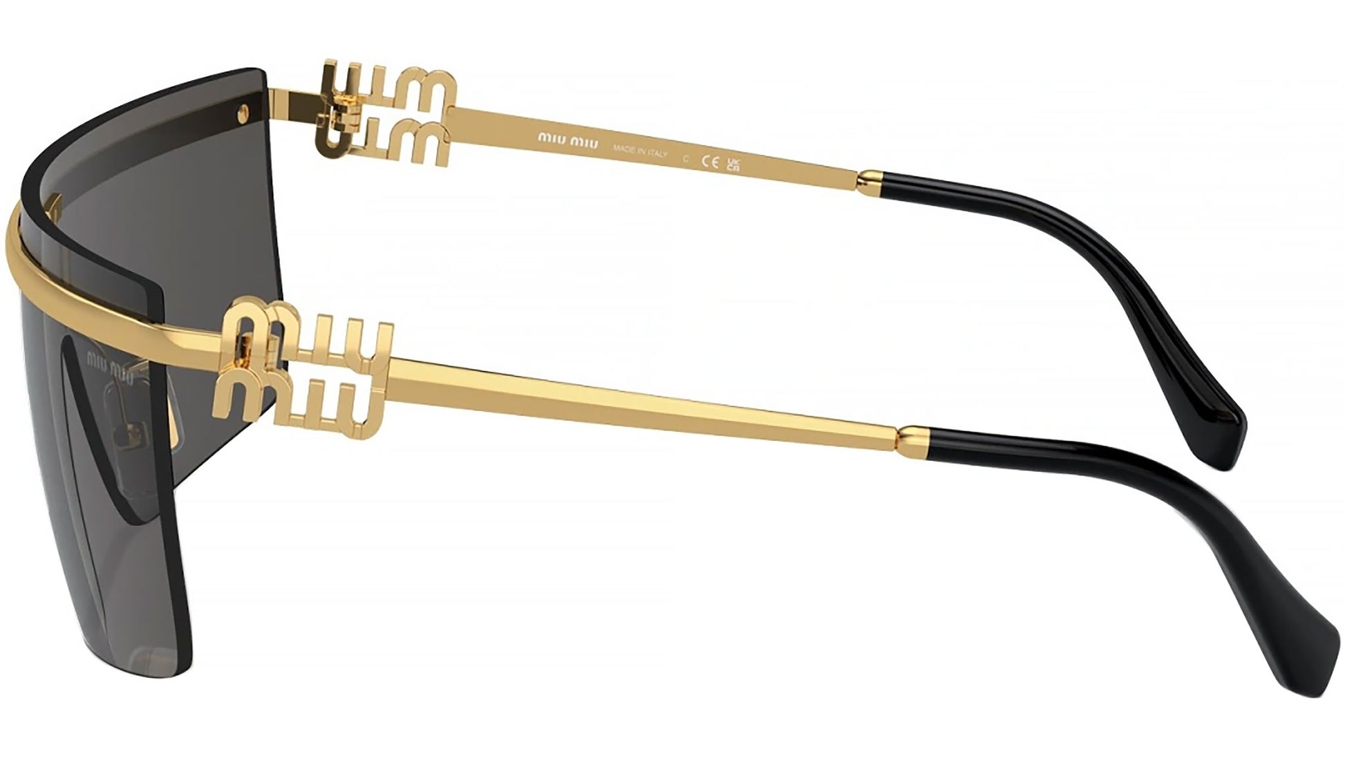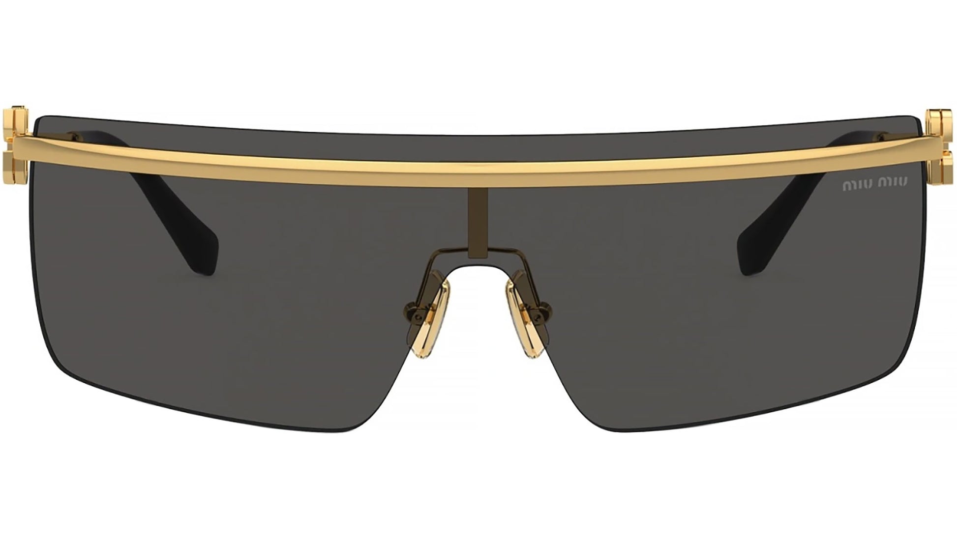 Colección de gafas de sol Miu Miu Irreverfully Sophisticated modelo MU 50ZS con montura geométrica de metal al aire en oro y lentes en gris oscuro. Código de producto MU50ZS, código de color 5AK5S0. Las gafas de sol Miu Miu son el epítome de la moda chic y sofisticada. La línea presenta diseños únicos y vanguardistas, con monturas atrevidas, colores vibrantes y detalles intrincados.