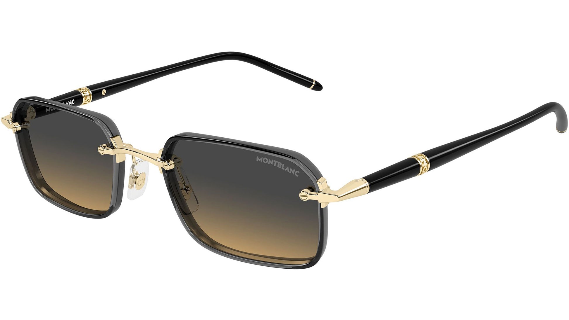 Montblanc MB0483S 002 sunglasses for men, featuring shiny light gold / shiny transparent grey eyerim rectangular metal frame and double gradient grey / orange bio nylon lenses. Brand line: Meisterstück. Style code: MB0483S. Color code: 002. Made in Japan. Authorized Montblanc online reseller. Your glasses will include the original case and accessories and are covered by a 12-month global warranty.