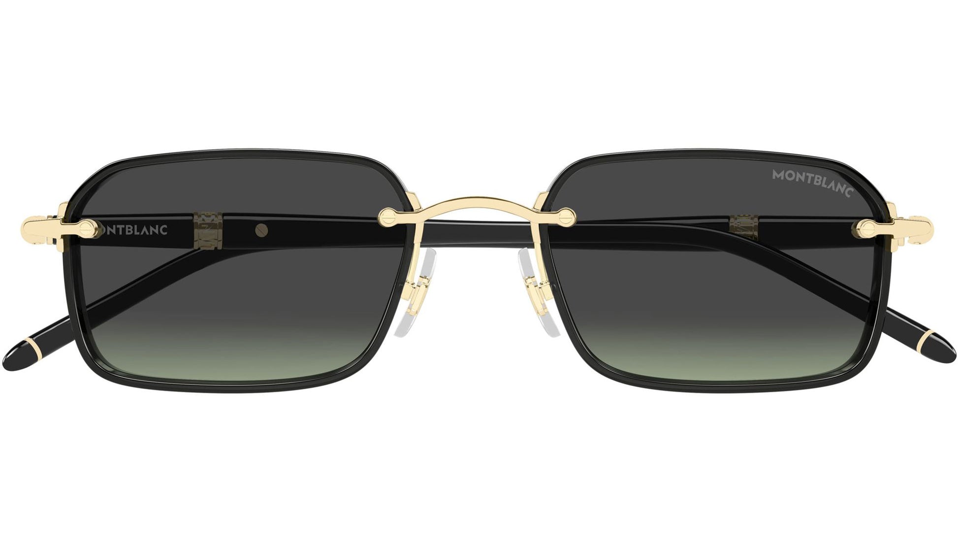 Montblanc MB0483S 004 sunglasses for men, featuring shiny light gold / shiny transparent grey eyerim rectangular metal frame and double gradient grey / acid green bio nylon lenses. Brand line: Meisterstück. Style code: MB0483S. Color code: 004. Made in Japan. Authorized Montblanc online reseller. Your glasses will include the original case and accessories and are covered by a 12-month global warranty.