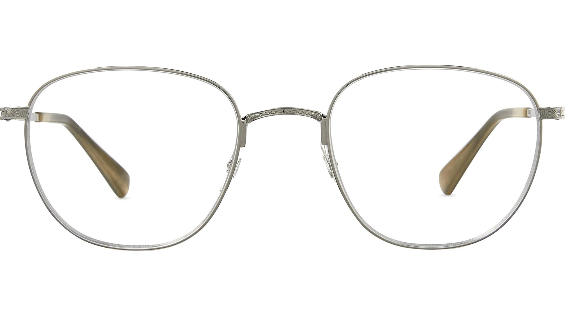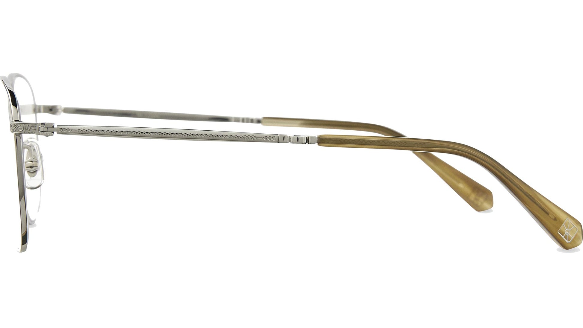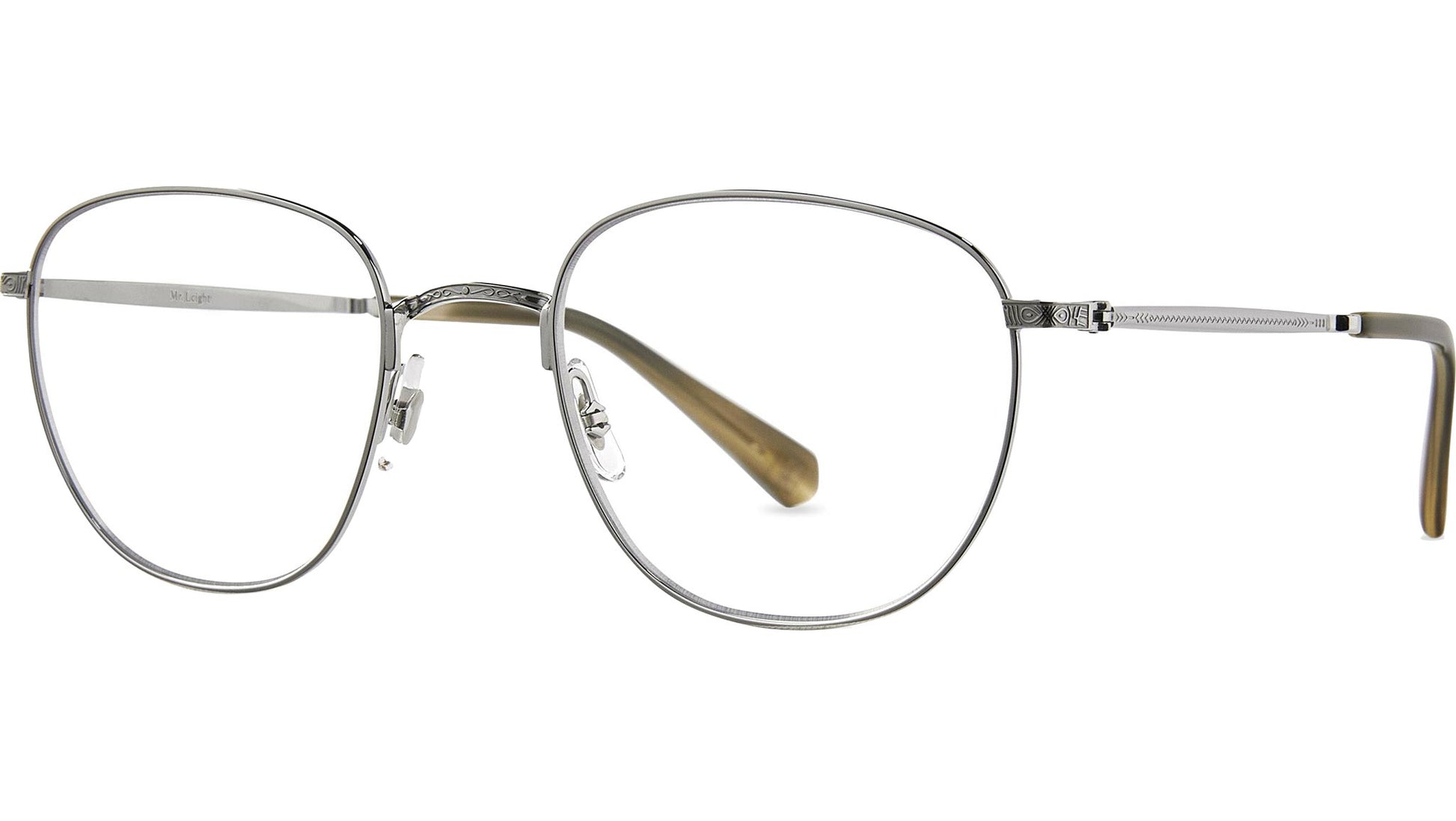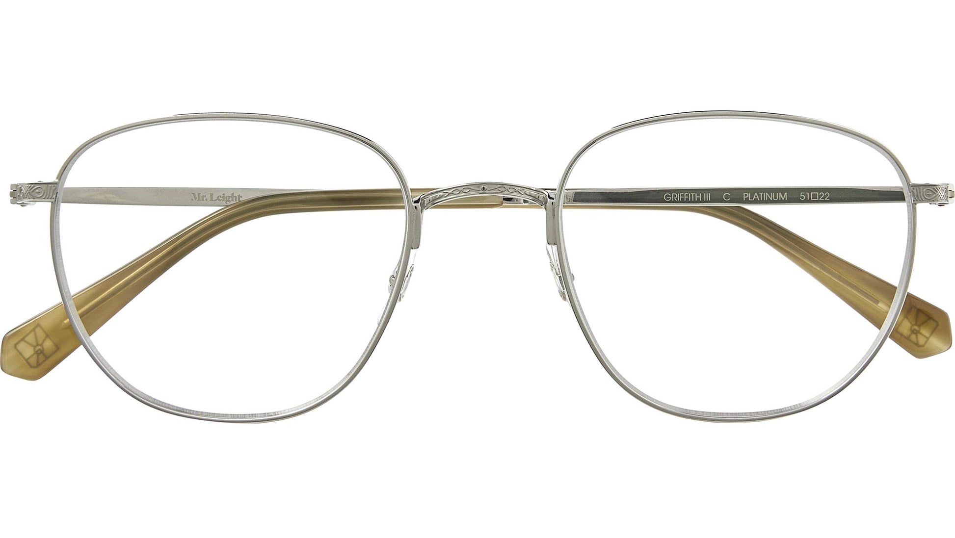 Mr. Leight Griffith III C glasses featuring platinum / kelp round metal frame and demo lenses. The all-metal Griffith II is a standout version of a best-selling design, merging elements of 1980s Japanese wire combo frames with a contemporary twist. This eyewear features a combination of acetate and metal, enhanced by titanium accents and adjustable temple components for a customized fit. The sleek metal construction is adorned with LA freeway filigree detailing on the endpieces, adding a unique visual touch. It is handcrafted in Japan and equipped with optical quality CR-39 lenses, featuring a 4 base lens design with a backside anti-reflective coating. The flexible titanium coil temples ensure comfortable wear, complemented by crystal-look nose pads. This model is suitable for unisex wear. Style code: ML3035. Color code: PLT-KLP. Authorized Mr. Leight online reseller. Your glasses will include the original case and accessories and are covered by a 12-month global warranty.