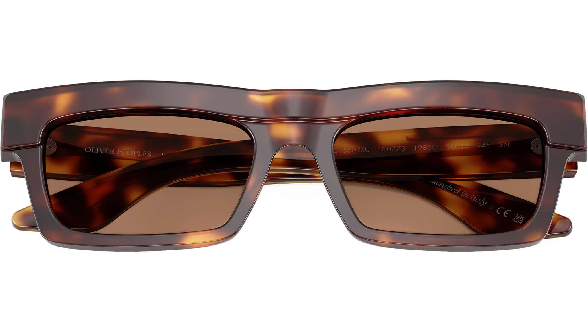Oliver Peoples 1985C OV5607SU 100773 sunglasses for women, featuring dark mahogany d-frame acetate frame and brown CR-39 lenses. Universal fit. Brand line: Collaboration. Style code: 0OV5607SU. Color code: 100773. Made in Italy. Authorized Oliver Peoples online reseller. Your glasses will include the original case and accessories and are covered by a 12-month global warranty.