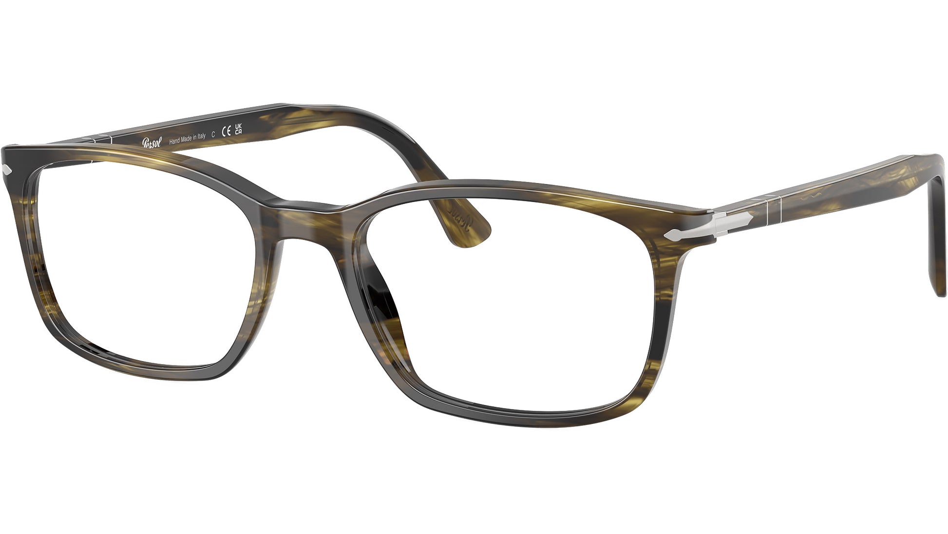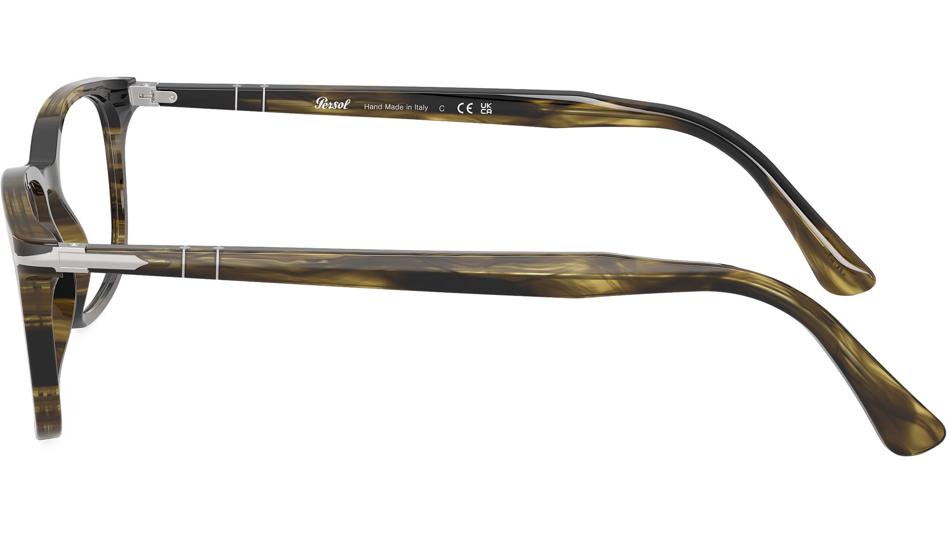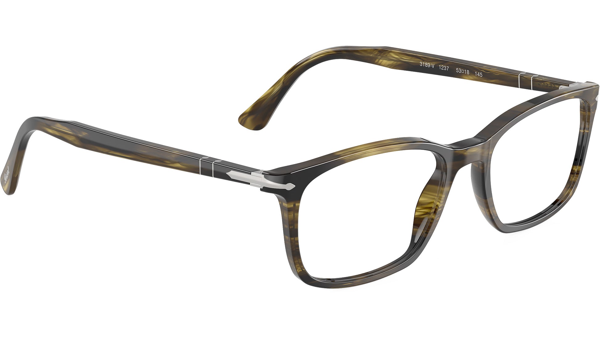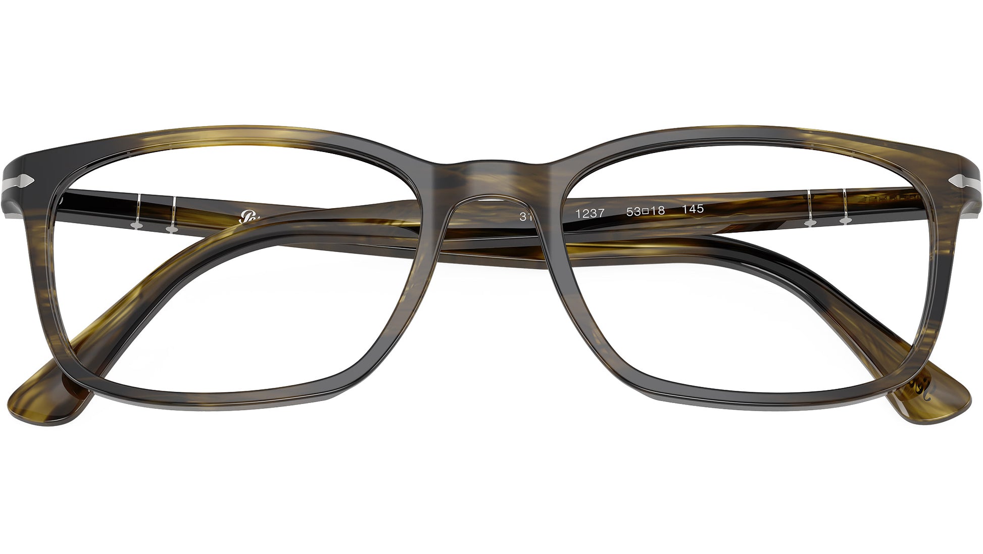 Persol glasses for men model PO3189V 1237 featuring striped black & olive green acetate frame and demo lenses. High bridge fit. Frame line: Officina. Brand code: 0PO3189V. Color code: 1237. Authorised Persol Eyewear Online Reseller. Your glasses will come including the original case and accessories and will be covered by 12 month global warranty.