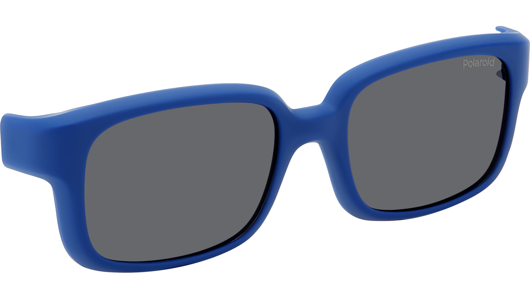 Gafas de clip Polaroid Kids PLD K005 CL-ON FLL M9 para niños, con montura rectangular de poliamida ecológica azul mate y lentes polarizadas grises. Línea: Niños. Código de estilo: 205739. Código de color: FLL M9. Distribuidor autorizado en línea de Polaroid Kids. Sus gafas incluyen el estuche y los accesorios originales, y cuentan con una garantía global de 12 meses.