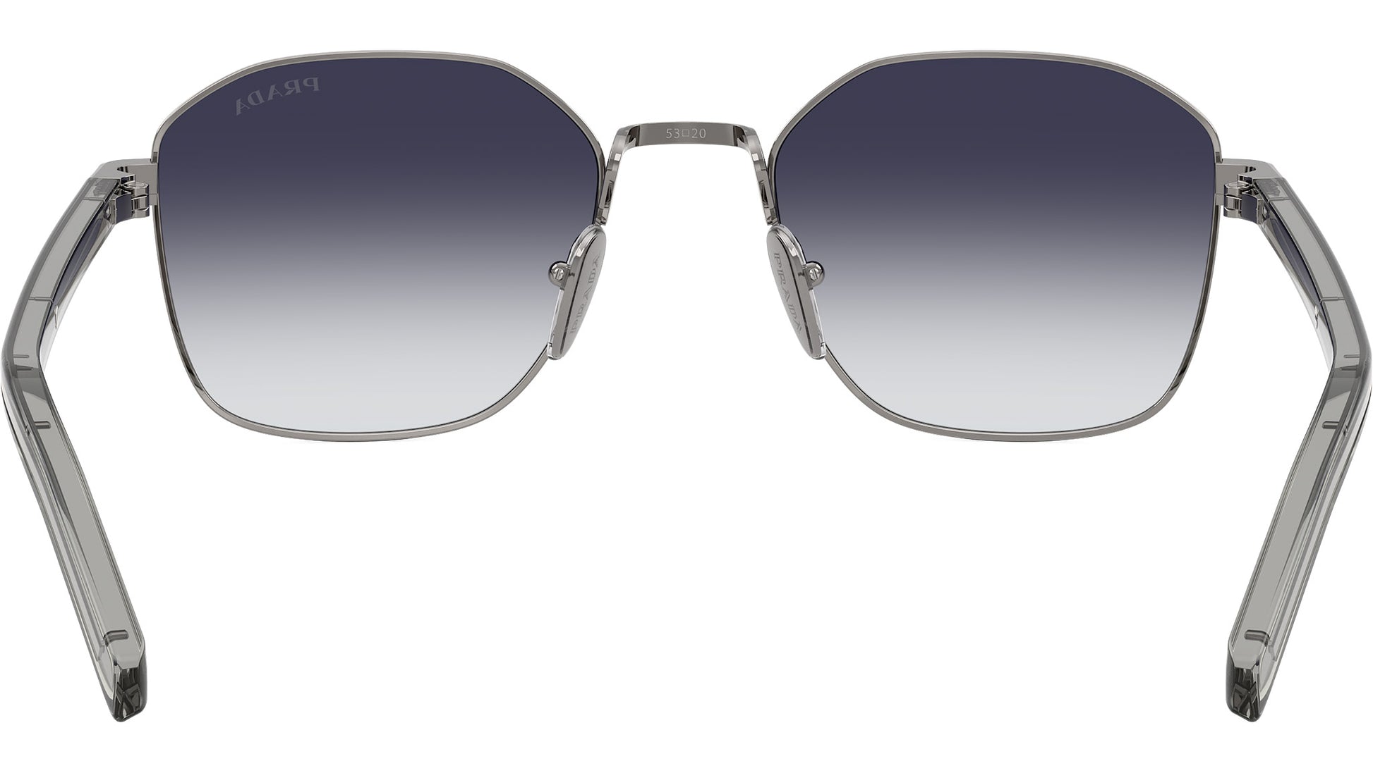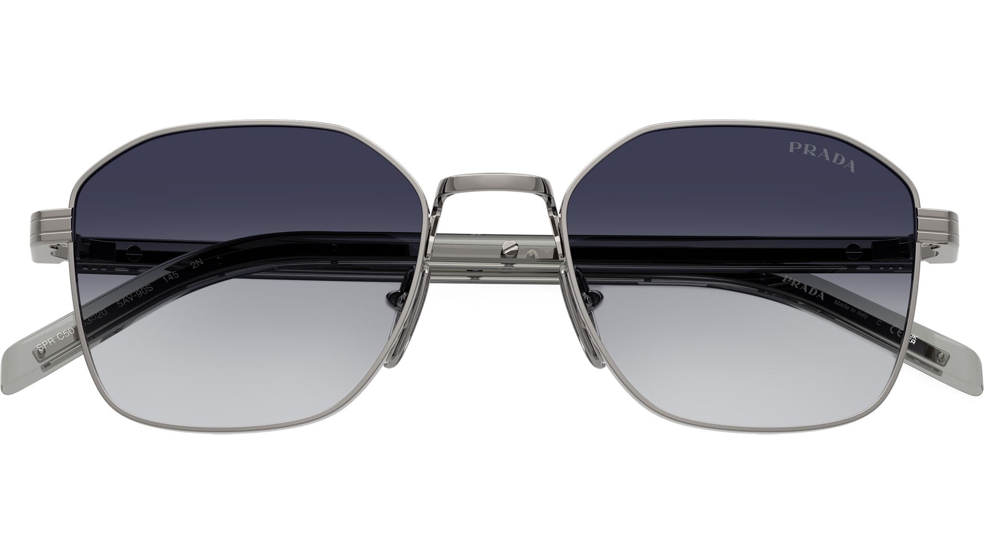 Prada PR C50S 5AV90S sunglasses for men, featuring gunmetal squared stainless steel frame and grey gradient bio polyamide lenses. Adjustable nosepads. Brand line: Heritage. Style code: PRC50S. Color code: 5AV90S. Made in Italy. Authorized Prada online reseller. Your glasses will include the original case and accessories and are covered by a 12-month global warranty.