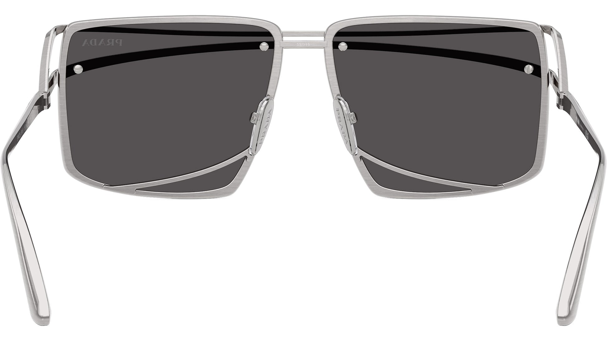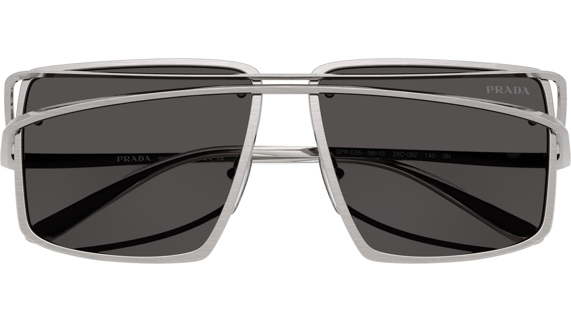 Prada PR C55S 28C08Z sunglasses for men, featuring vintage silver geometric metal frame and dark grey bio polyamide lenses. High bridge fit. Brand line: Fashion Show. Style code: PRC55S. Color code: 28C08Z. Made in Italy. Authorized Prada online reseller. Your glasses will include the original case and accessories and are covered by a 12-month global warranty.