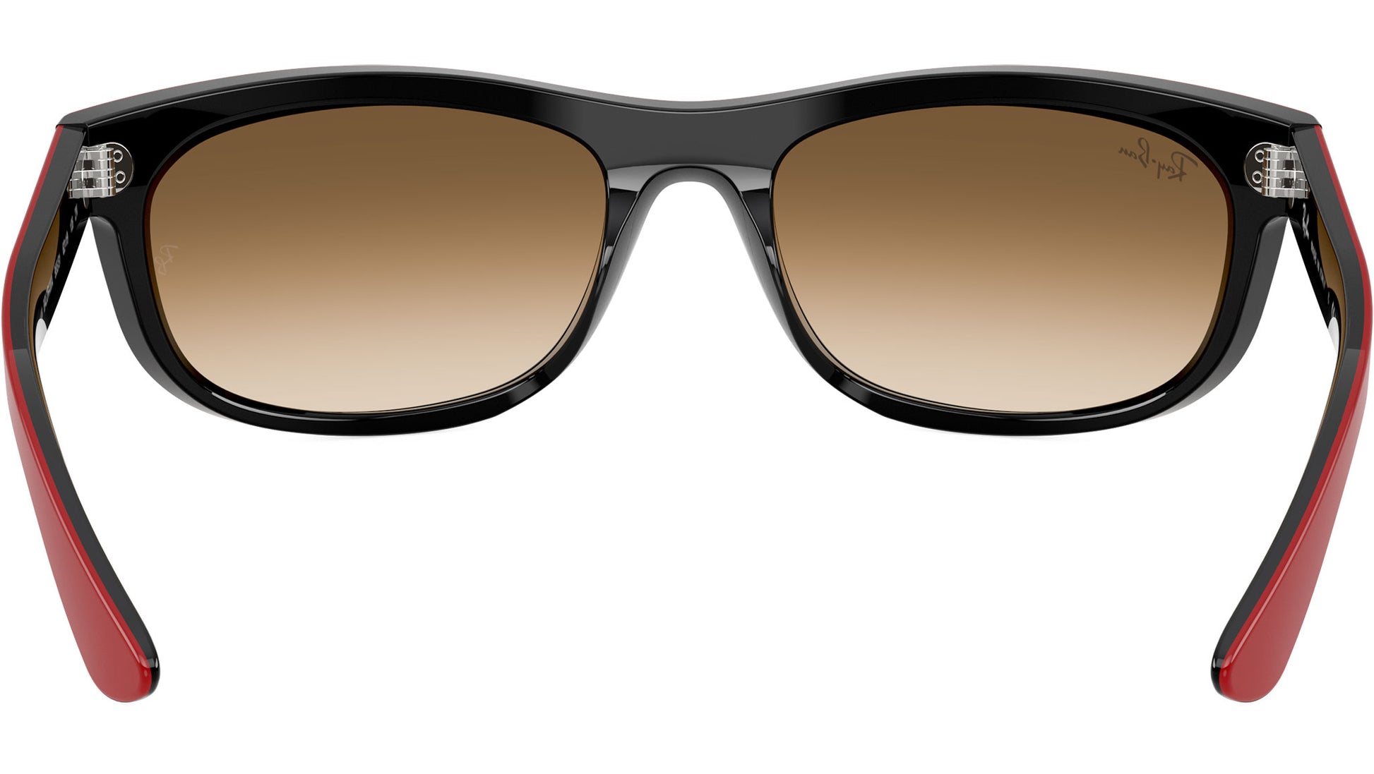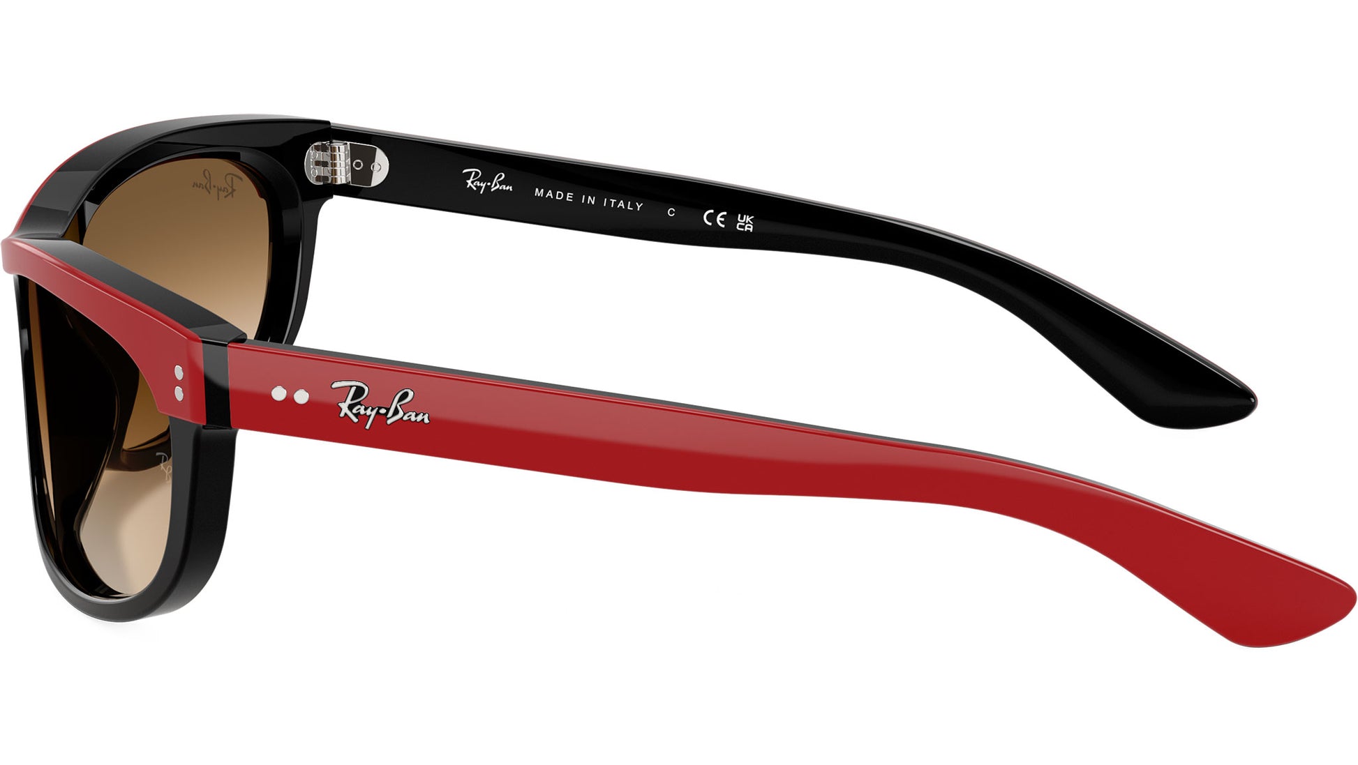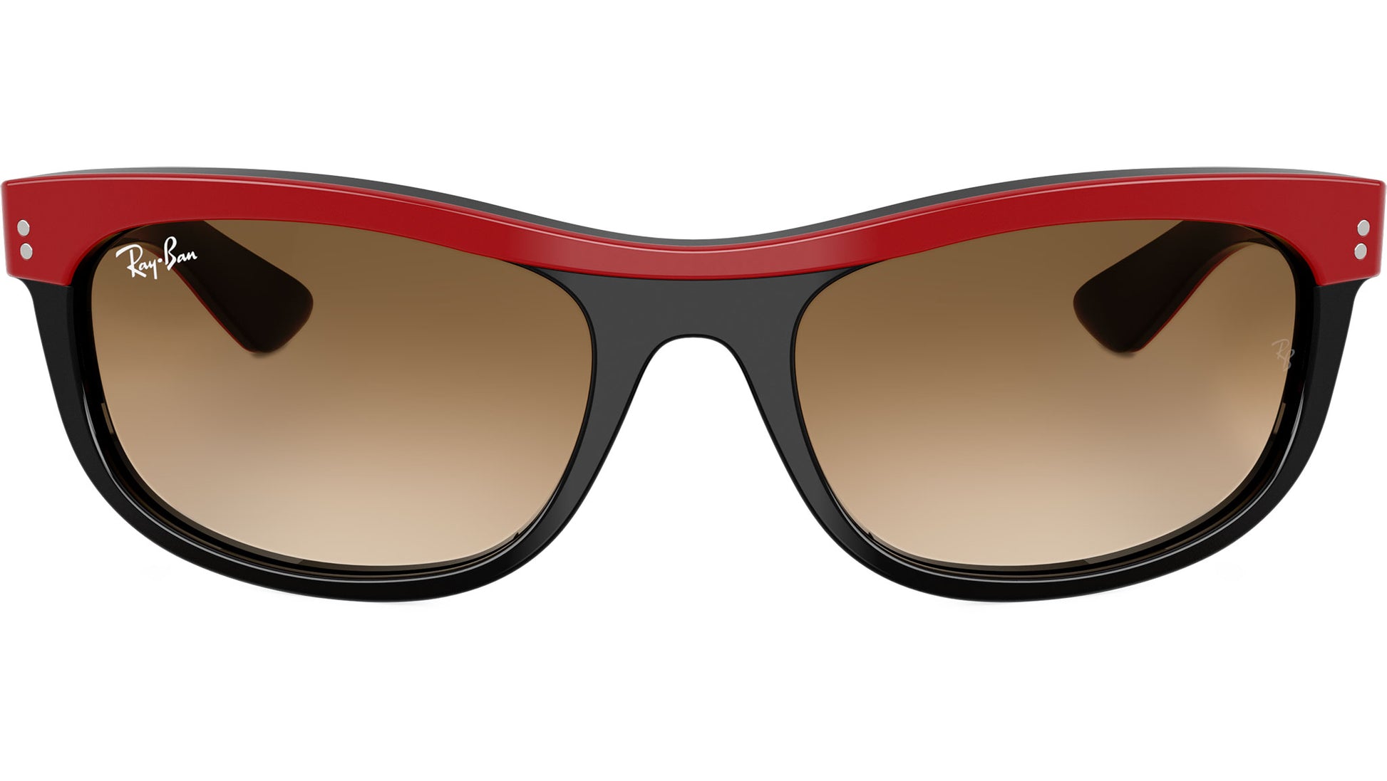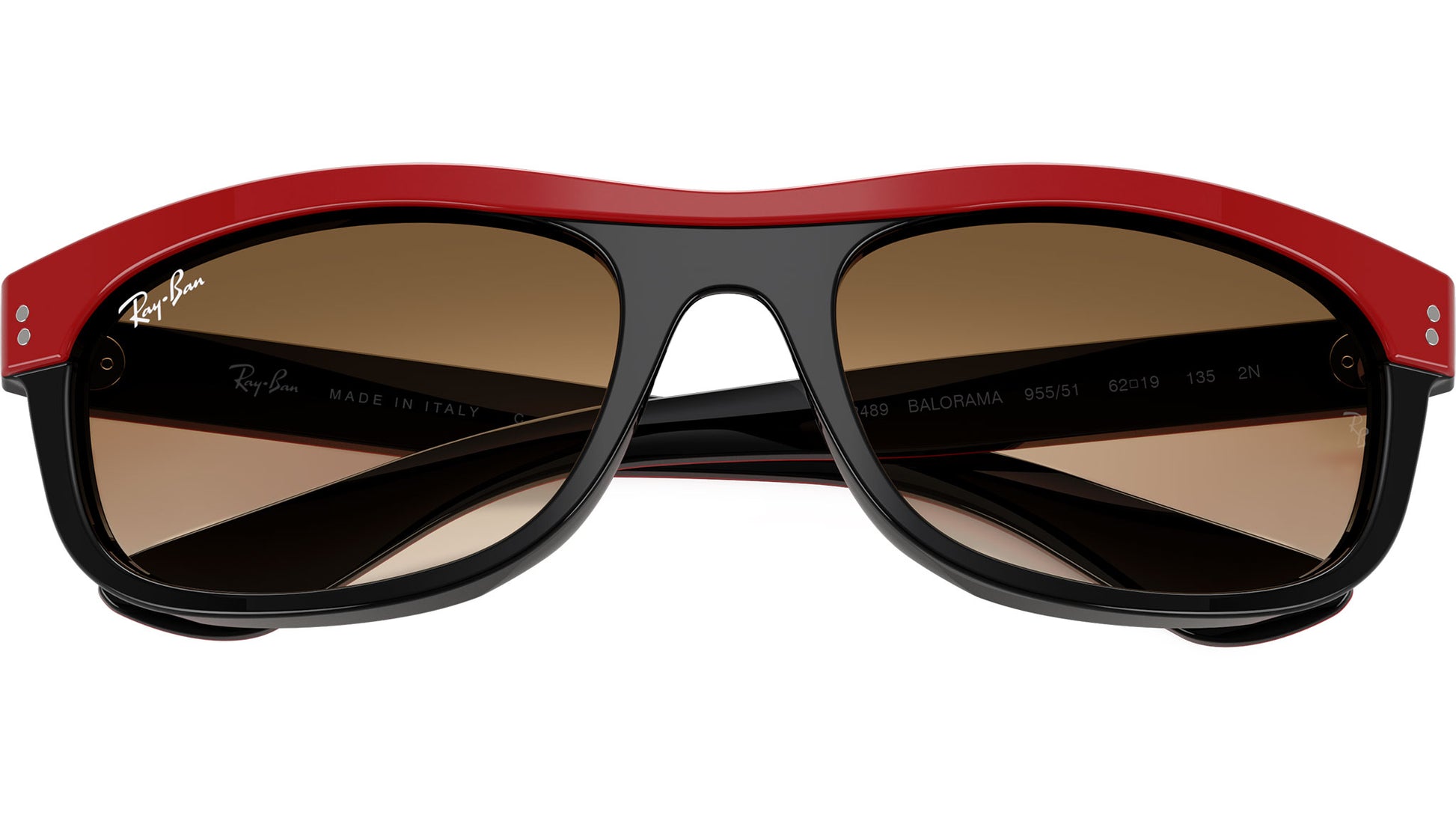 Ray-Ban Balorama RB2489 955/51 sunglasses for men and woman, featuring red on black rectangular acetate frame and clear gradient brown glass lenses. High bridge fit. Brand line: Evolution. Style code: 0RB2489. Color code: 955/51. Authorized Ray-Ban online reseller. Your glasses will include the original case and accessories and are covered by a 12-month global warranty.