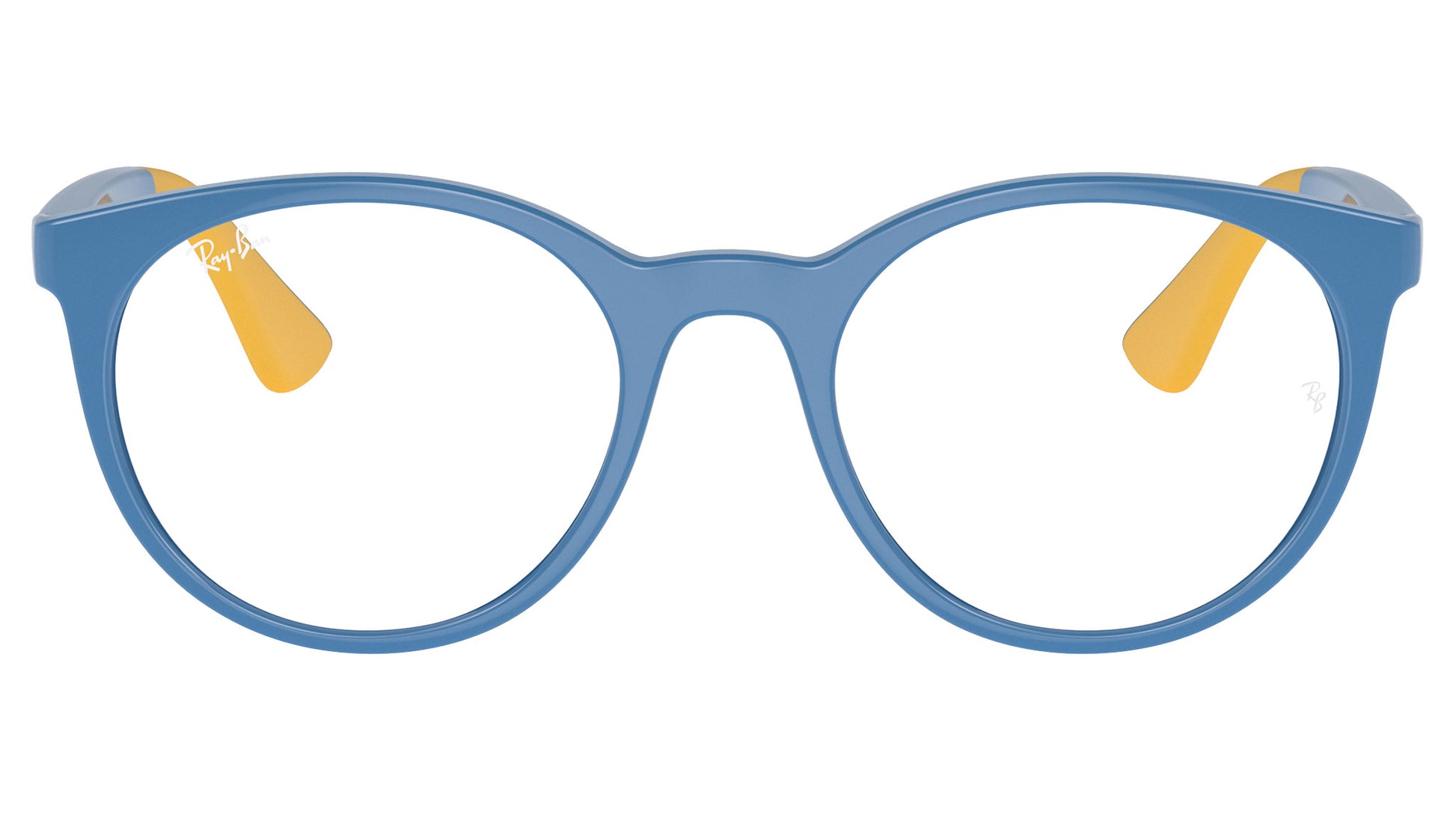 Anteojos de inyección Ray-Ban Kids RY1628 azul claro sobre amarillo, código de color 3951. Montura panthos unisex de montura completa con ajuste de puente alto y lentes de demostración. Distribuidor autorizado de Ray-Ban. Incluye estuche original.