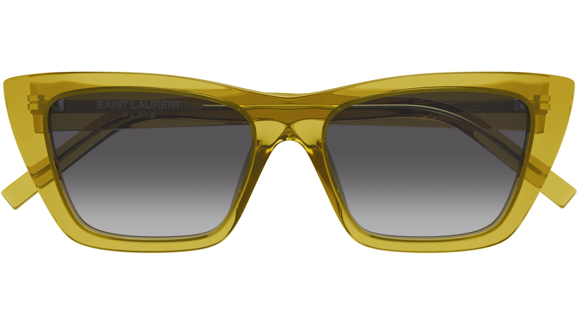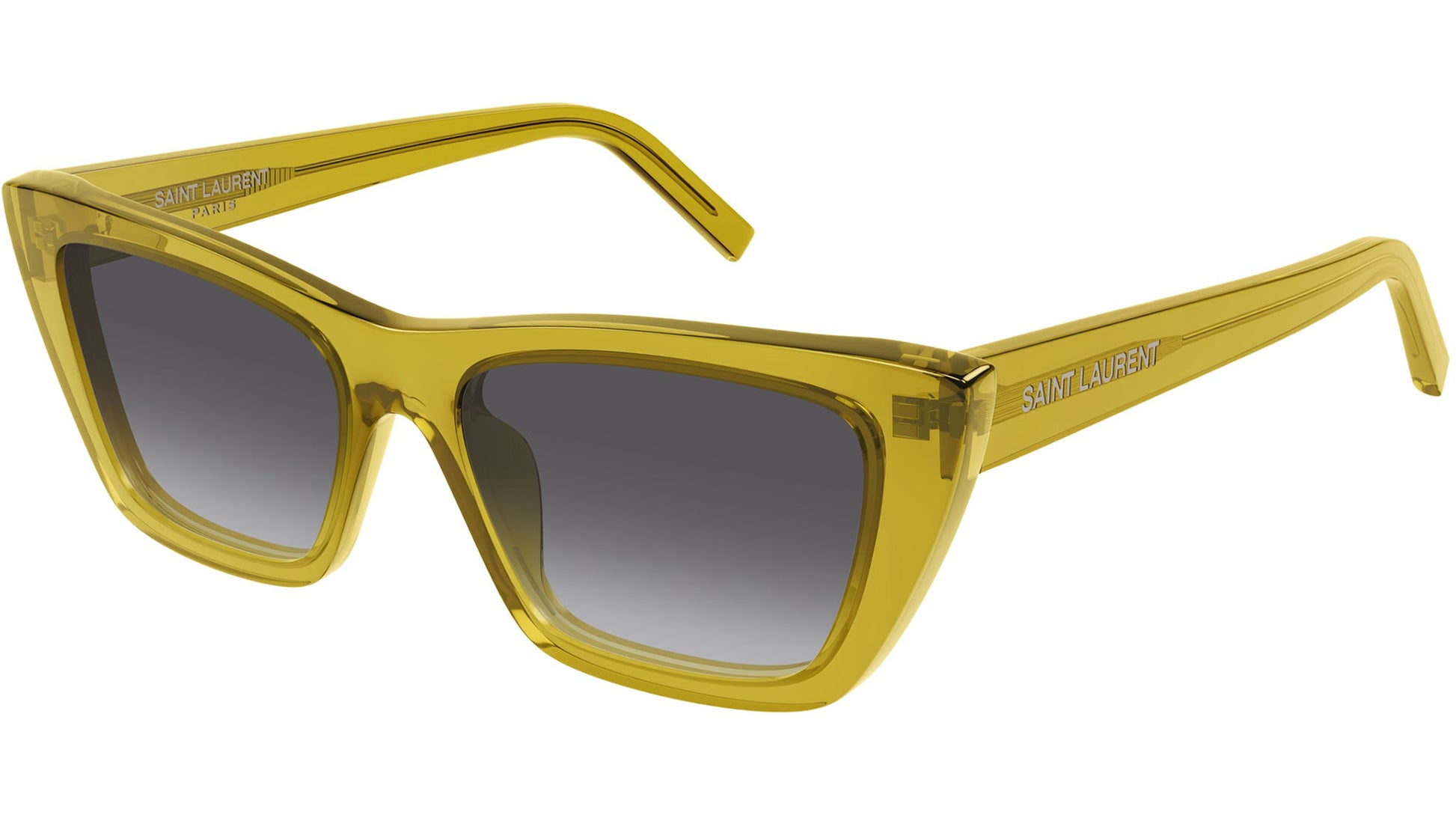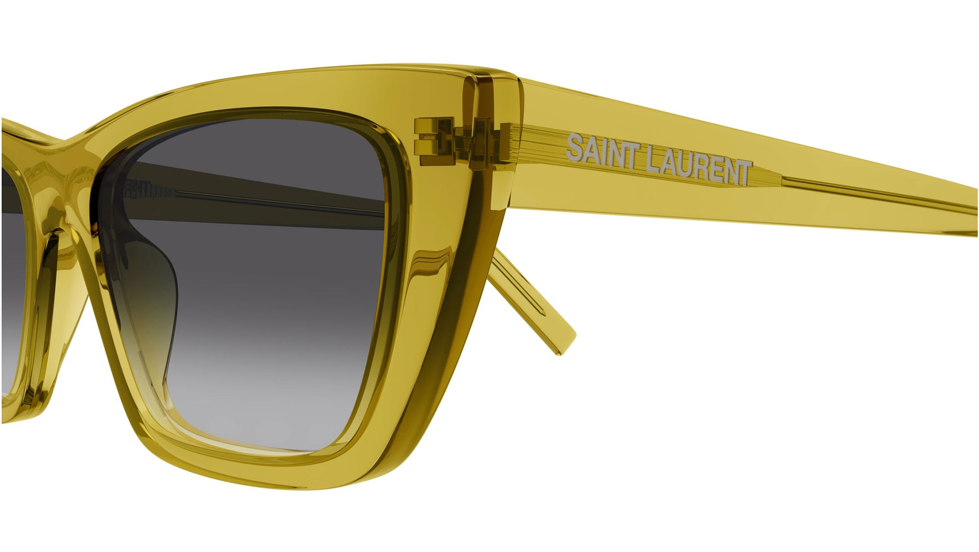Gafas de sol Saint Laurent SL 276 MICA 062 para mujer, con montura de acetato cat eye en ocra transparente brillante y lentes de nailon bio con doble degradado de negro a ahumado. Línea de marca: SL Logo. Código de estilo: SL 276 MICA. Código de color: 062. Fabricadas en Italia. Distribuidor autorizado en línea de Saint Laurent. Tus gafas incluirán el estuche y los accesorios originales y están cubiertas por una garantía global de 12 meses.