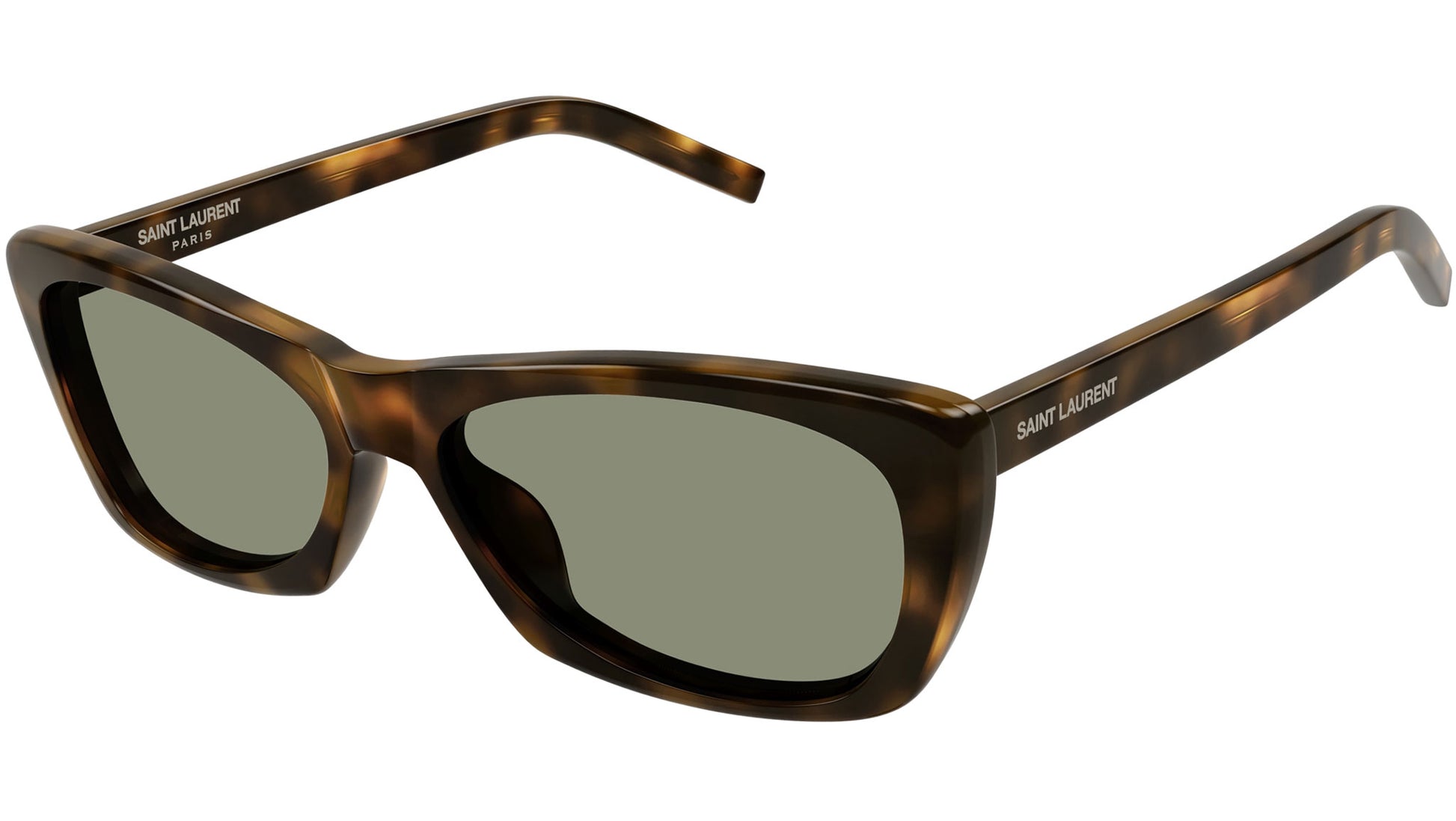 Gafas de sol Saint Laurent modelo SL 613 de la línea de gafas New Wave, código de color 003 acetato reciclado habana medio brillante, montura en forma de ojo de gato con lentes de color verde sólido.