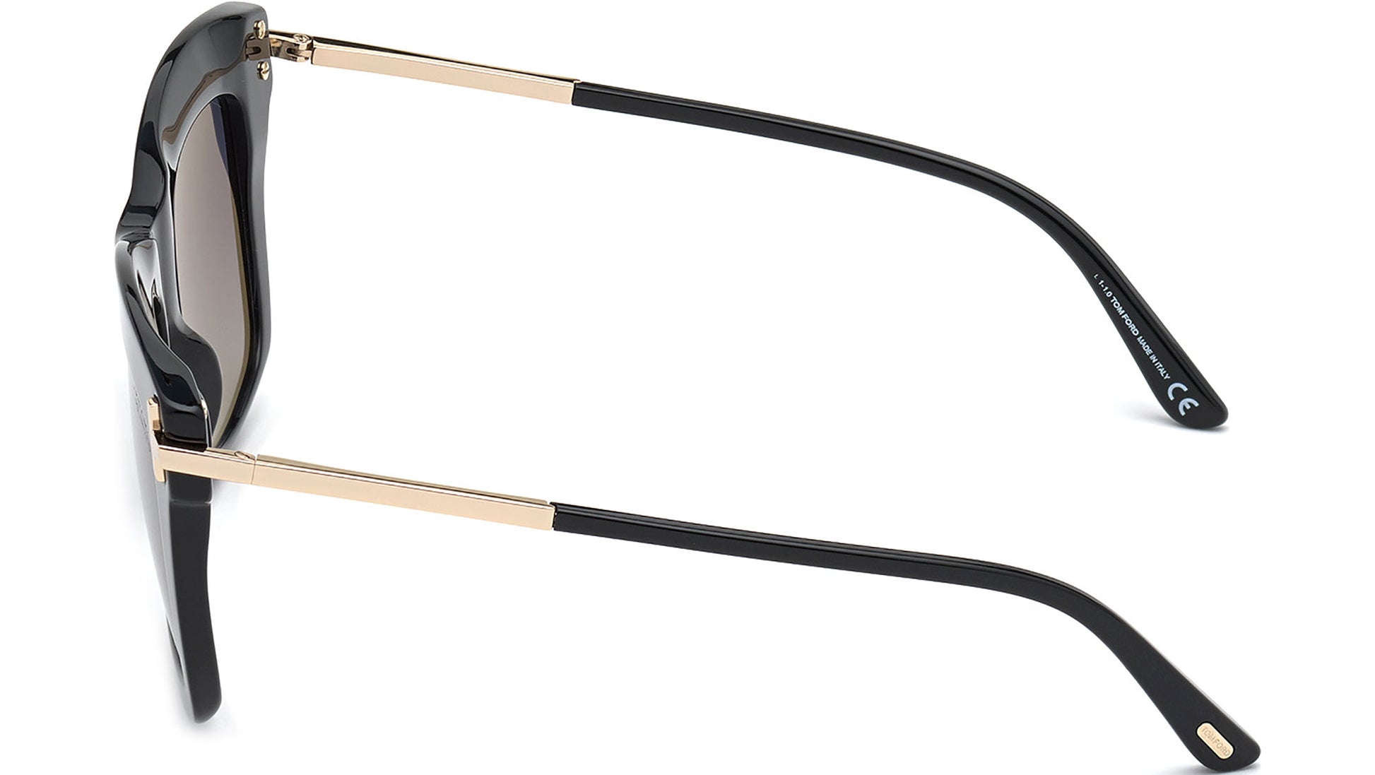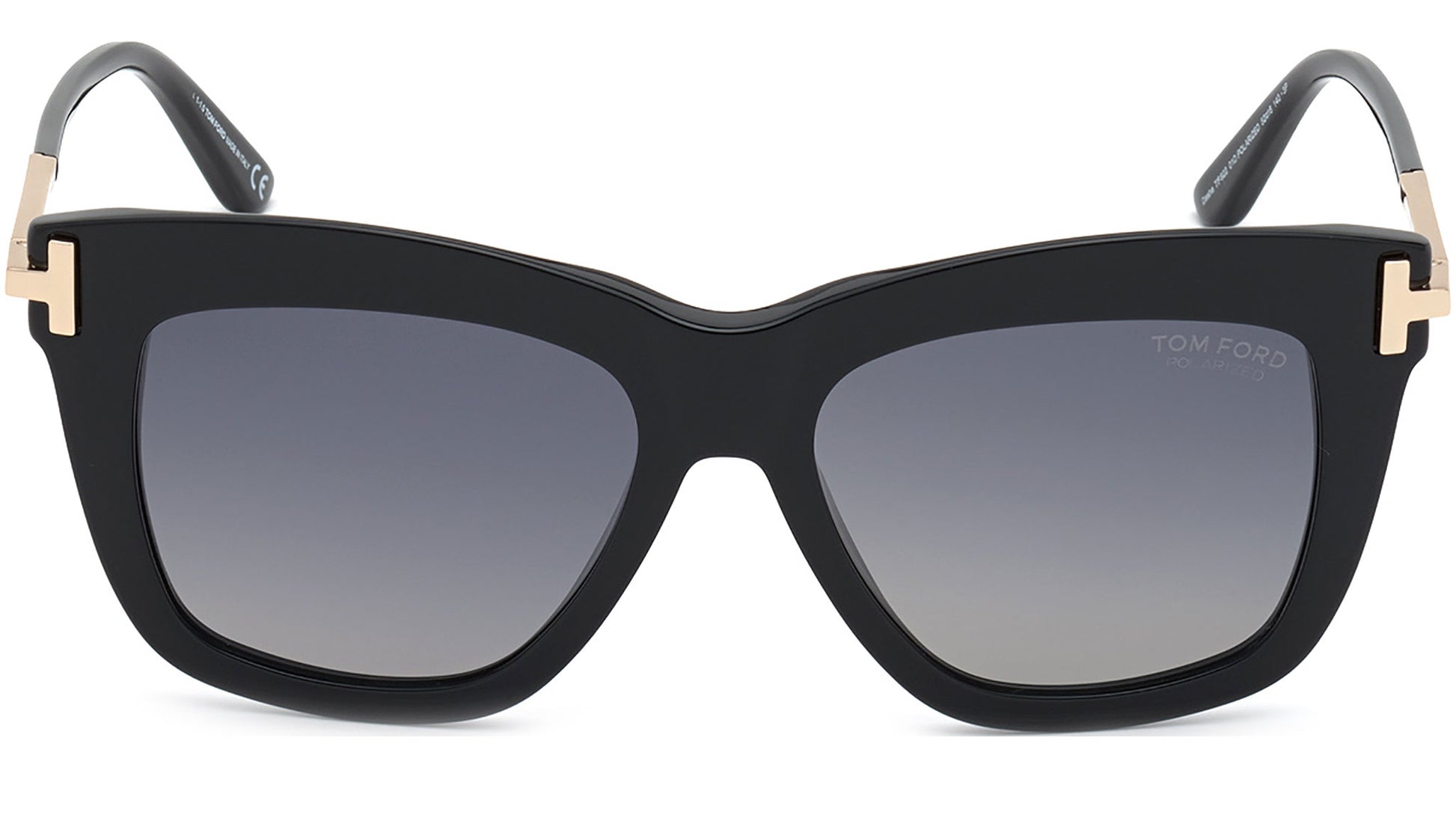 Tom Ford Dasha sunglasses model FT0822 01D featuring shiny black frame and grey polarized lens.
