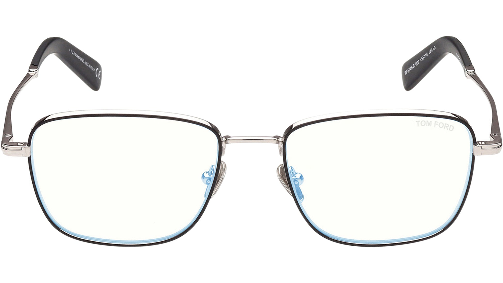 Montura de gafas Tom Ford para hombre modelo FT5748-B con montura metálica de borde completo en negro mate/plata con lentes de demostración. Línea de monturas: Gafas graduadas. Código de marca: FT5748. Código de color: 002. Distribuidor autorizado en línea de Tom Ford. Tus gafas se entregarán con el estuche y los accesorios originales y estarán cubiertas por una garantía global de 12 meses.