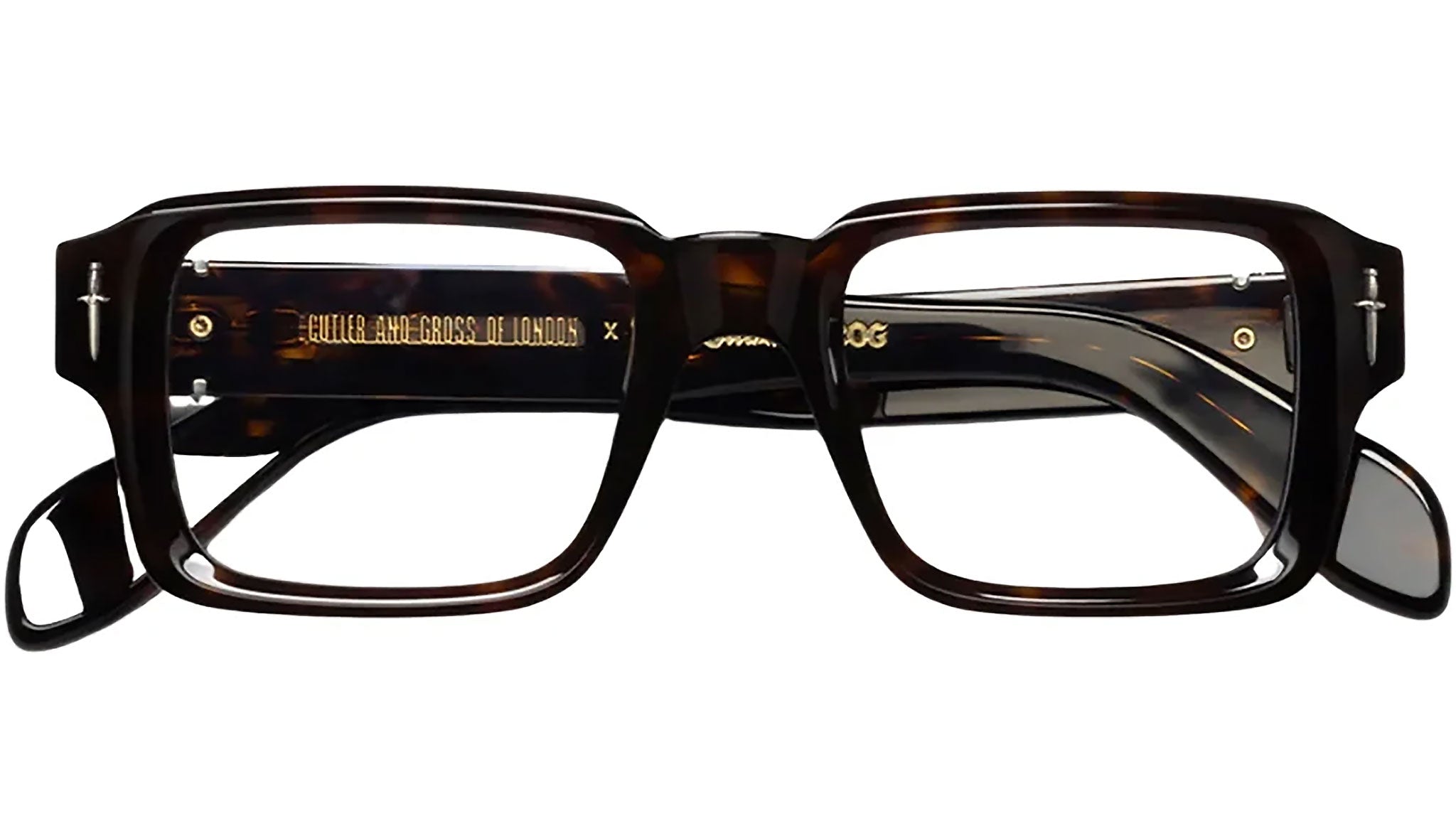 Limited to an exclusive run of 350 pieces, The Great Frog Jagger Rectangle Opticals reimagine the square silhouette through the bold, subversive lens of Cutler and Gross in collaboration with The Great Frog. Handcrafted in Italy, the frame is detailed with solid Sterling Silver dagger pins piercing the front and Flaming Heart emblems adorning the temples, embodying the collection's rebellious ethos. Sculptural bevelling enhances the frame’s structure, while plectrum temples and a Lock Down Chain core wire add both durability and distinctive edge. Finished with a gold-foil logo on the inner temples, this design stands as a testament to craftsmanship and audacious style.