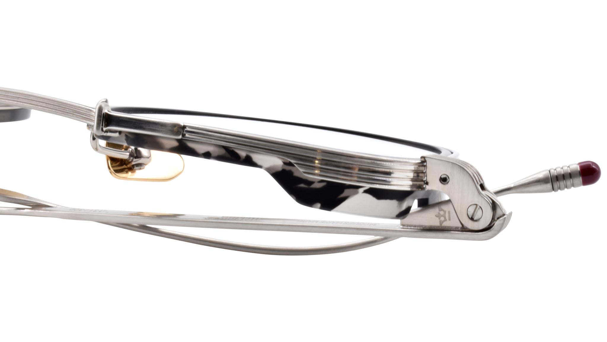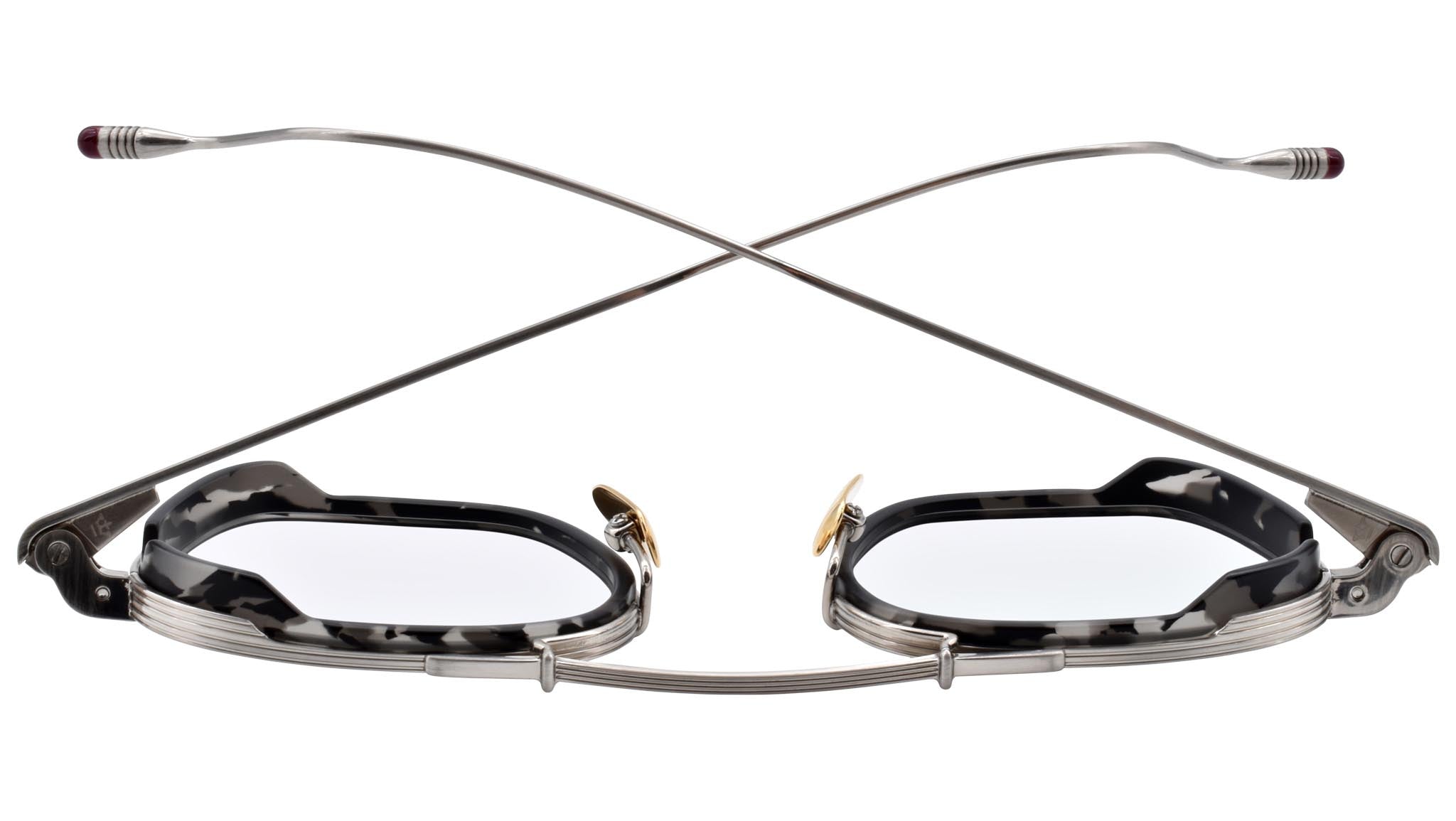 Pre-WWII lens frame with architectural details. Material: 100% Beta Titanium Silver w/ Black Tortoise Insert. Hardware: Beta Titanium. Beta titanium frame. Beta titanium temples w/ custom detail tip. Acetate lens insert. Monoblock titanium hinge construction. Custom 4mm rim wire w/ hairline detail. Custom nose pads w/ logo & hairline engraving.