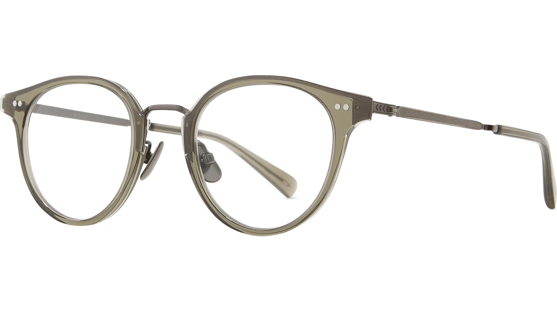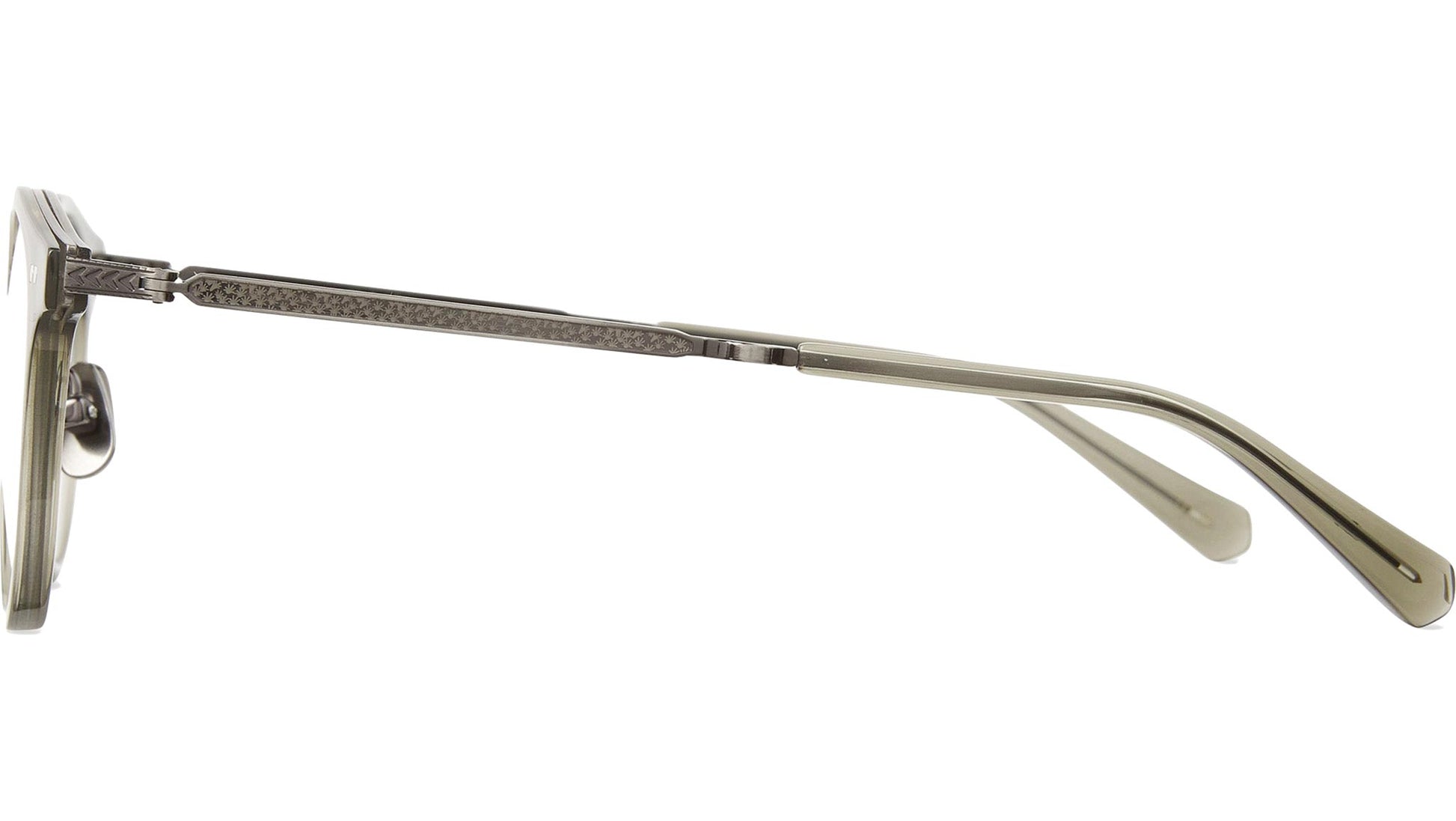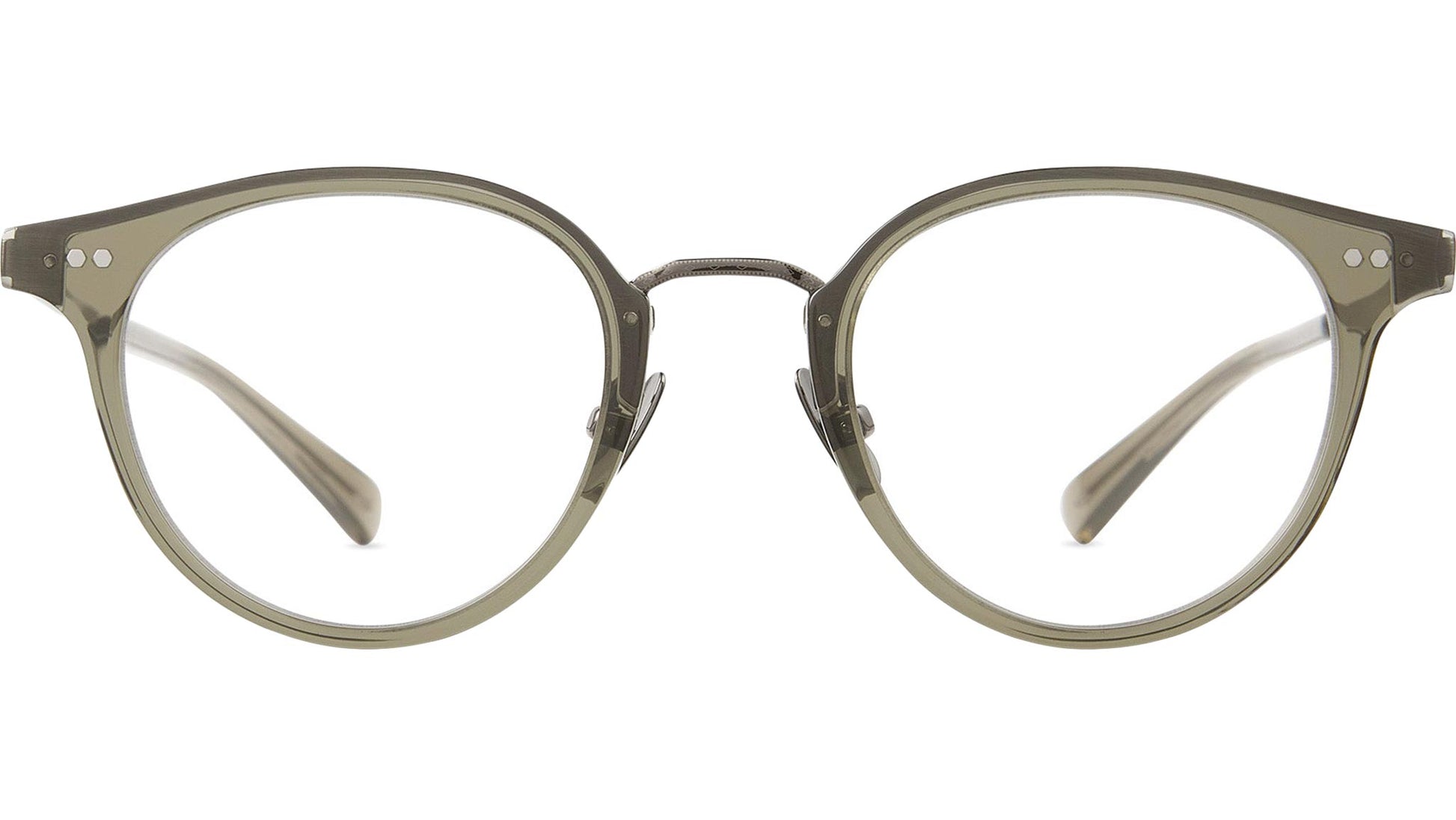 Mr. Leight Marmont Combo C glasses featuring hunter / pewter panthos acetate-titanium frame and demo lenses. The Marmont Combo C reinterprets a classic design with an innovative technical combination construction. This model features a lightweight titanium bridge and temples, complemented by a sleek metal insert that connects the bridge and end piece, showcasing a commitment to modern craftsmanship in a timeless style. Handcrafted in Japan, it is equipped with optical quality CR-39 lenses and a unique titanium temple with acetate tips. Additional specifications include a titanium bridge and nose pads, custom scattered coral core wire filigree, a 4 base lens with backside anti-reflective coating, and custom hexagon riveted pins at the front. This unisex frame is designed for both durability and comfort. Style code: ML3038. Color code: HUN-PW. Authorized Mr. Leight online reseller. Your glasses will include the original case and accessories and are covered by a 12-month global warranty.