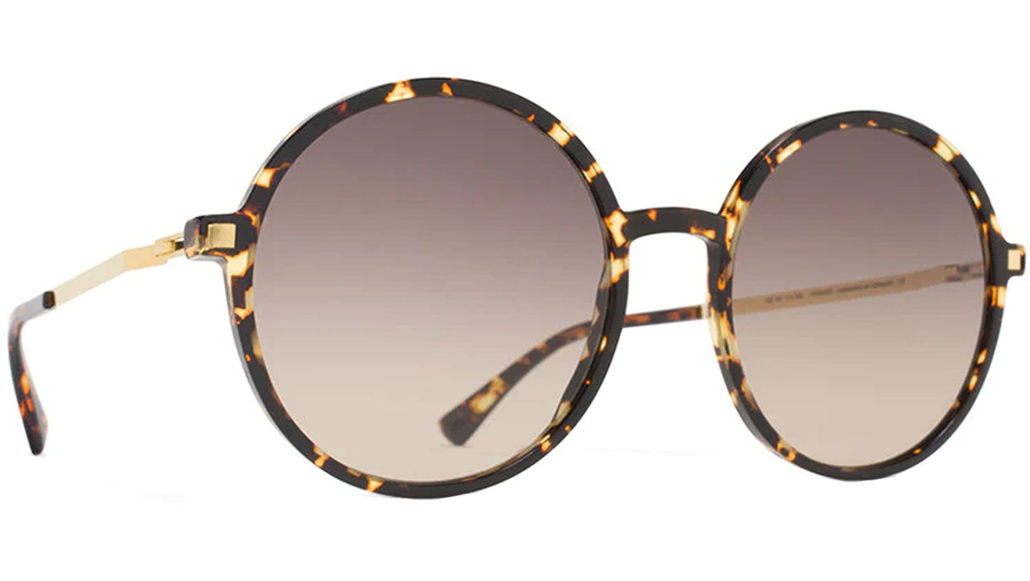 Made of lightweight stainless steel and slender acetate, ANANA in Trinidad/Glossy Gold with Brown/Brown Gradient lenses is a round shaped sunglass frame from the MYKITA LITE collection. Handcrafted in Berlin. Slender acetate frame front Patented spiral hinge Ultra-light stainless steel temples Acetate temple ends Titanium nose pads Individually adjustable Tinted sun lenses with 100% protection against UVA/UVB rays and an anti-reflective inner coating Comes with branded eyewear case and cleaning cloth