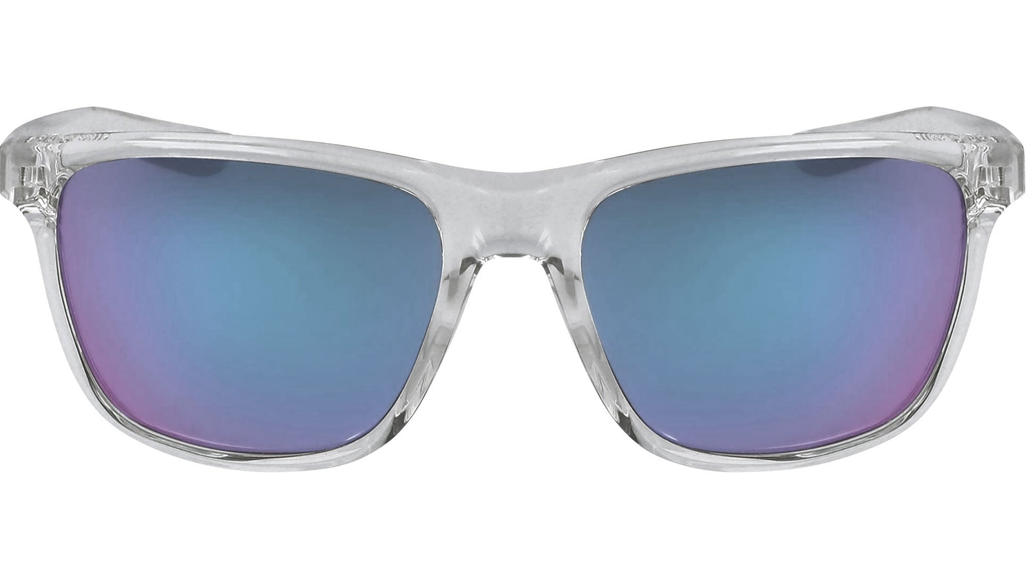 Nike Flip M line sunglasses model EV0989-933 featuring crystal clear frame and grey with teal mirror lens.