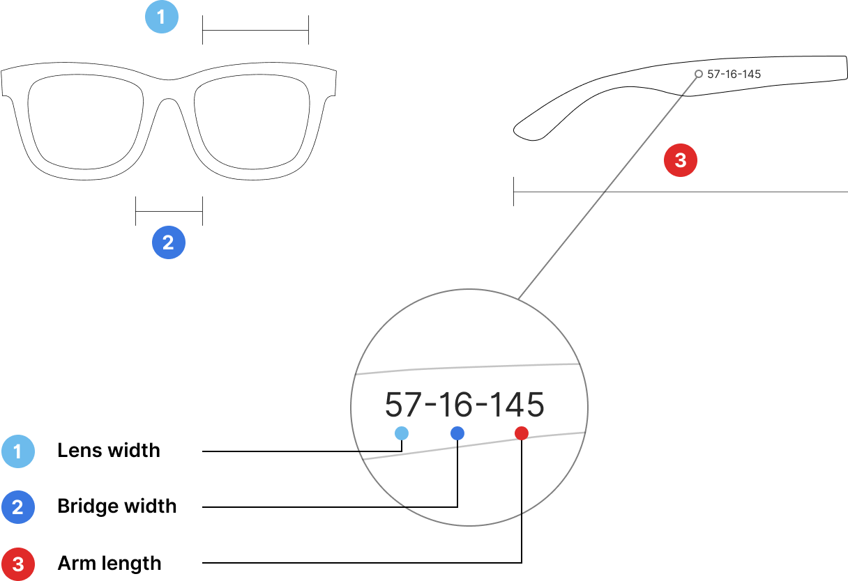 Le montature sono disponibili in diverse taglie, che si adattano a una varietà di forme del viso. Se guardi all'interno di una tua montatura, probabilmente noterai indicati due o tre numeri.