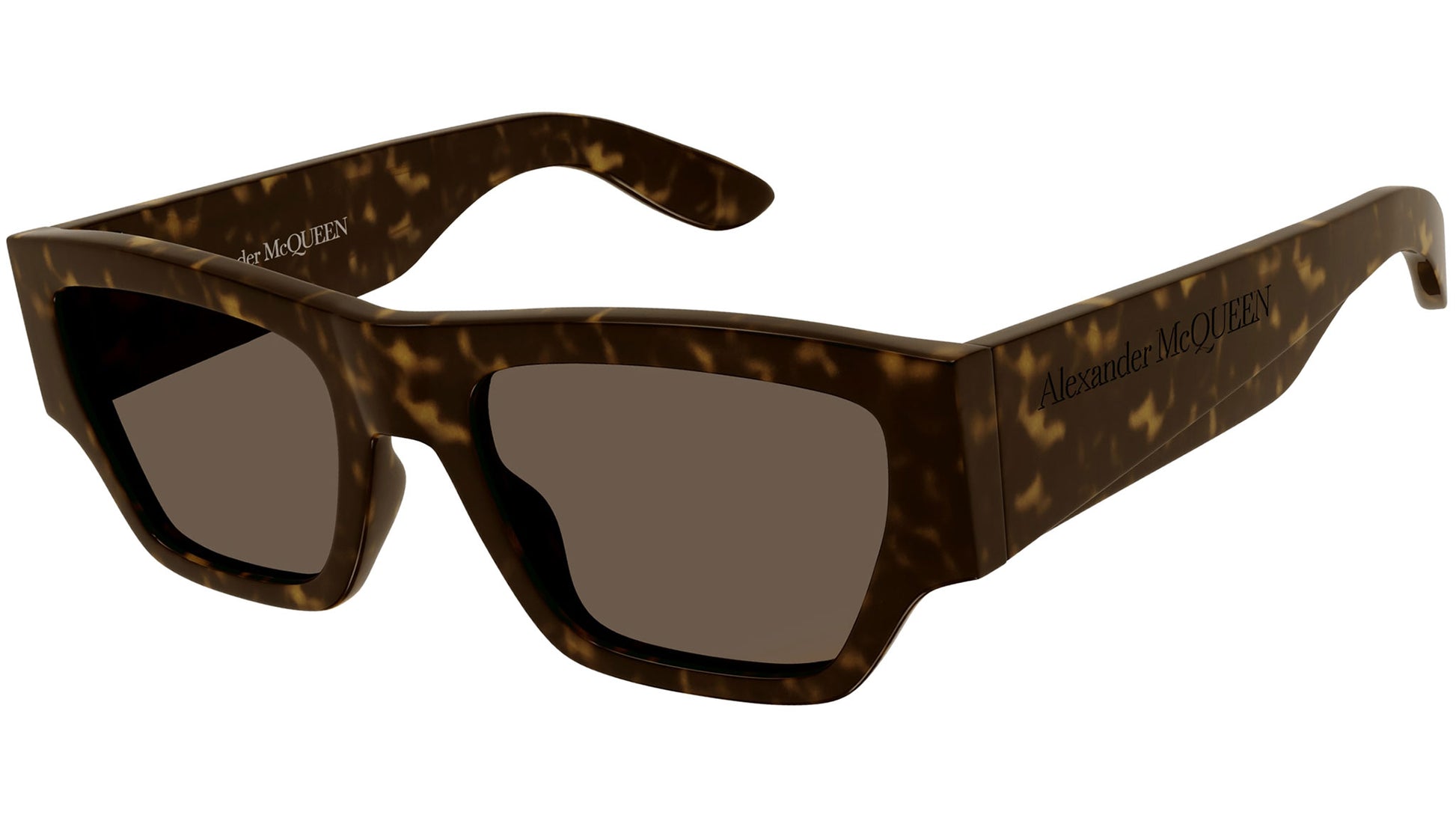 Occhiali da sole Alexander McQueen linea Casual Lines modello AM0393S variante colore 002 tartaruga scuro lucido con lenti color marrone tinta unita.